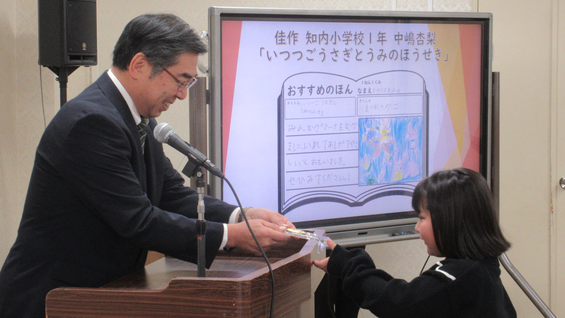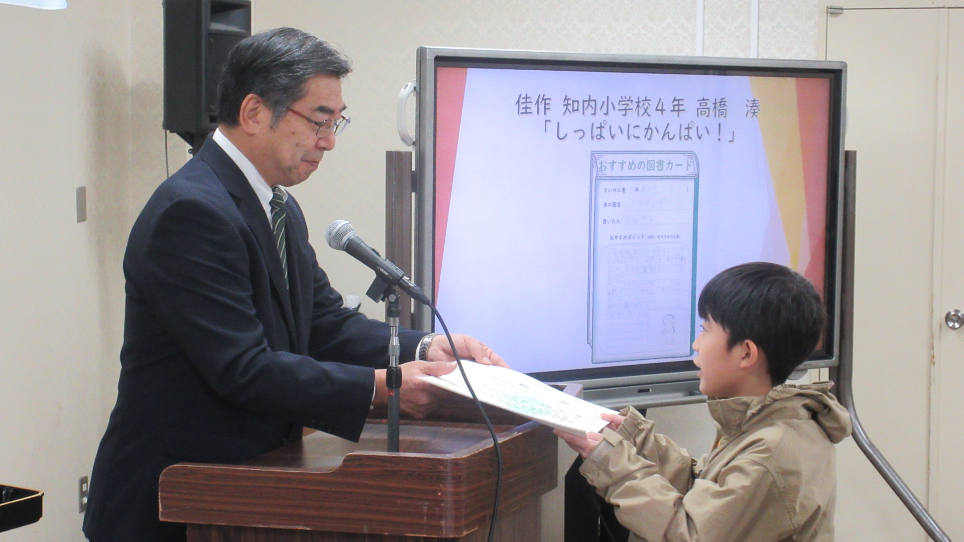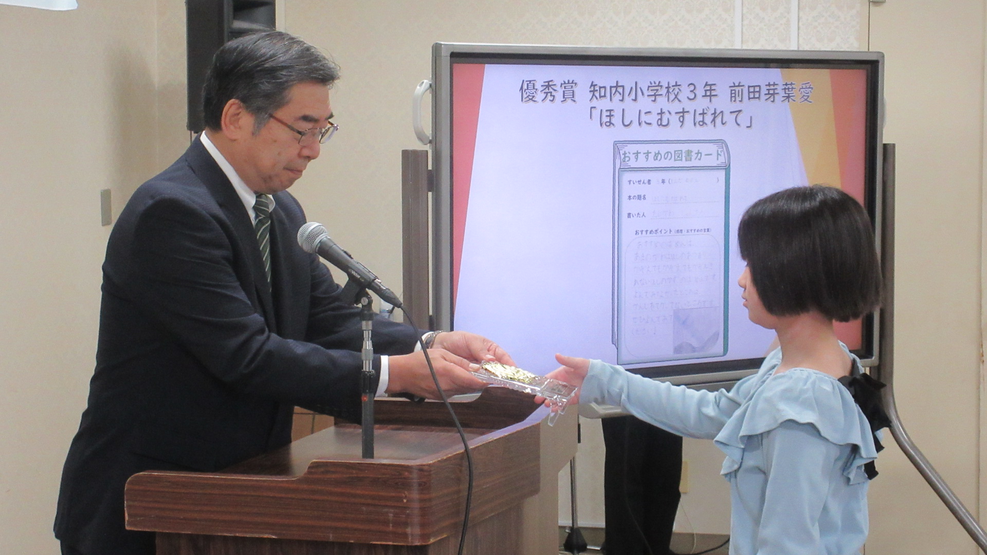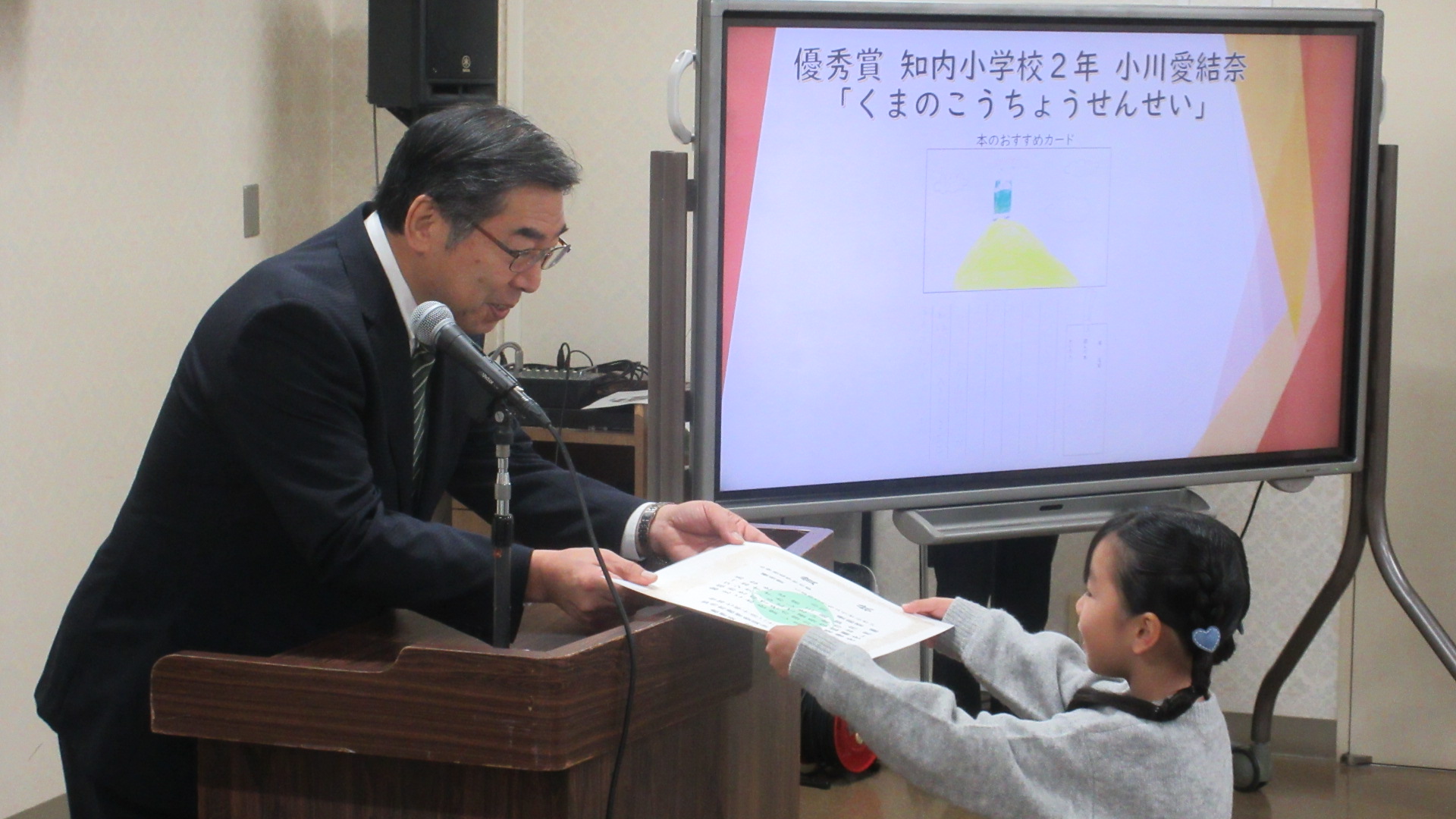 「おすすめした町の本」コンクールの表彰式が、町文化祭1日目に行われました。本を読むことが好きになれるよう、今年で3年目のコンクールになります。審査の結果、選ばれた子に表彰状と記念の盾が教育長から贈られました。