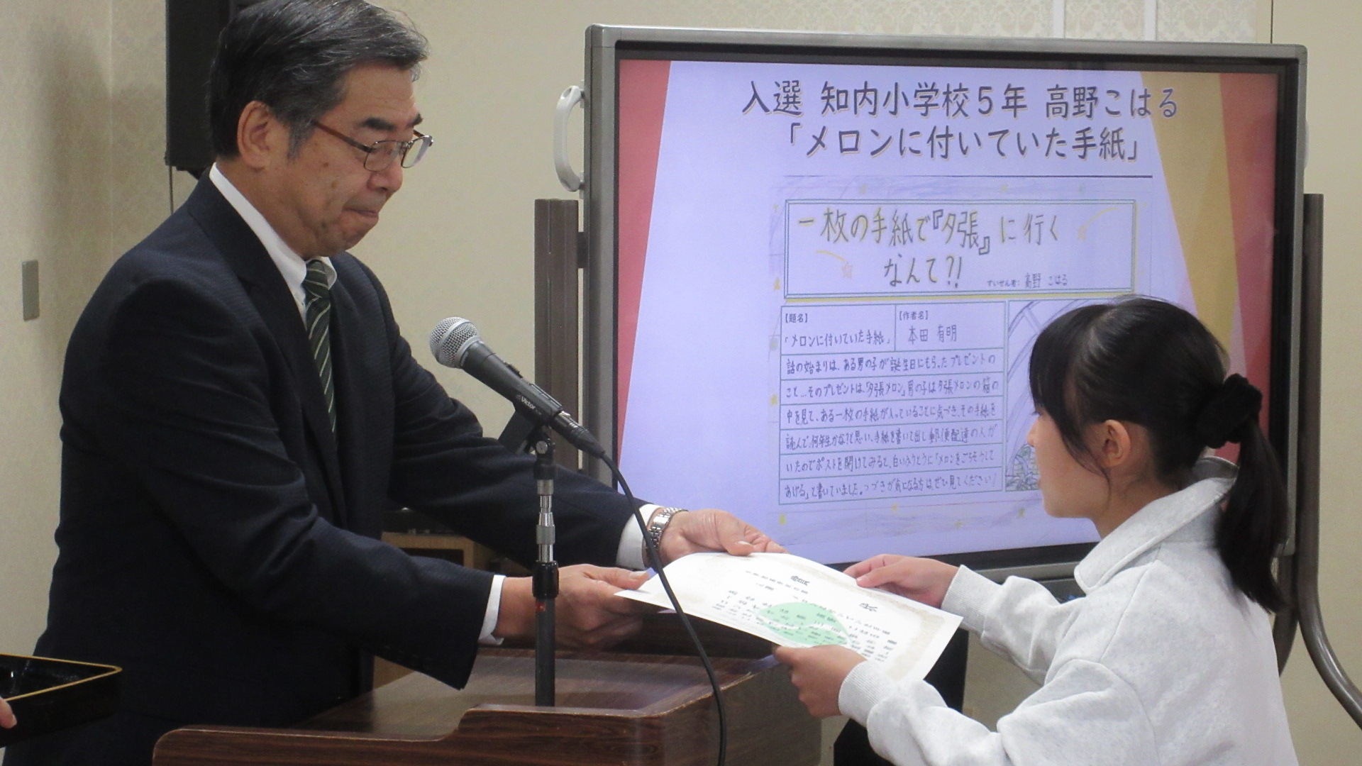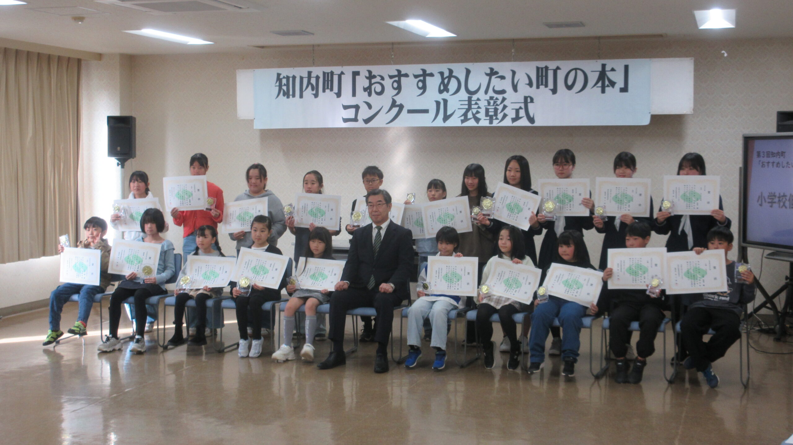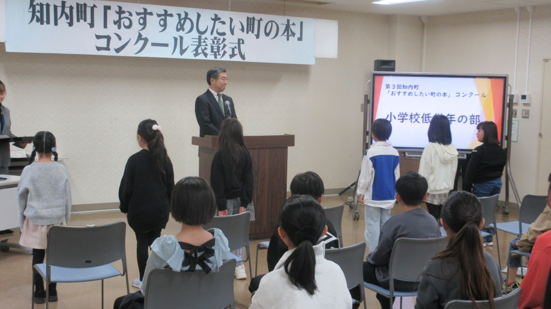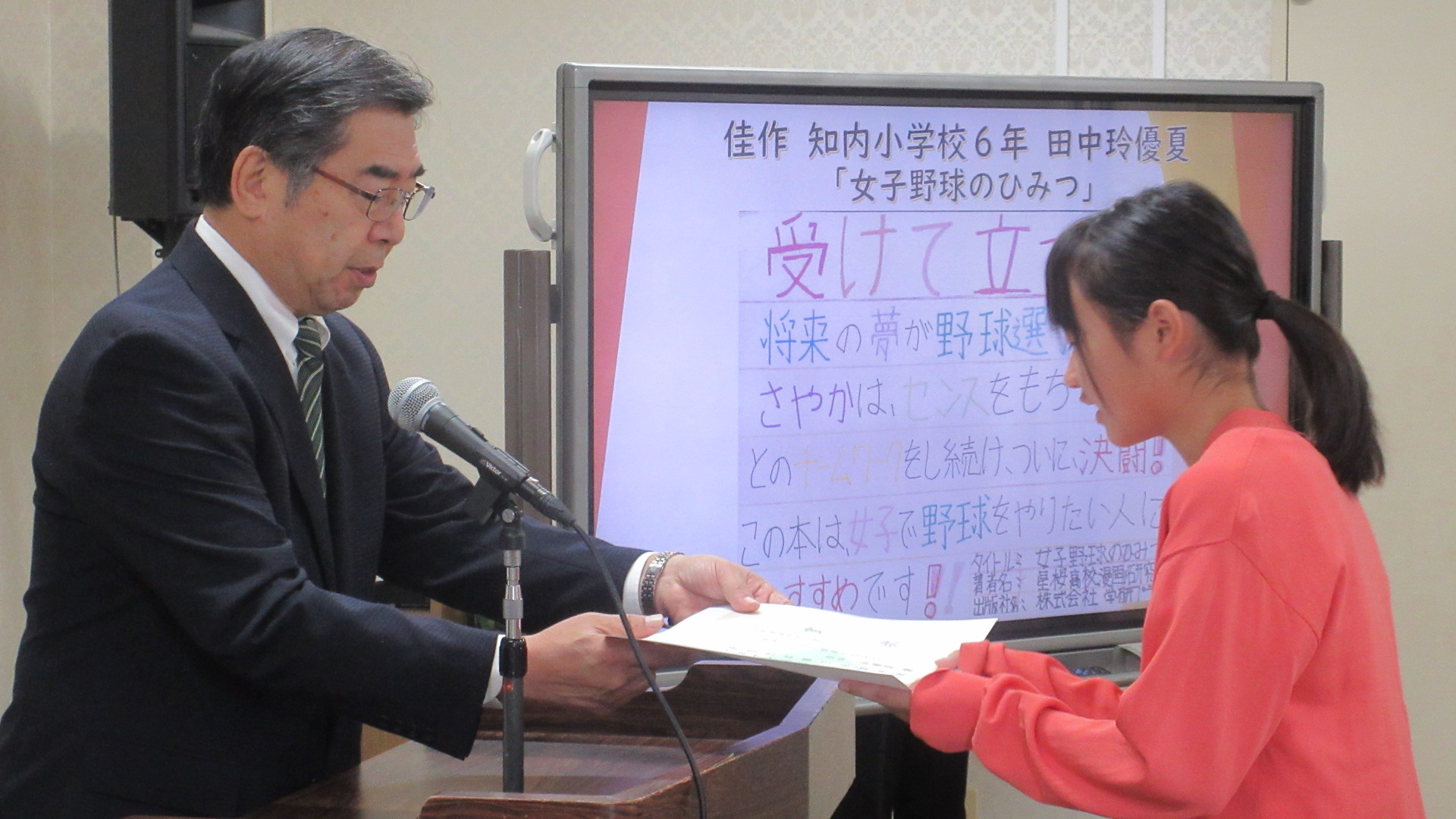 「おすすめした町の本」コンクールの表彰式が、町文化祭1日目に行われました。本を読むことが好きになれるよう、今年で3年目のコンクールになります。審査の結果、選ばれた子に表彰状と記念の盾が教育長から贈られました。