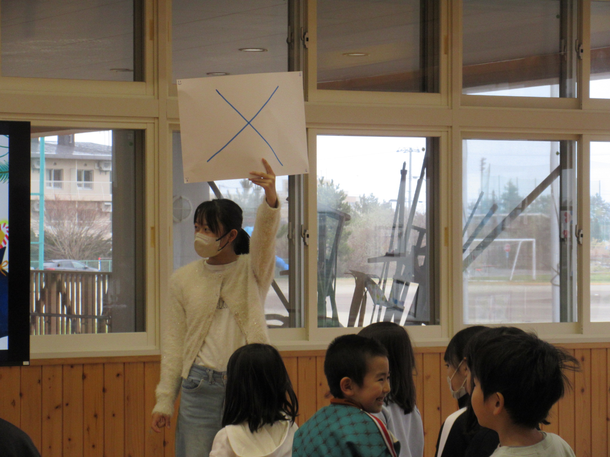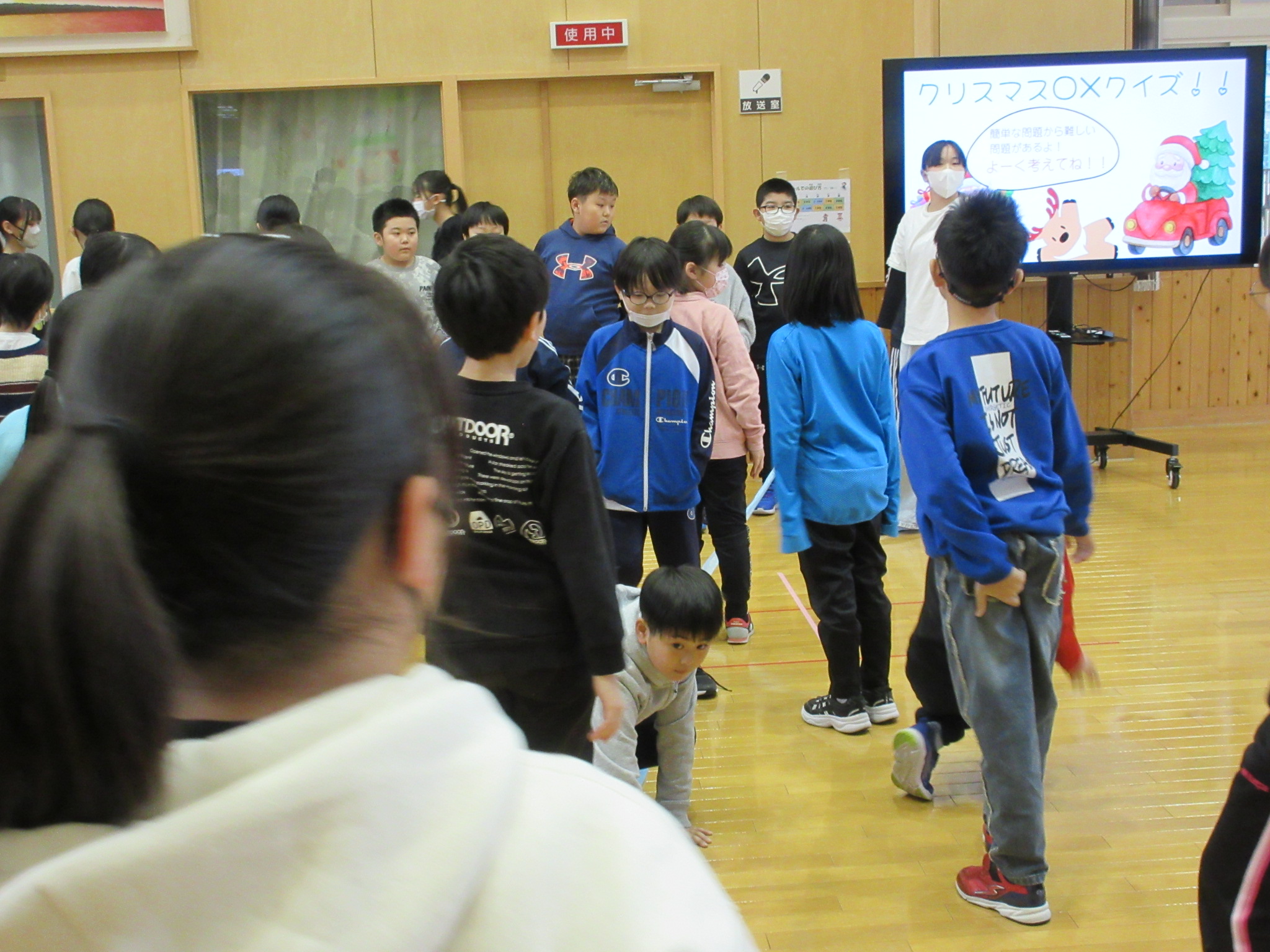 ○×クイズでは、「クリスマスにガチョウを食べていた。」「サンタさんの服の色は緑である。」など1年生でもわかるような問題も出していました。1問あたるたびに、「やったー!」の歓声が上がりました。