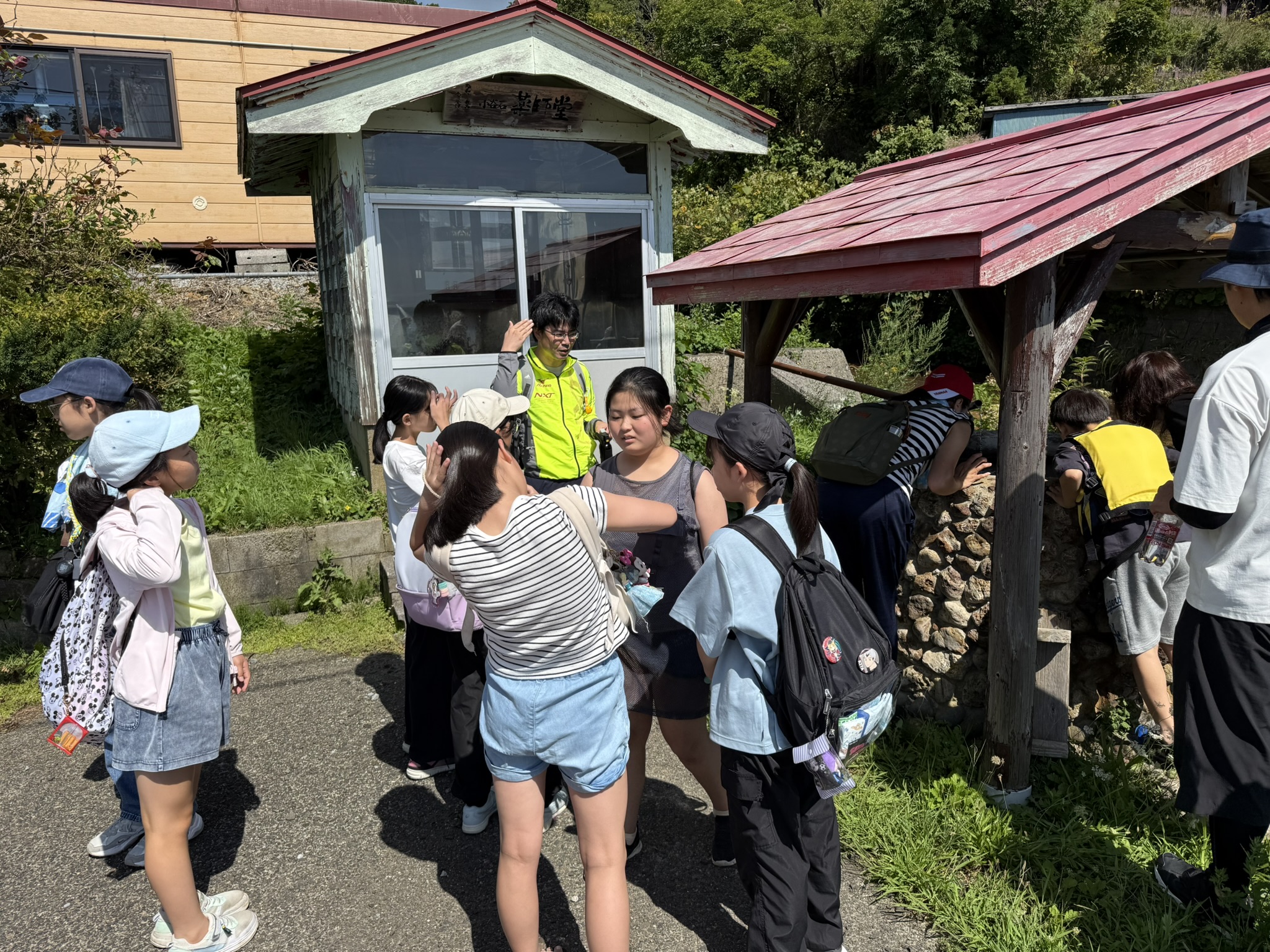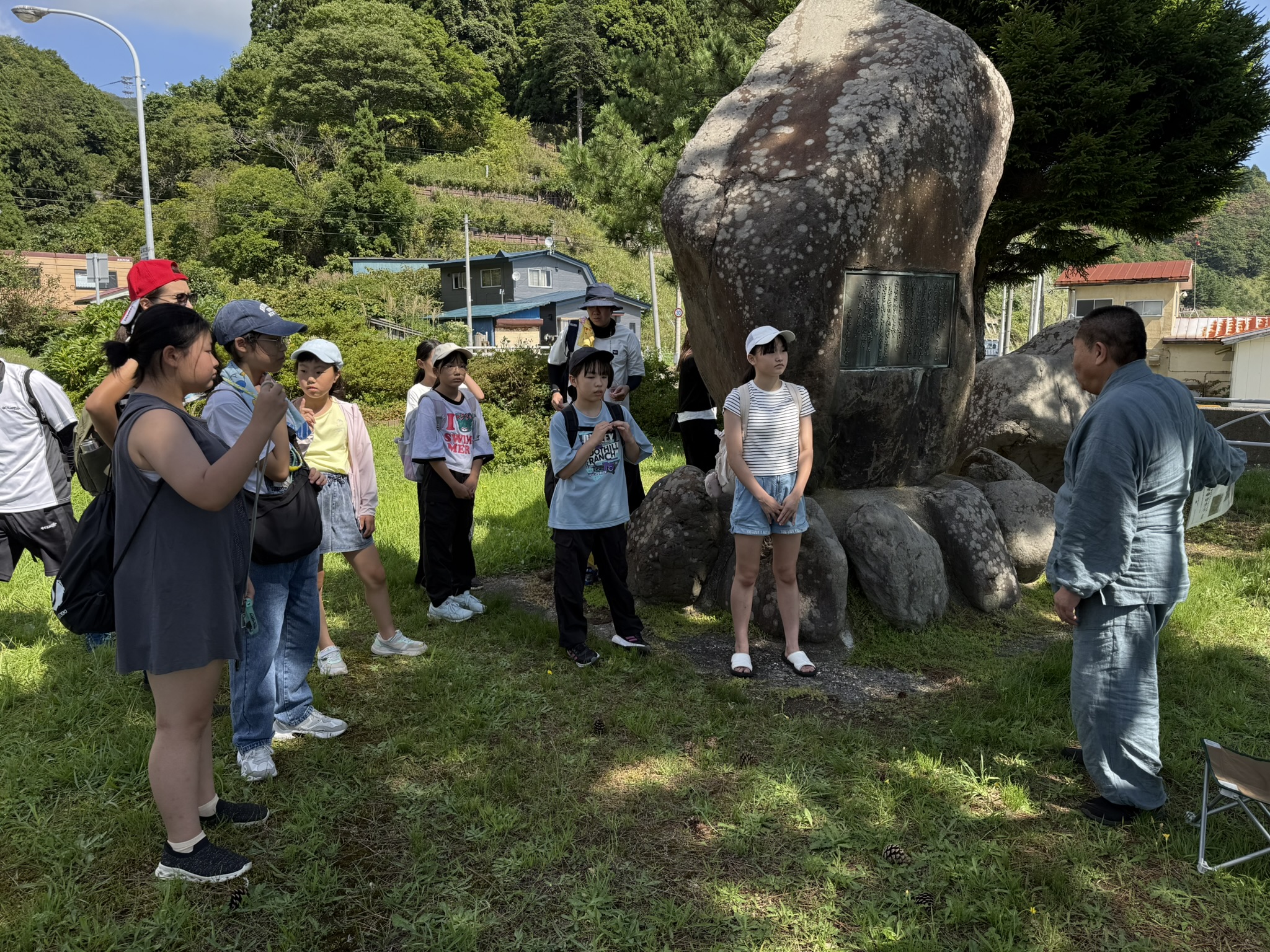 この岬が「矢越」といわれる由縁と、小谷石地区の大災害と復興を祈念した碑を前に、地元の寺院の住職様より説明を受けています。この後、矢越山荘で昔遊びやお絵描きをして帰路につきました。