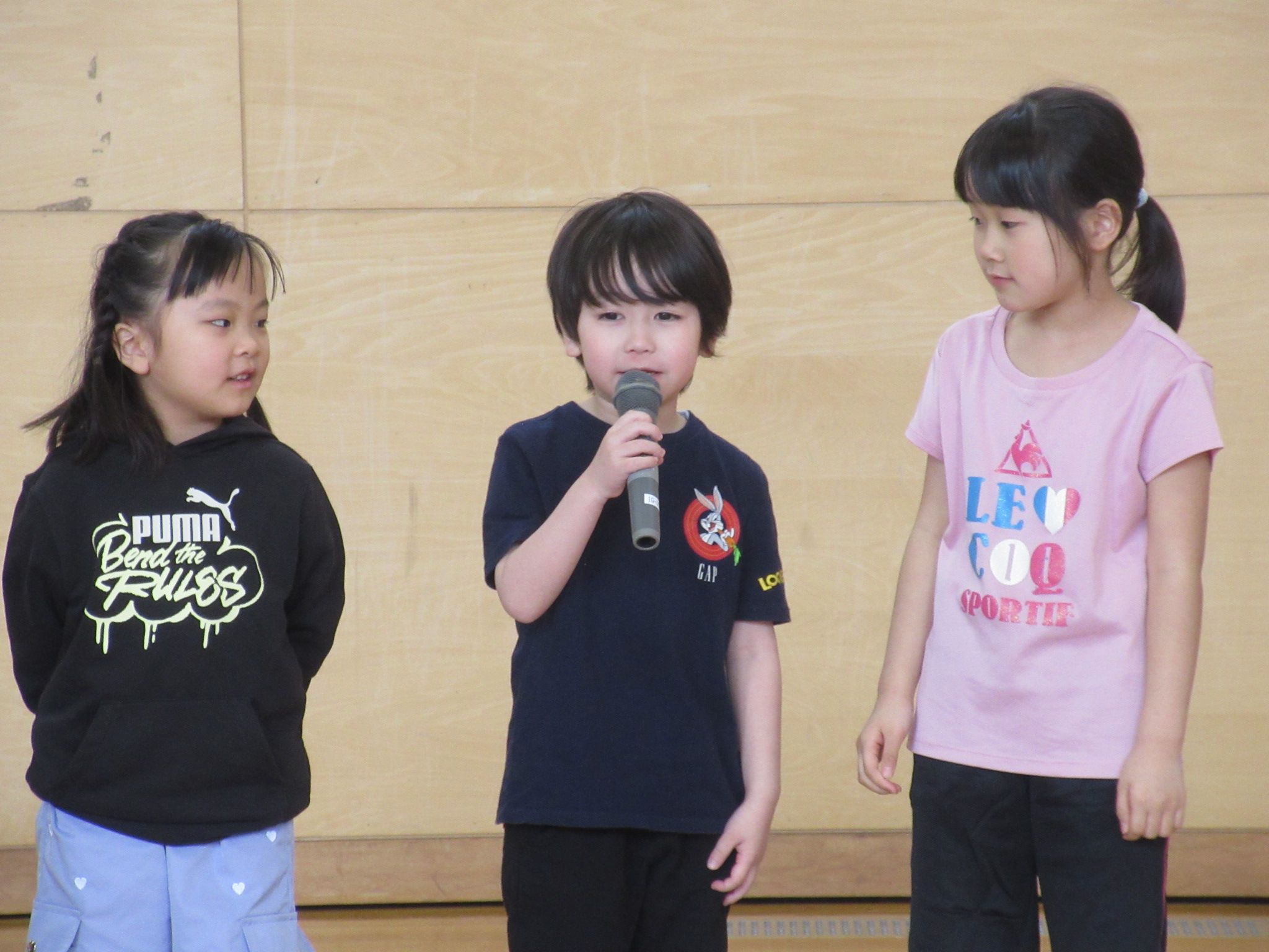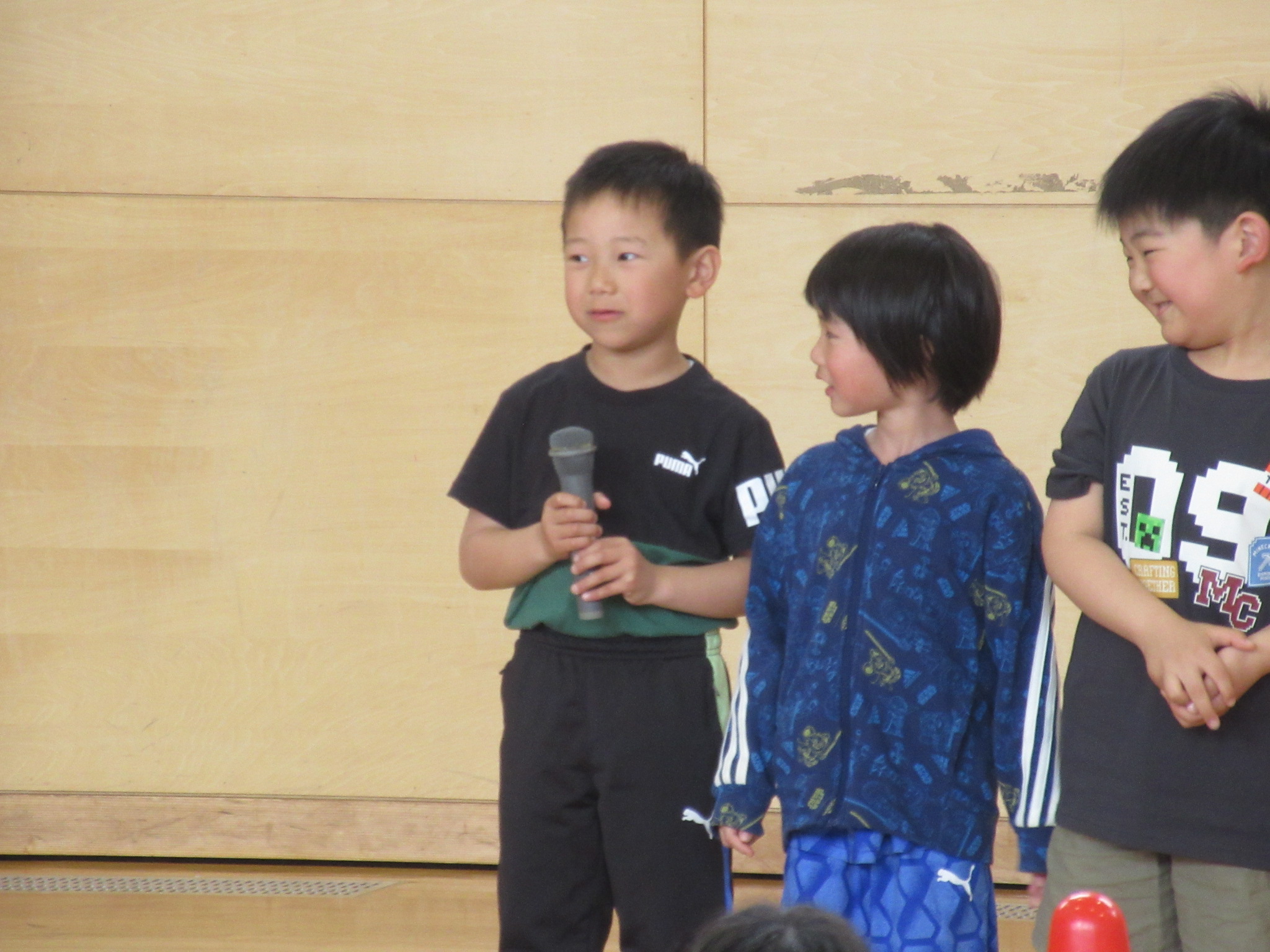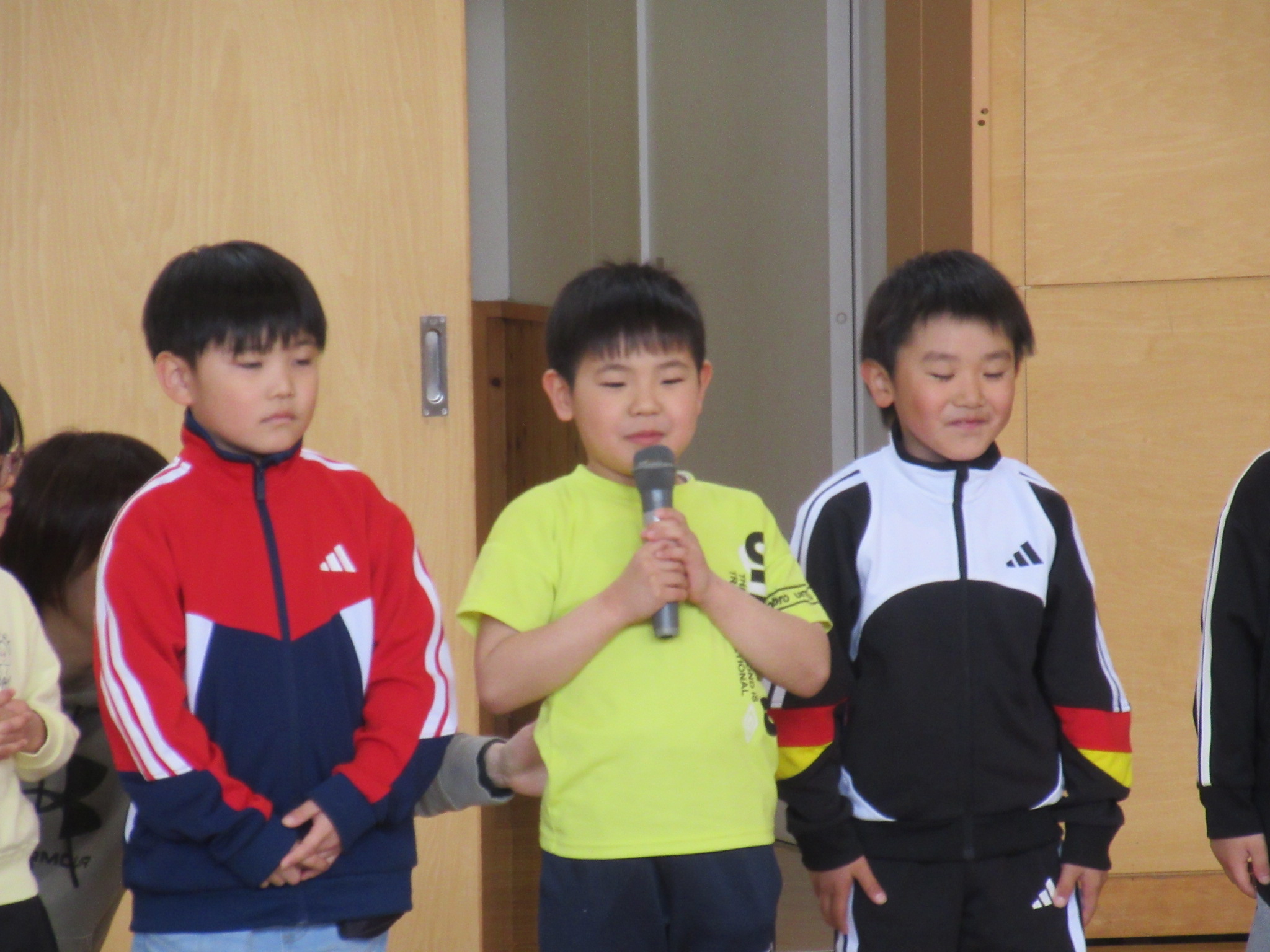 まず、はじめに1年生が自己紹介をしました。全員、はっきりとした声で「○○○◎です。どうぞよろしくお願いします。」と自己紹介ができました。