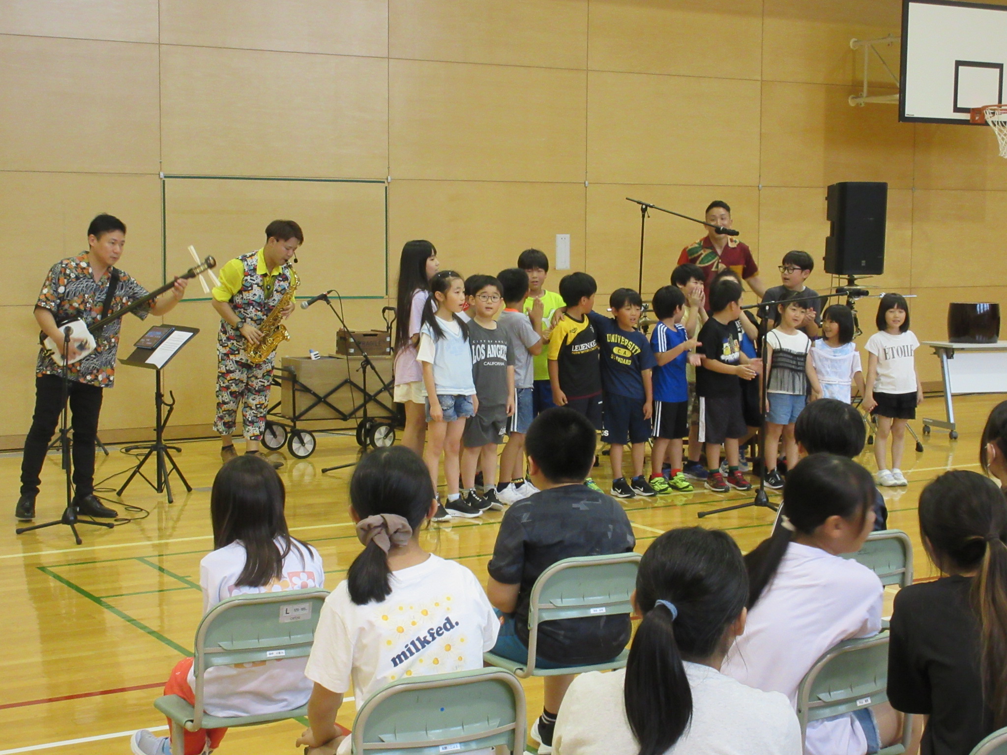 途中、和太鼓と三味線の体験コーナーがあり、2・4・6年生の代表児童と坂本先生が三味線体験をしました。