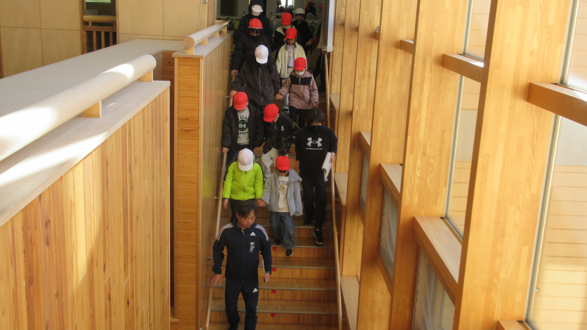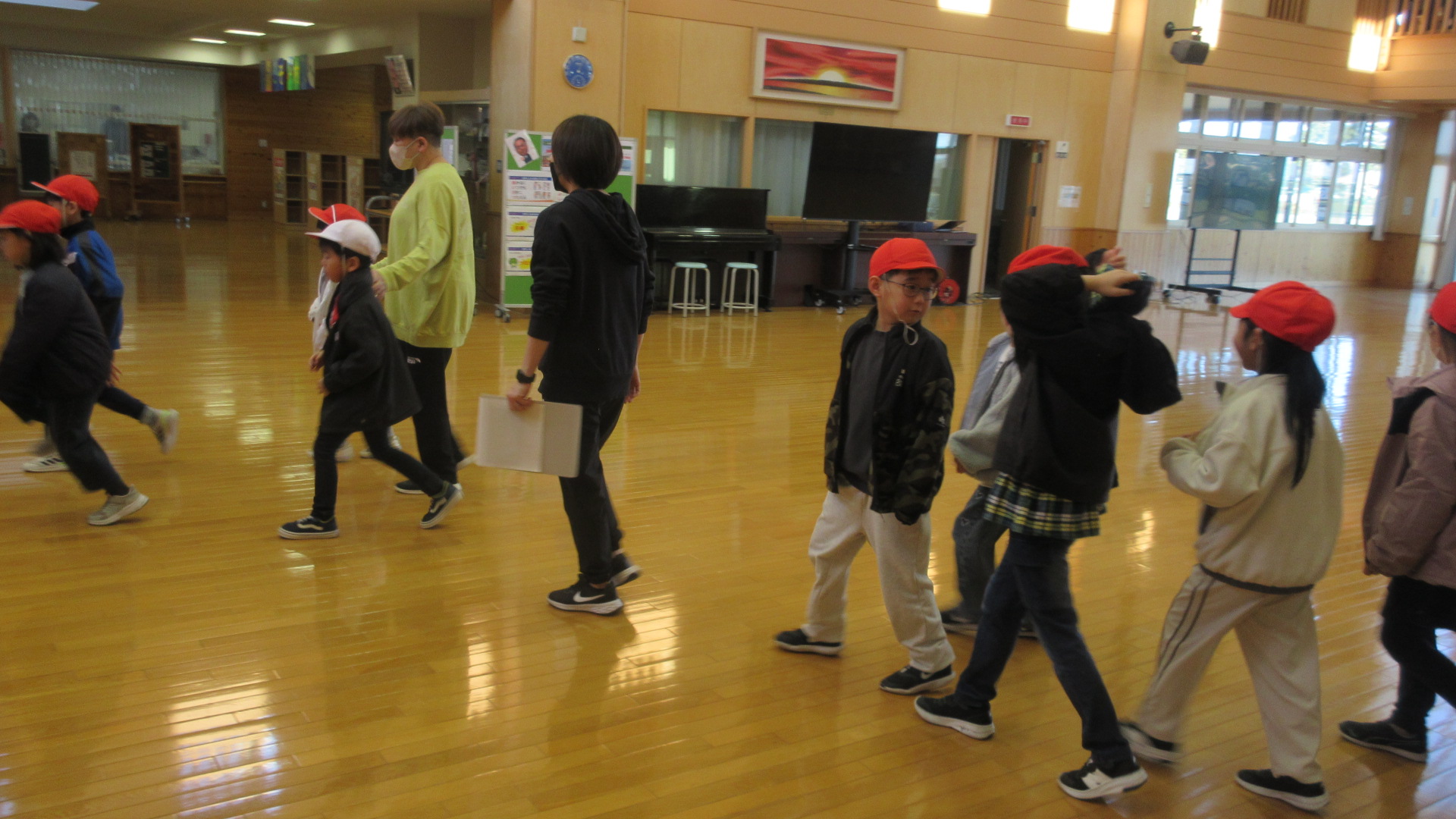 避難口を確認して、1階ホールに集まり、地震と津波の避難行動について確認をしました。みんな「おはしも」を守って上手に避難ができました。