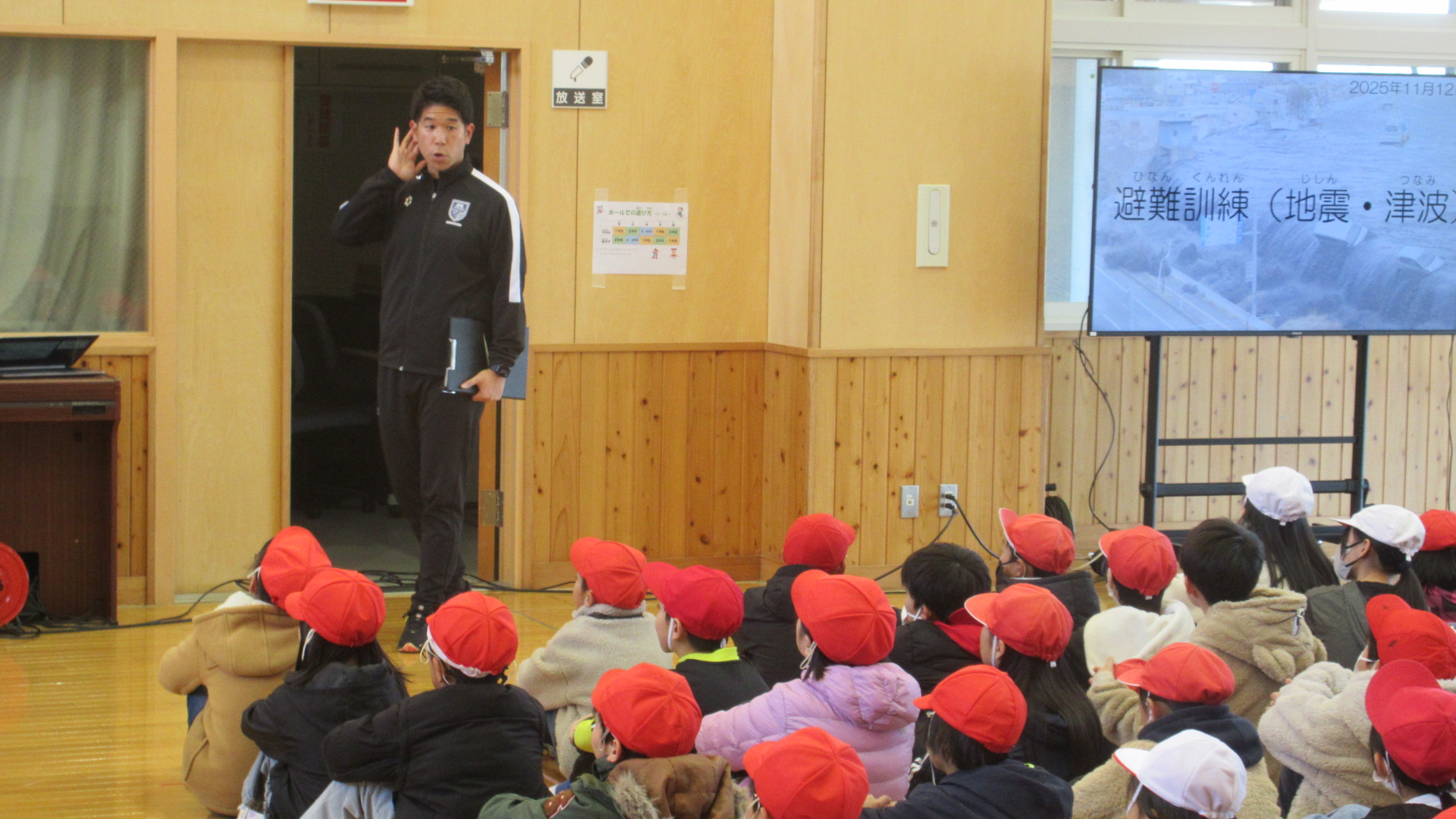 避難訓練では、地震発生⇒身を守る行動⇒垂直避難(津波注意報)⇒中学校へ避難(大津波警報)で行いました。現在クマ注意報のため、外に出ての避難訓練は実施しませんでした。