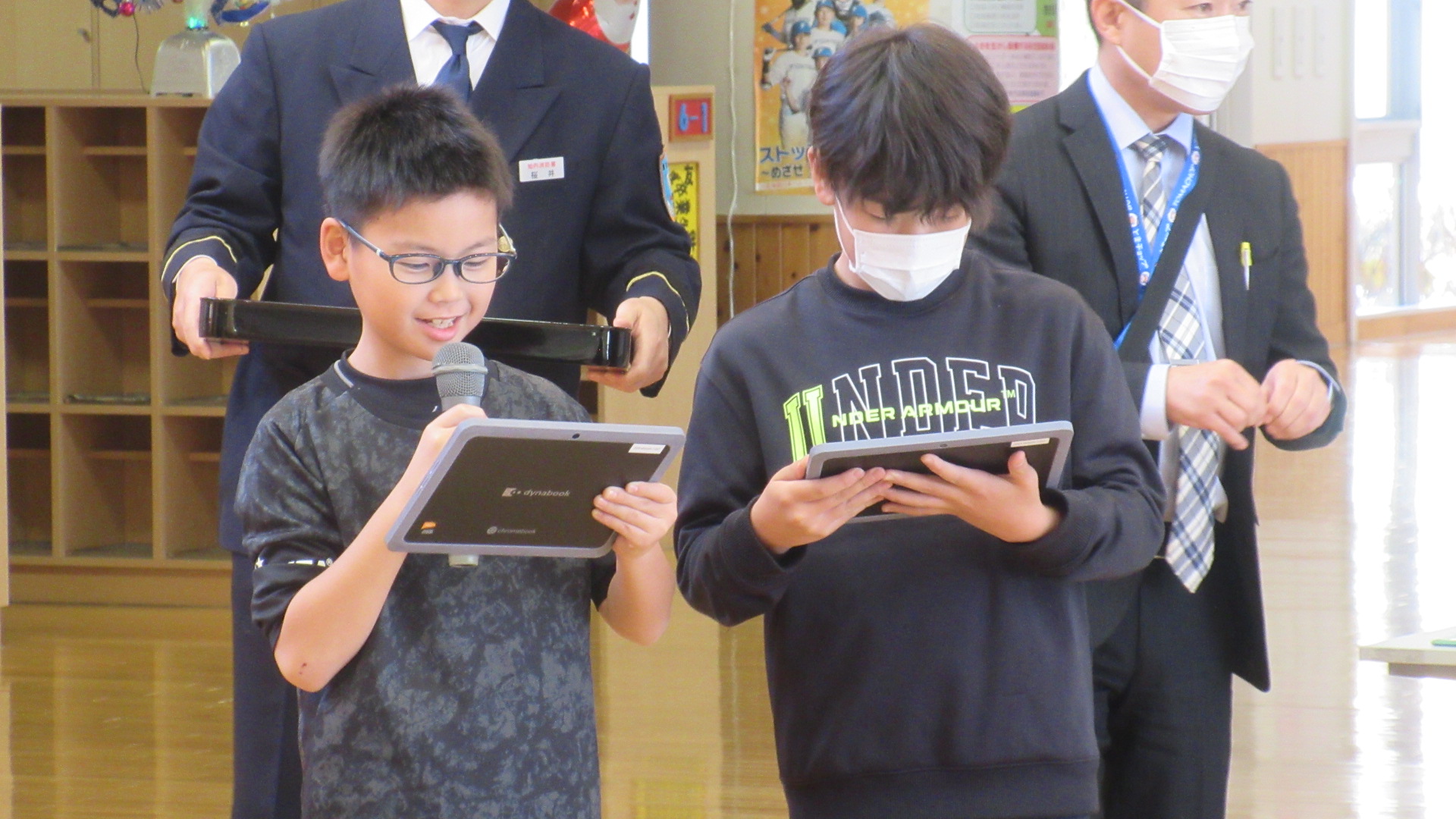 火事から町を守る意識を高めることをねらいとした「防火書道展」の表彰式を行いました。スマイルリーダーズが司会で表彰式が進行しました。