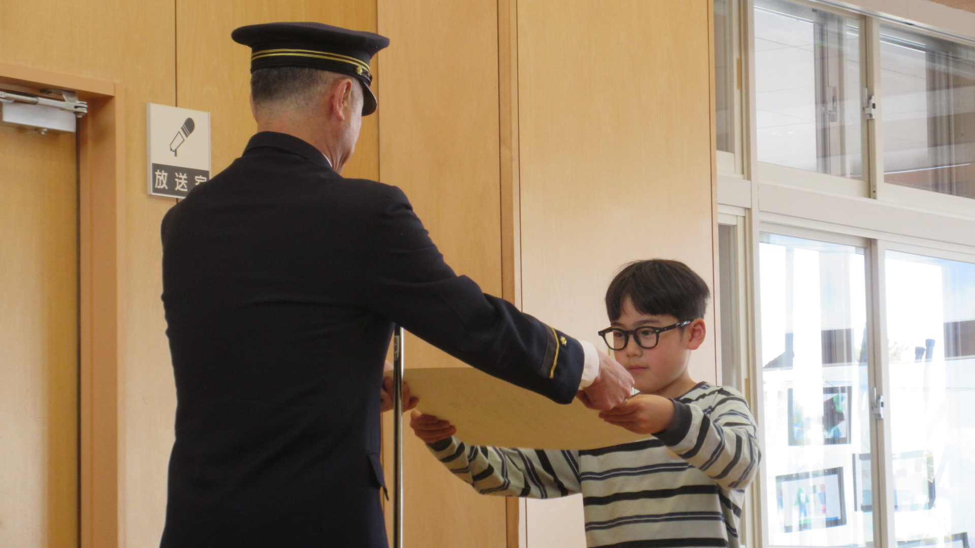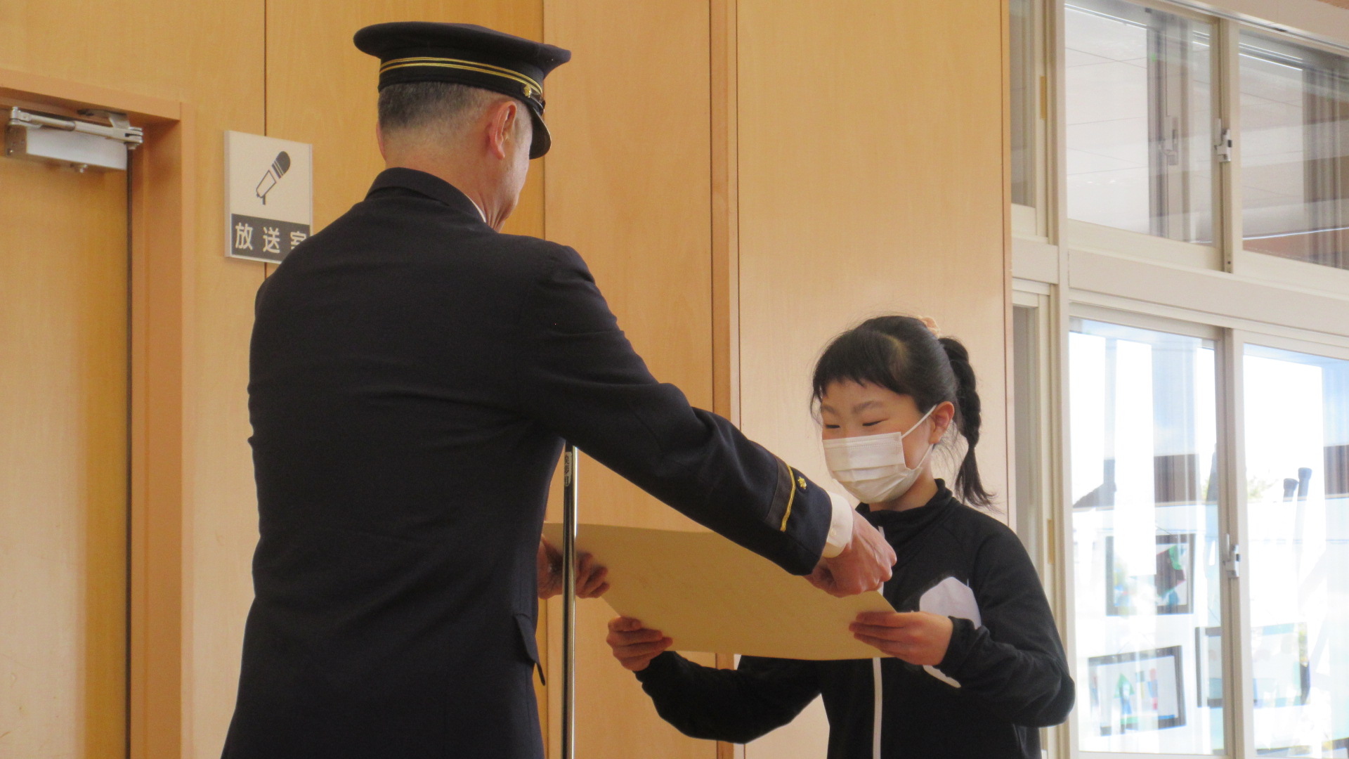 表彰式では、知内消防署長 成澤様から、入選した児童一人一人に賞状が伝達されました。