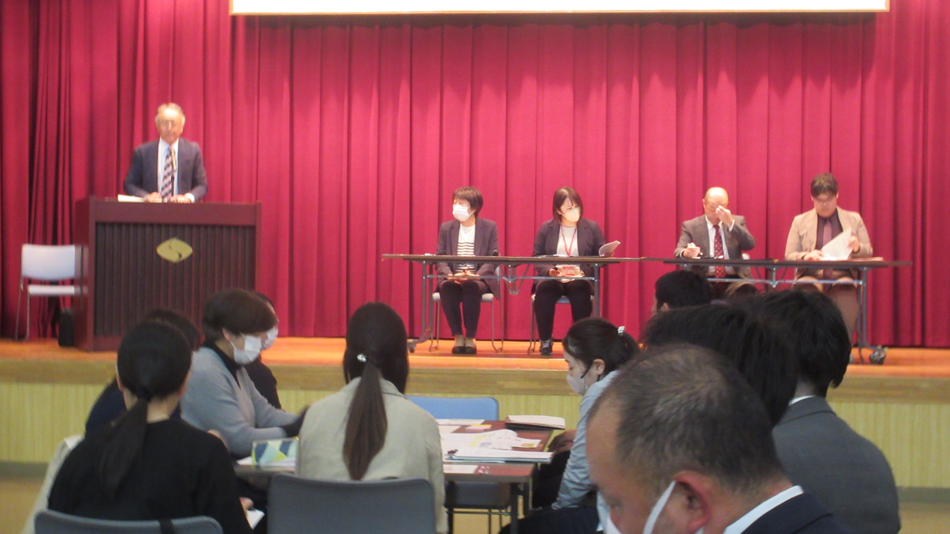 研修では、まず、こども園、小学校、中学校、高等学校の代表者が、自校の実情についてパネルディスカッションをしました。