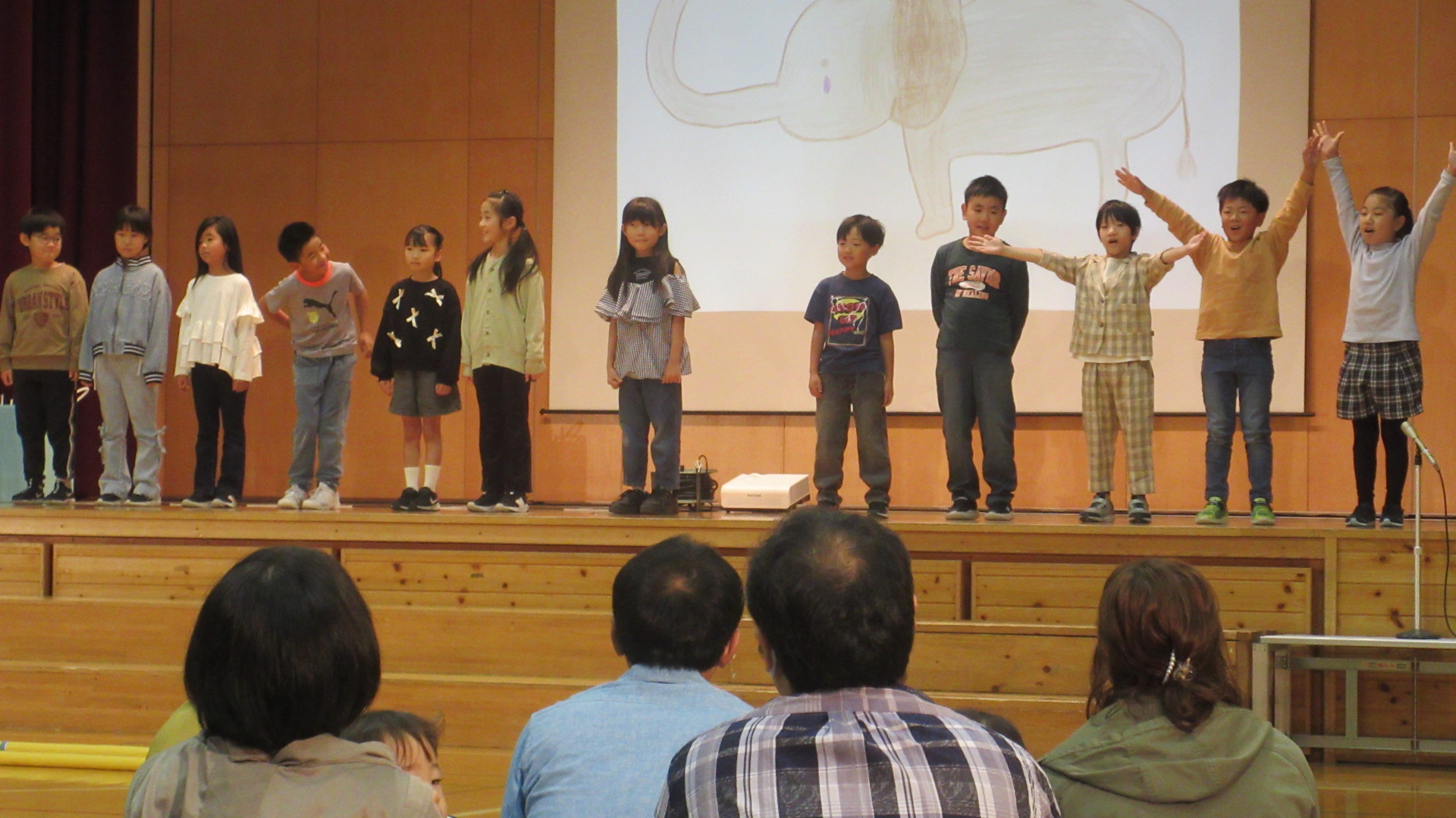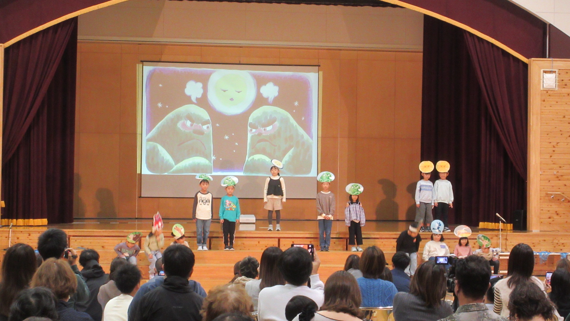 本日、学習発表会を行いました。1年生は、国語で学んだ「けんかした山」を発表しました。