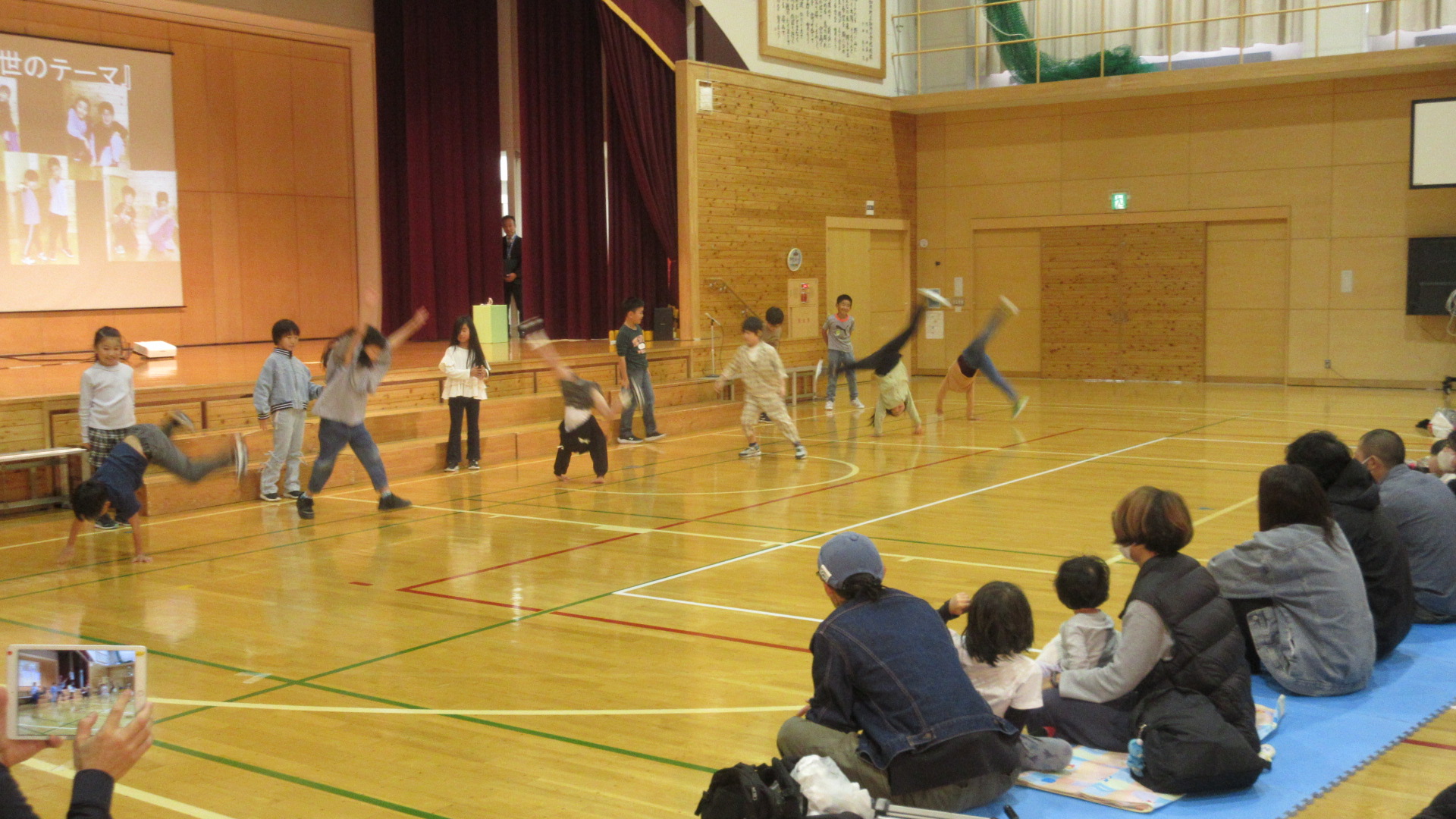 最後は、ルパン三世のテーマにのって、ボディーパーカッションをする中で、写真のように側転も披露し、お客様から大きな拍手をもらいました。
