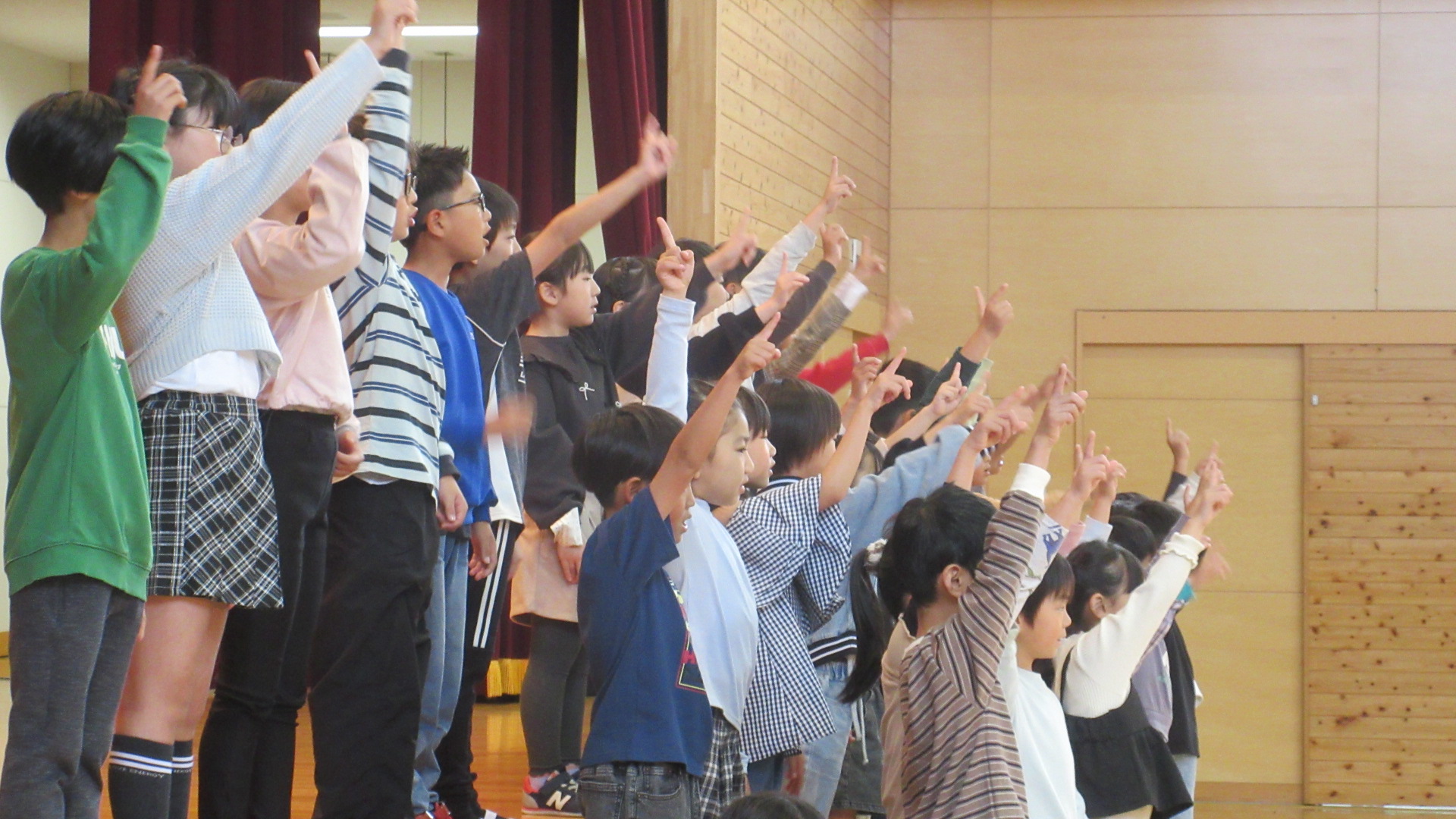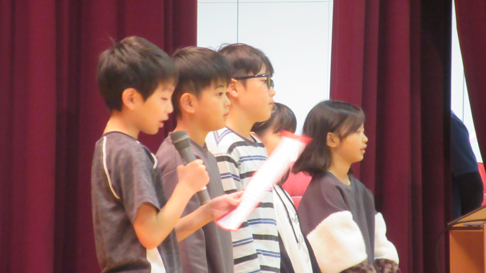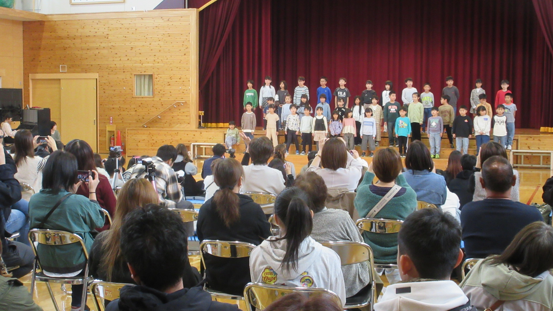1~3年生の最後は全員での合唱です。「散歩」「小さな世界」を元気よく歌うことができました。今までの中で一番いい歌声でした。