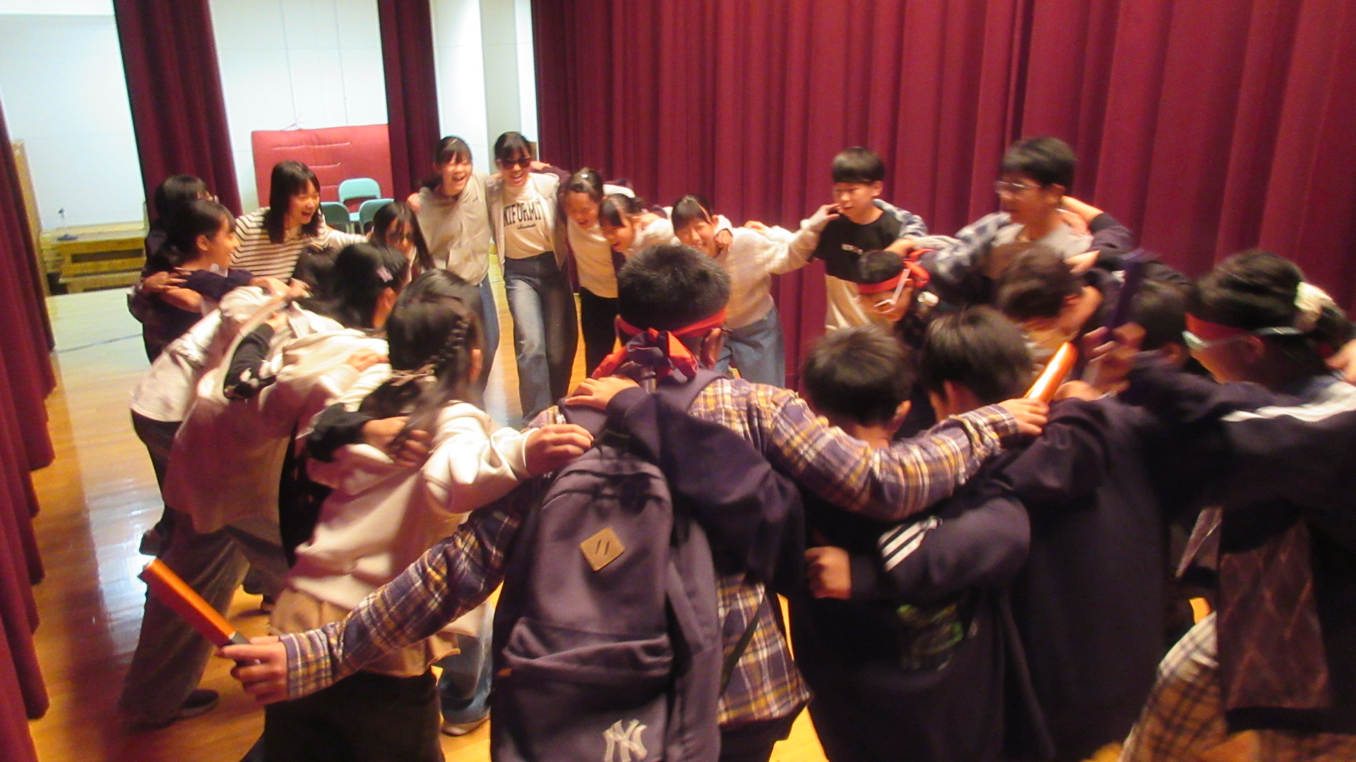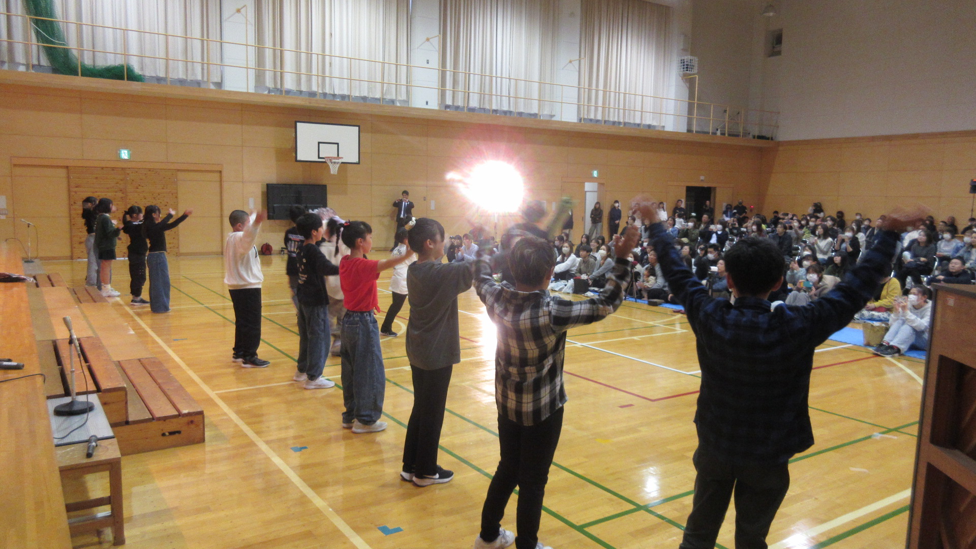 さて、6年生にとって最後の学習発表会です。最初にステージで円陣を組み、今までの練習の成果を出すために気合いを入れました。