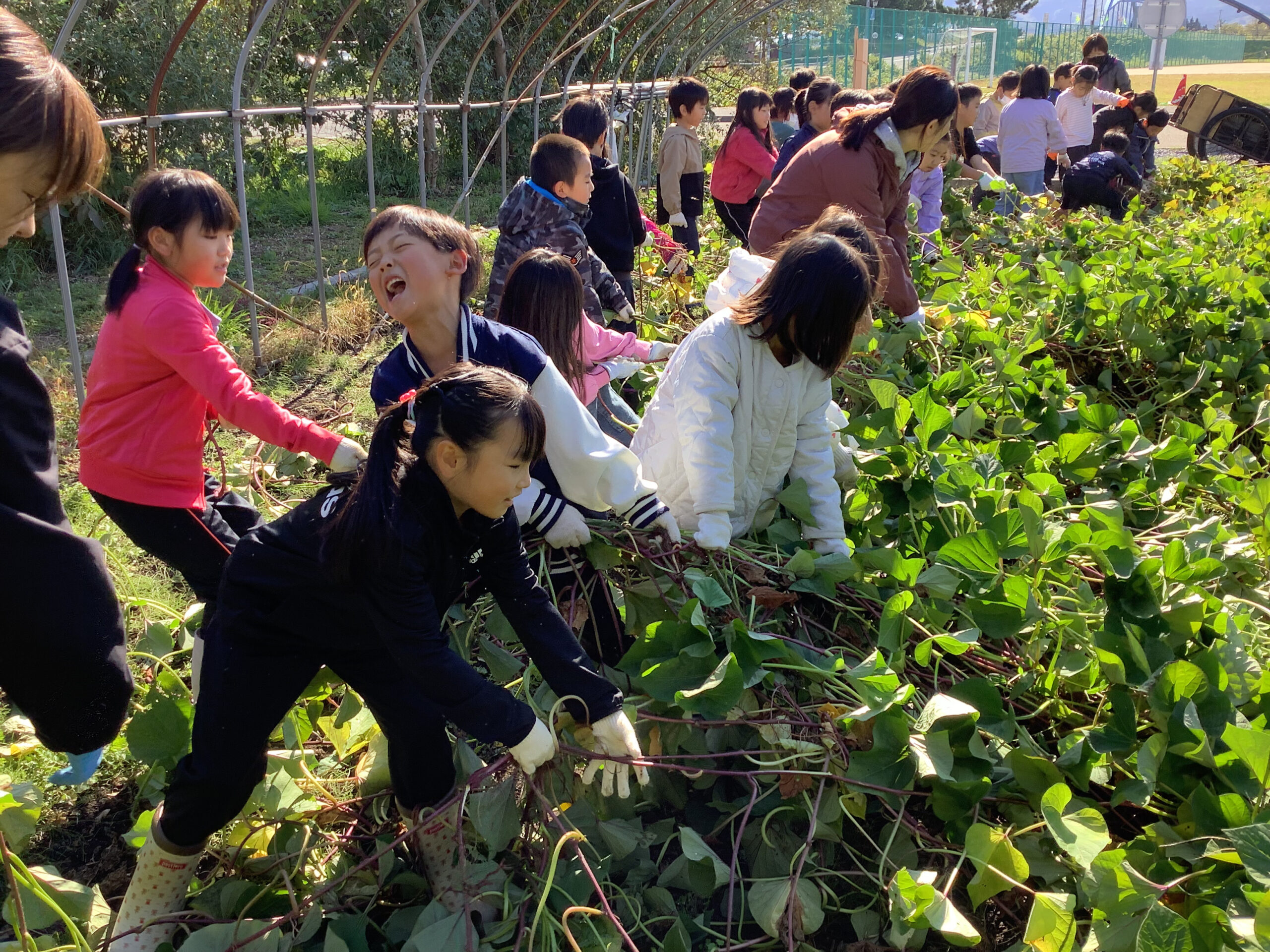 1・2年生が、6月16日にサツマイモの苗を植えて、5カ月がたちました。畑一面には、サツマイモの弦が広がりっていました。果たしてどんな大きさのサツマイモが出てくるでしょうか?