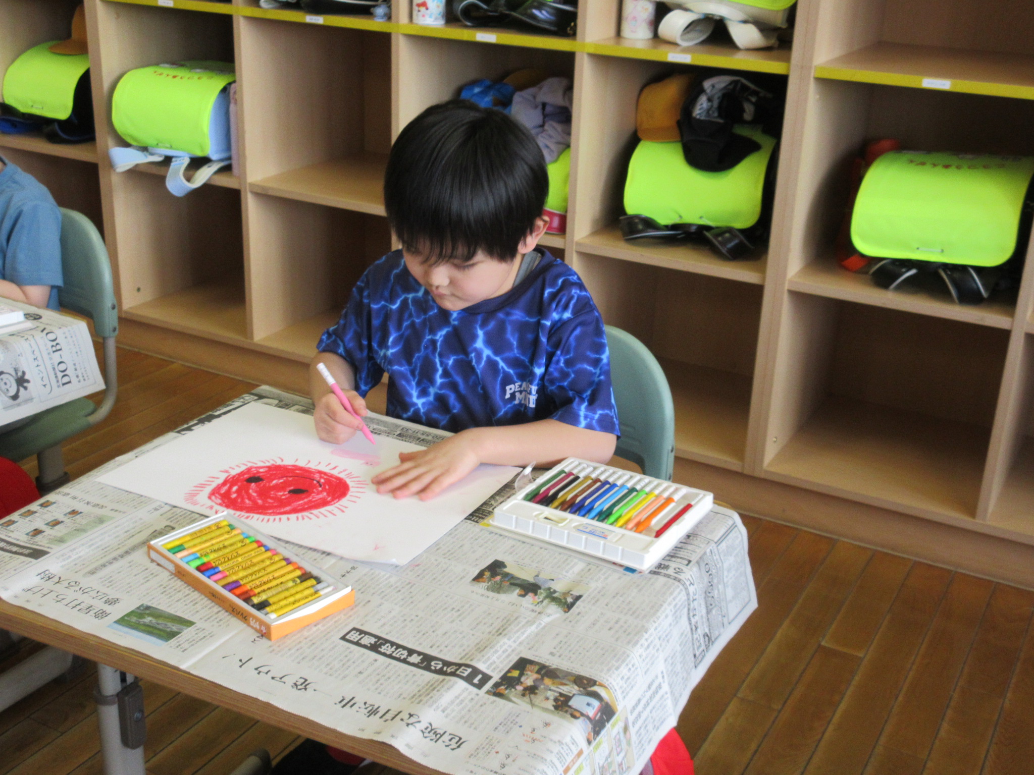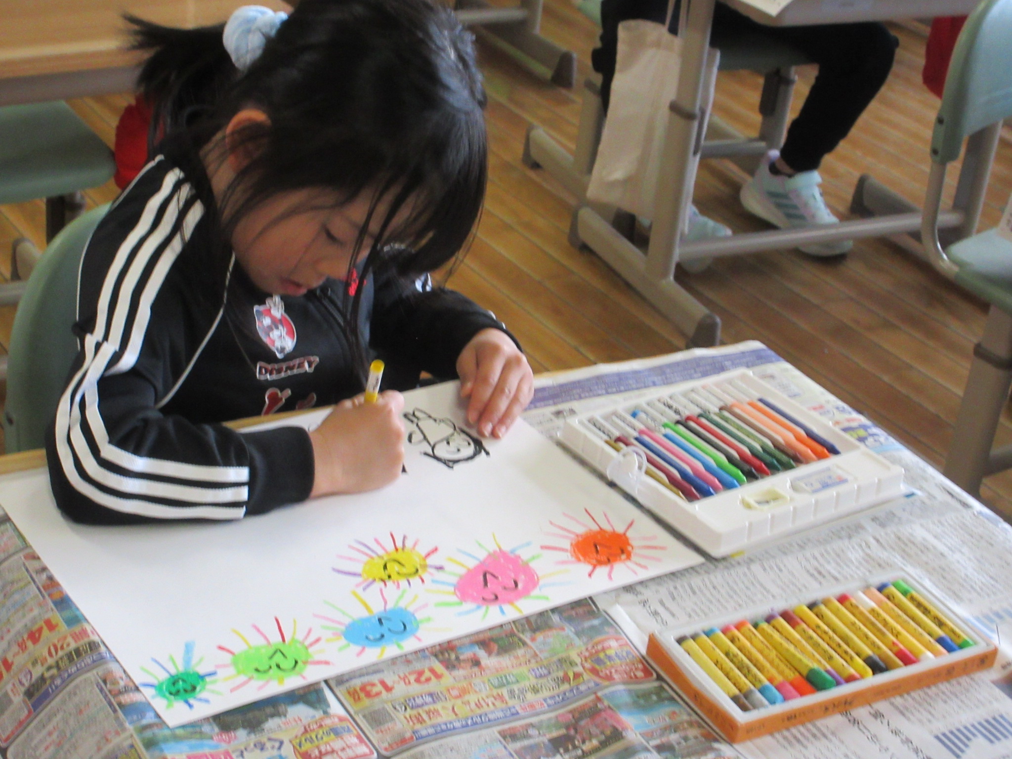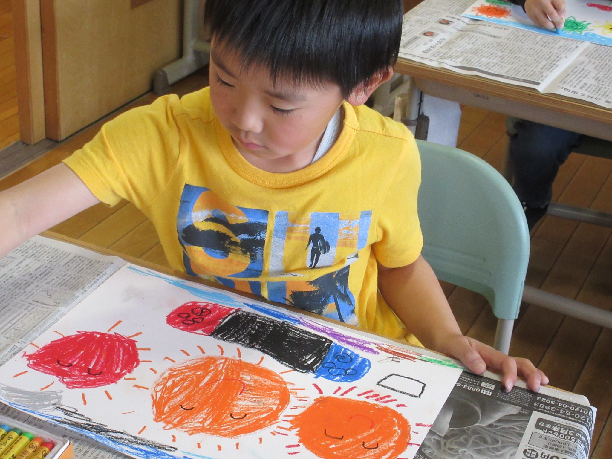 この図工の時間も、画用紙いっぱいに色とりどりの「おひさま」をみんな集中してかいていました。