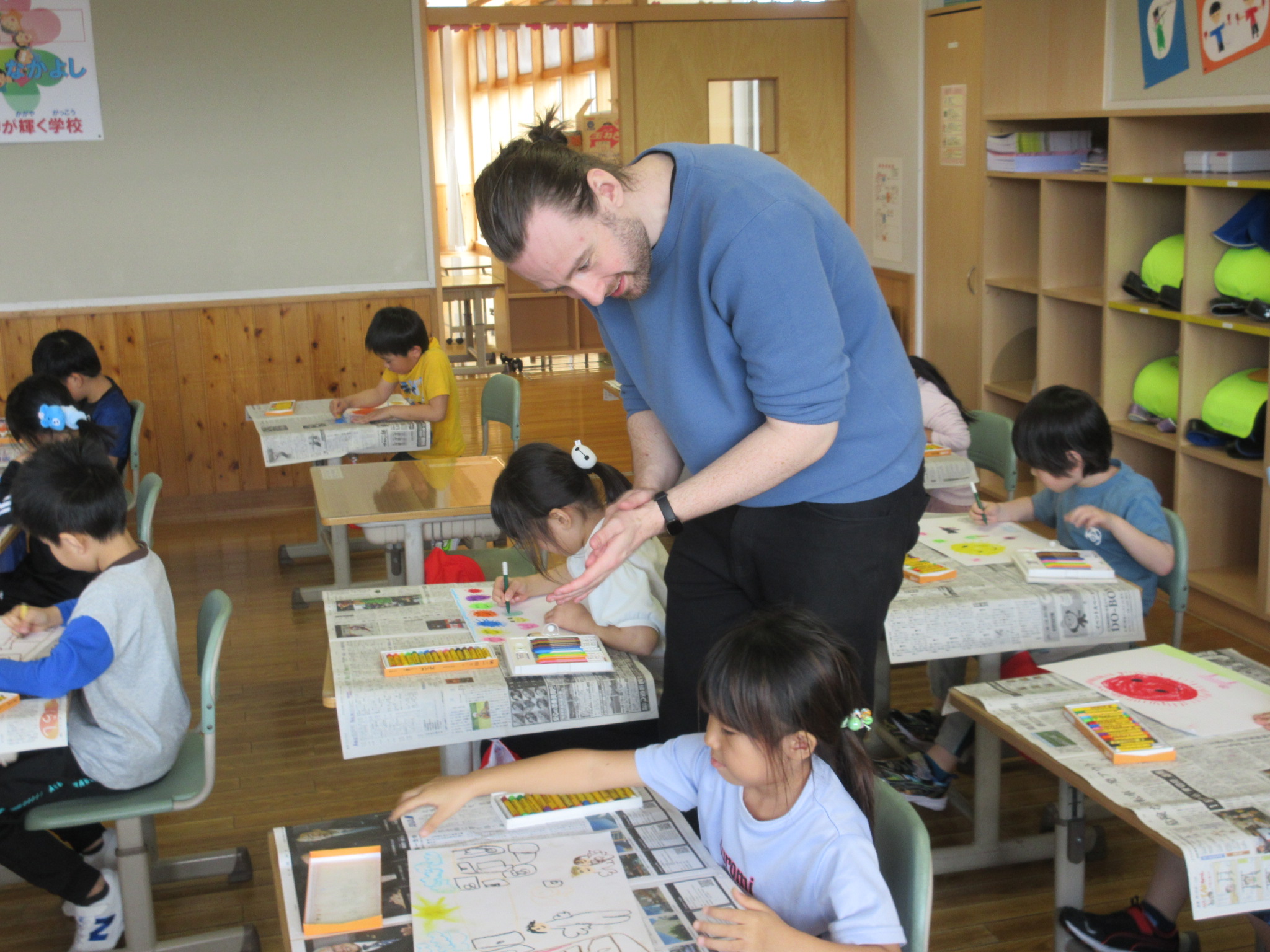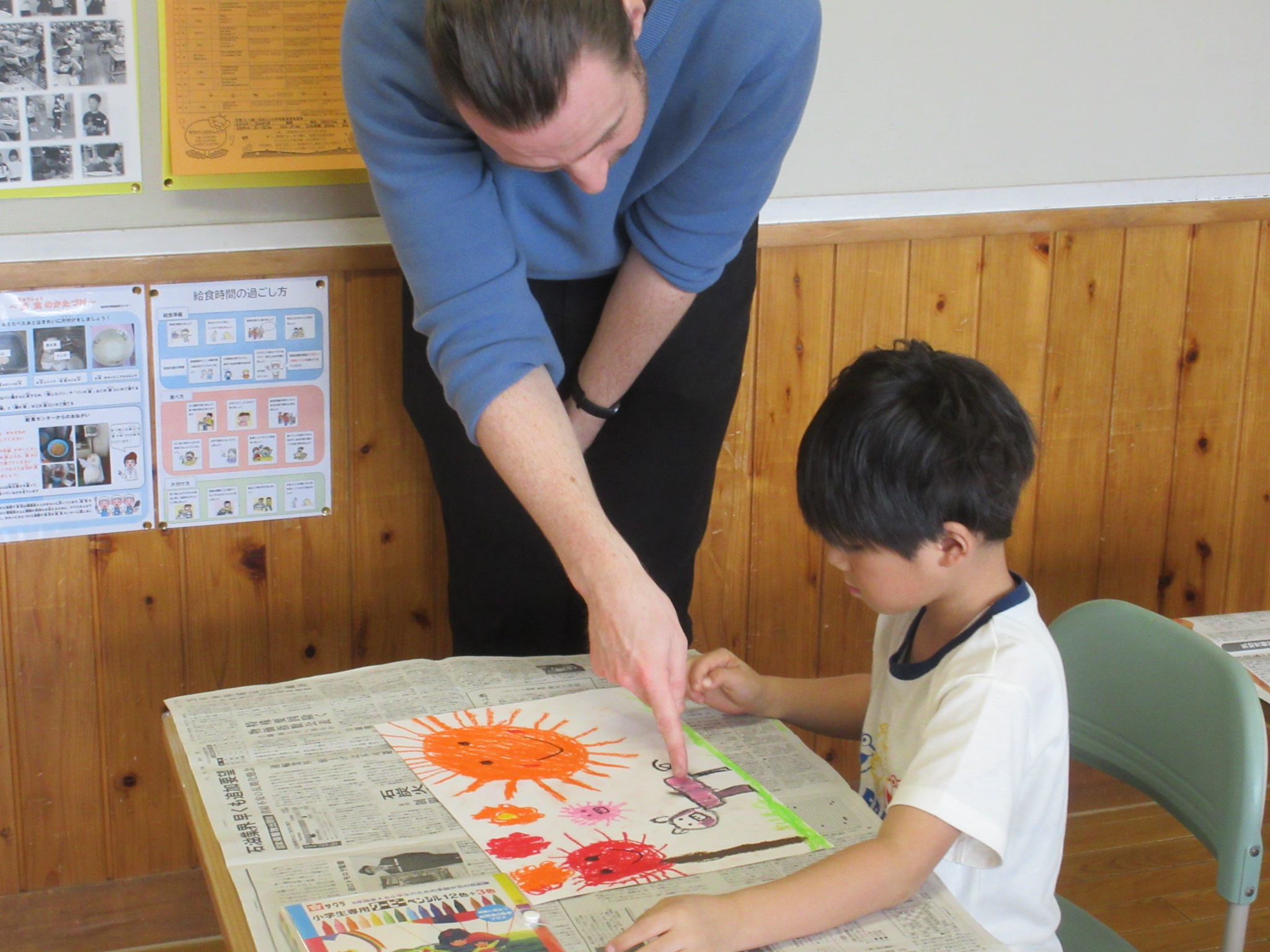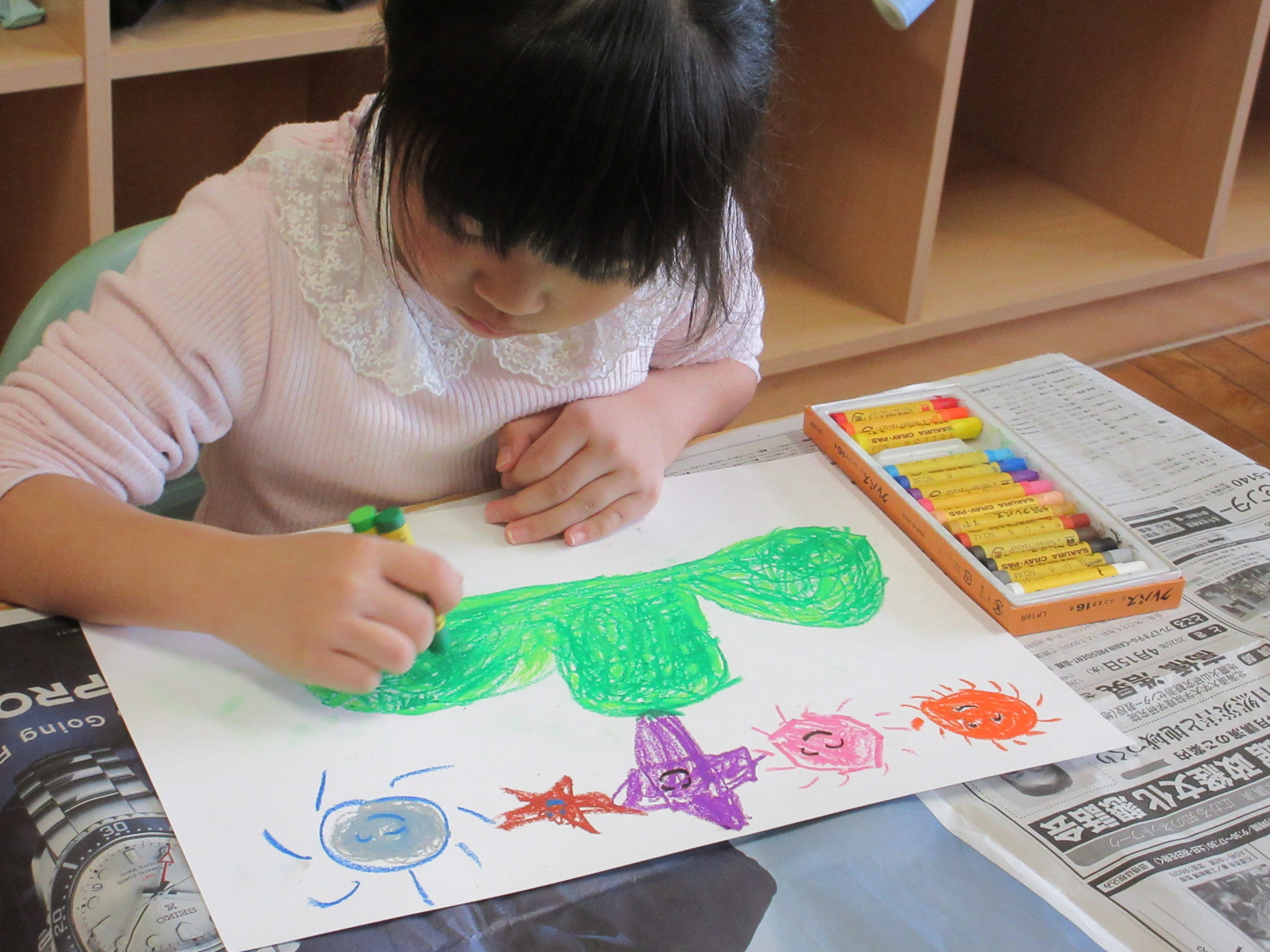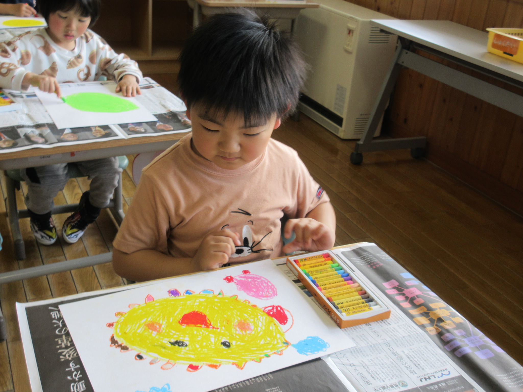 この図工の時間も、画用紙いっぱいに色とりどりの「おひさま」をみんな集中してかいていました。