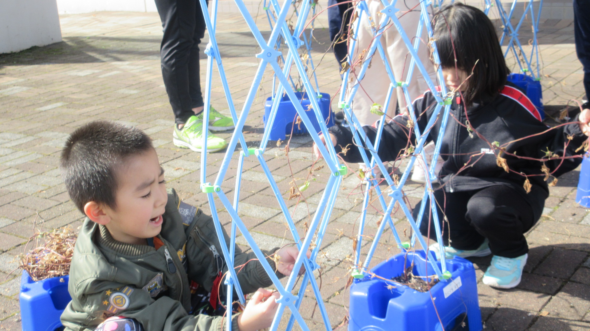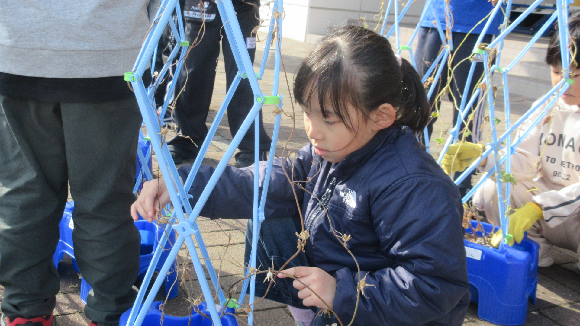 1年生が一生懸命大きく育てたアサガオは支柱にたくさん絡まっていて、みんな弦をほどくのに蚊なら苦労していました。