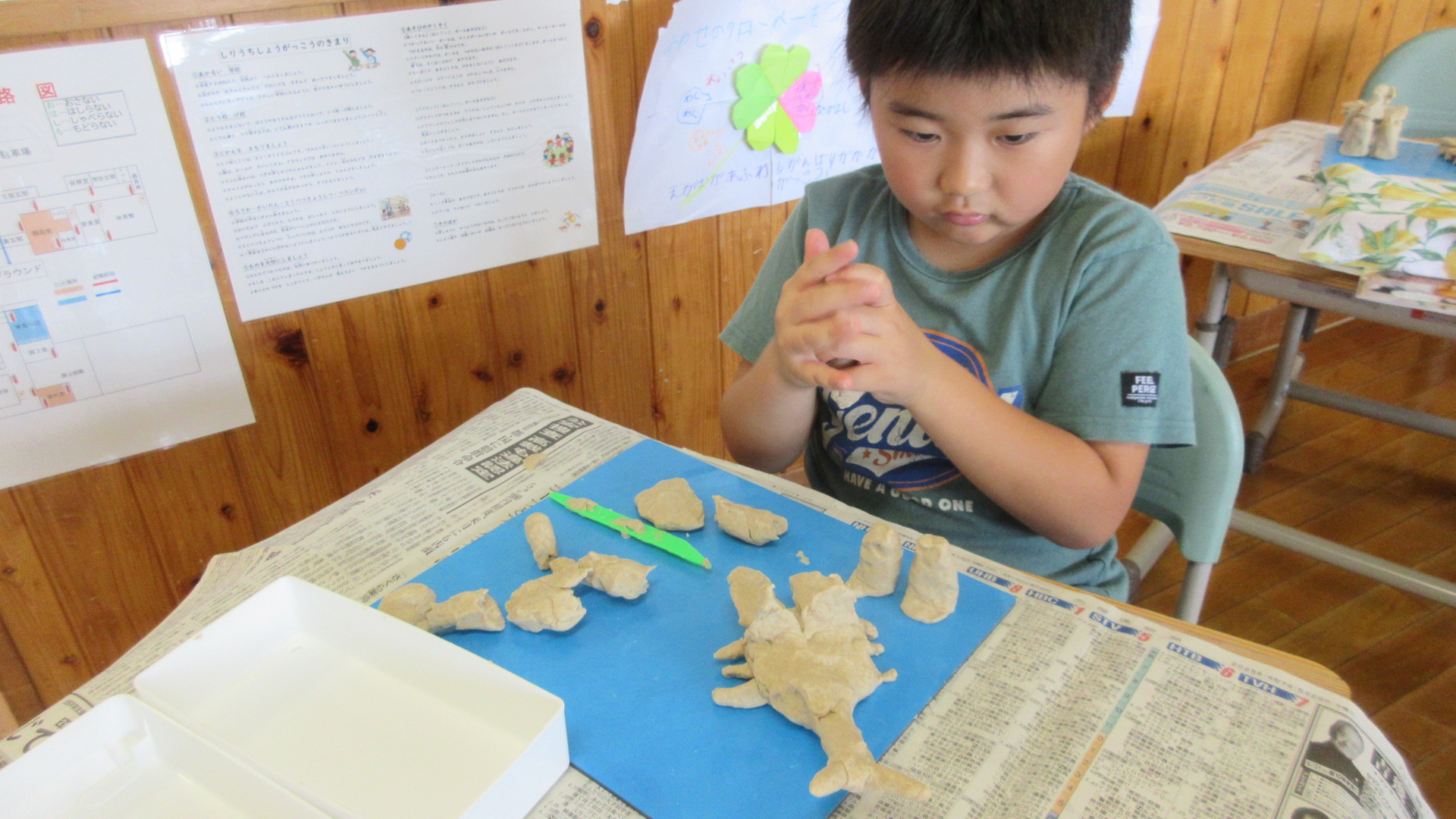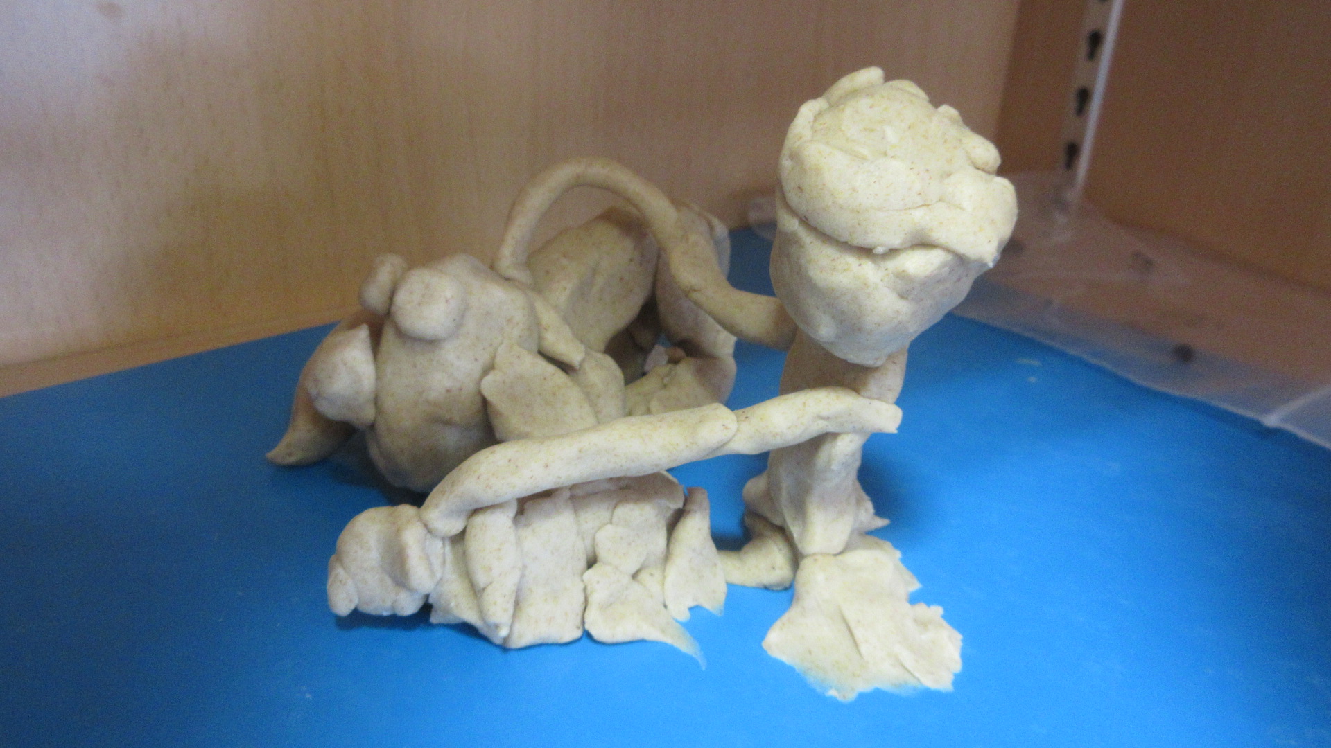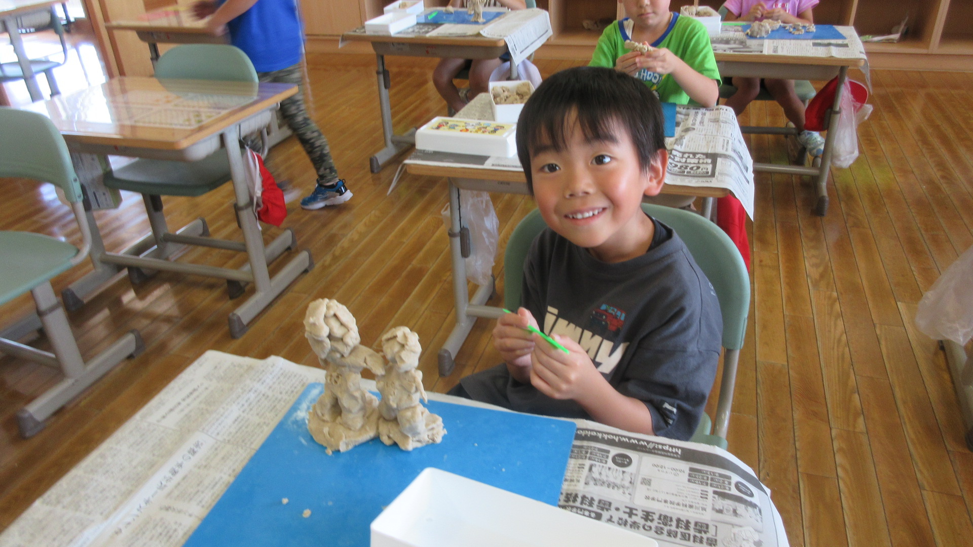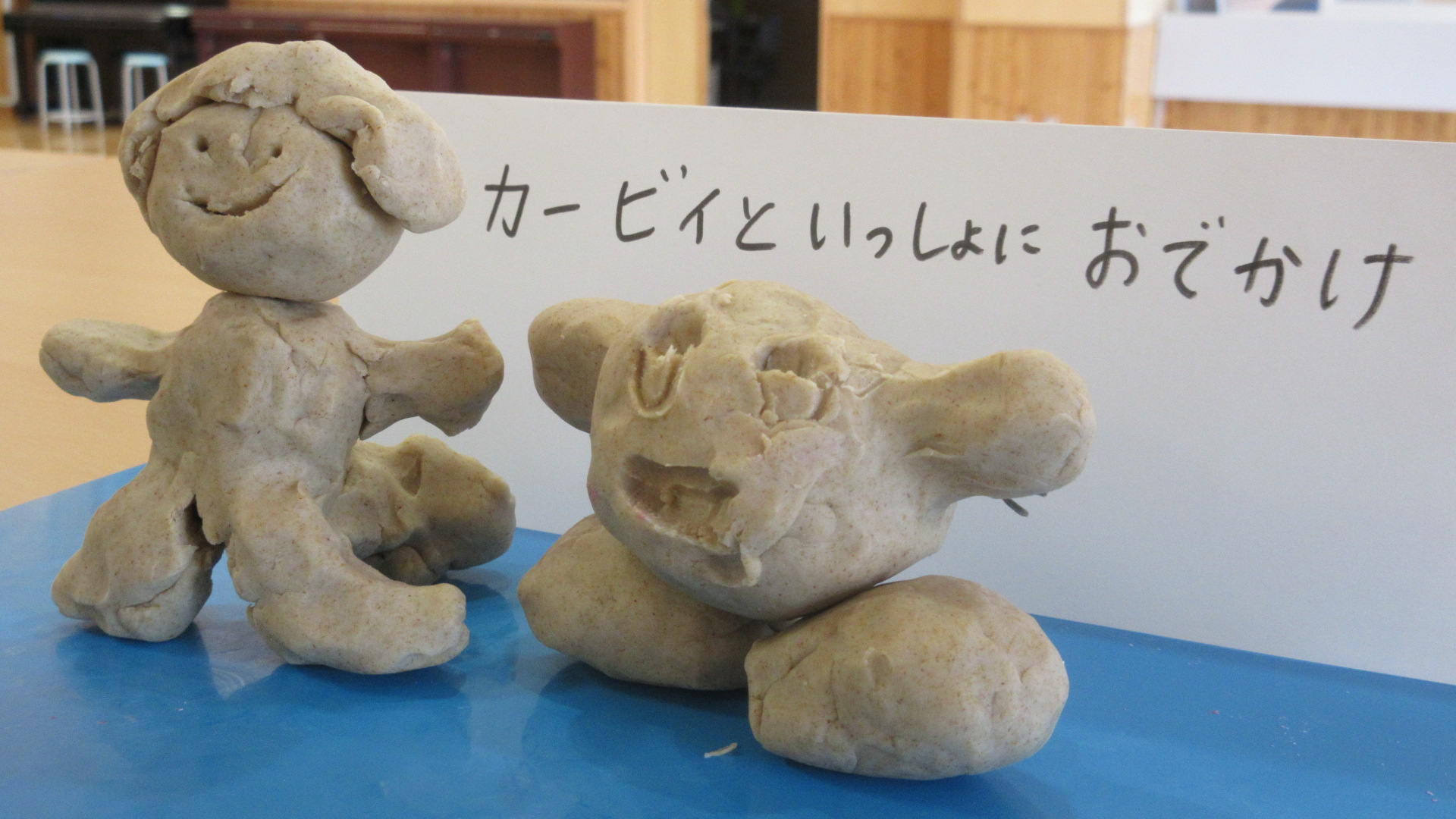 1年生が図工で粘土をしていました。「○○とわたし」という題で、自分が一緒に何かとお散歩している作品です。