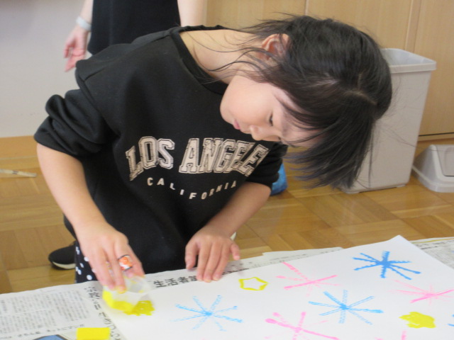1年生が図工室で学習をしていました。家庭から持ち寄った、いろいろな材料(プラスティック容器など)に、色を付けて、画用紙に写し取って、1枚の絵にする学習です。