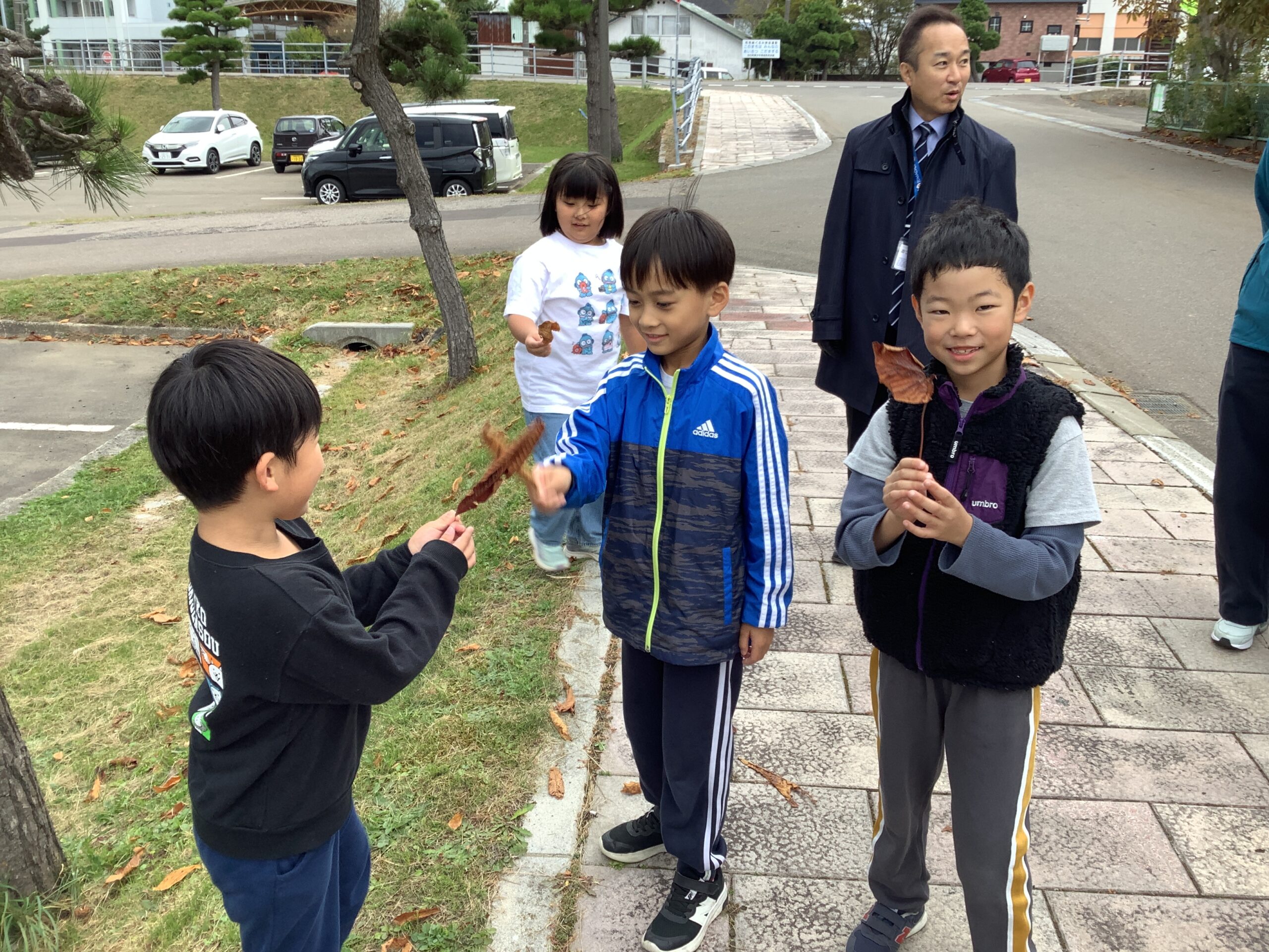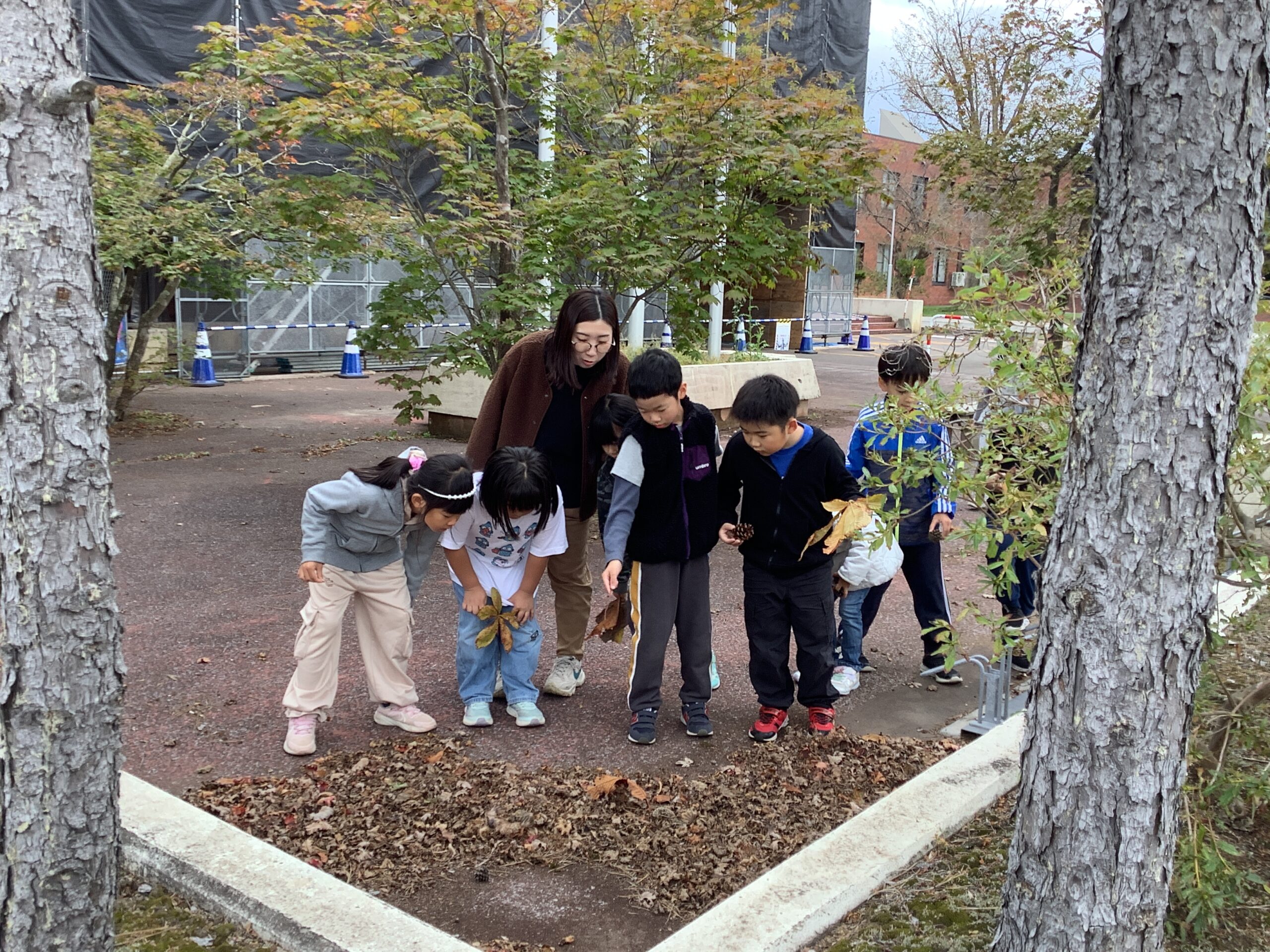 ヒグマに注意して見守りを増やして、外の観察に出かけました。色づいた葉っぱに大喜び!