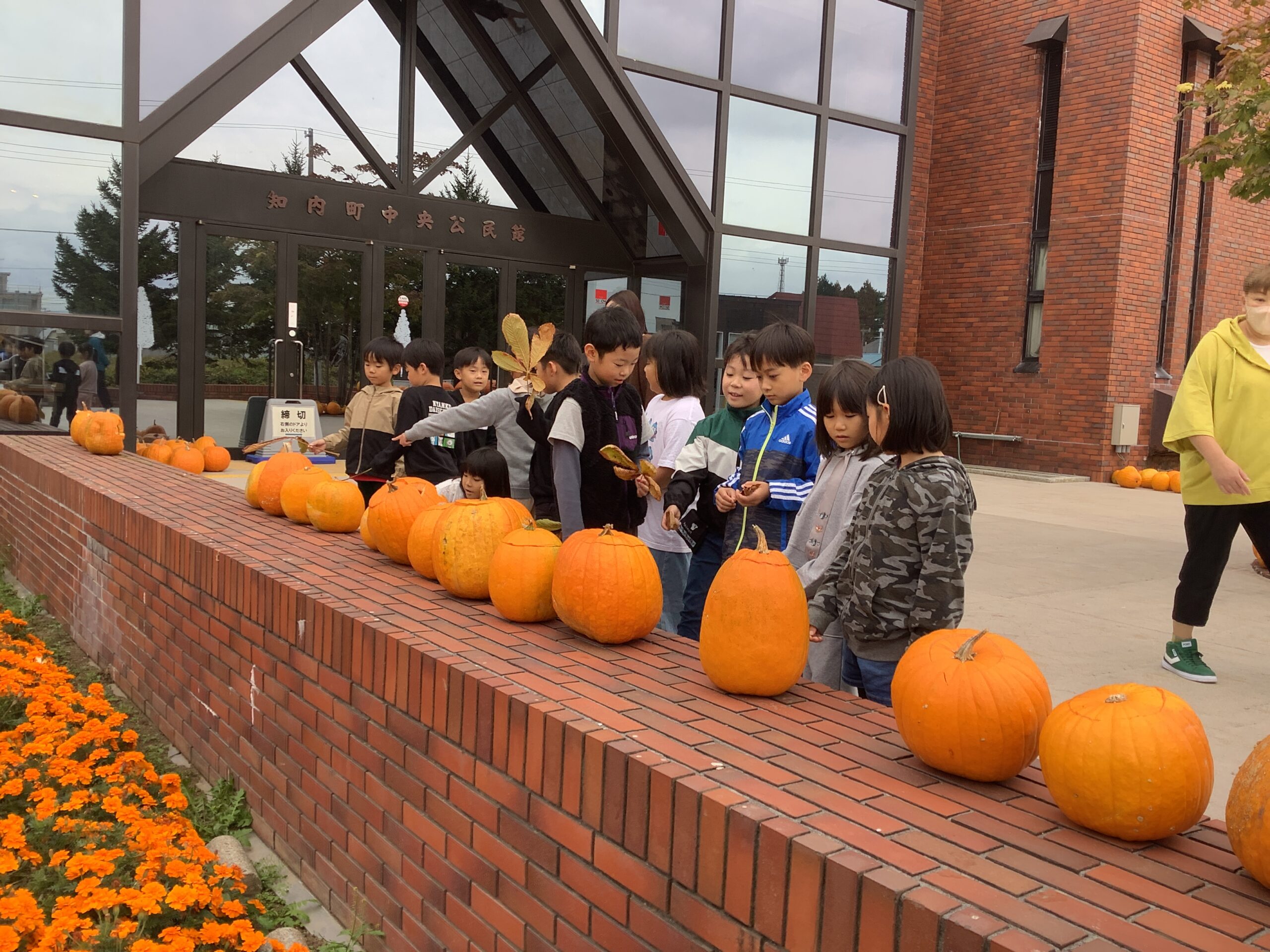 放課後子ども教室で作成したハロウィンのかぼちゃランタンを発見!「これ、ぼくのだ!」など大興奮でした。
