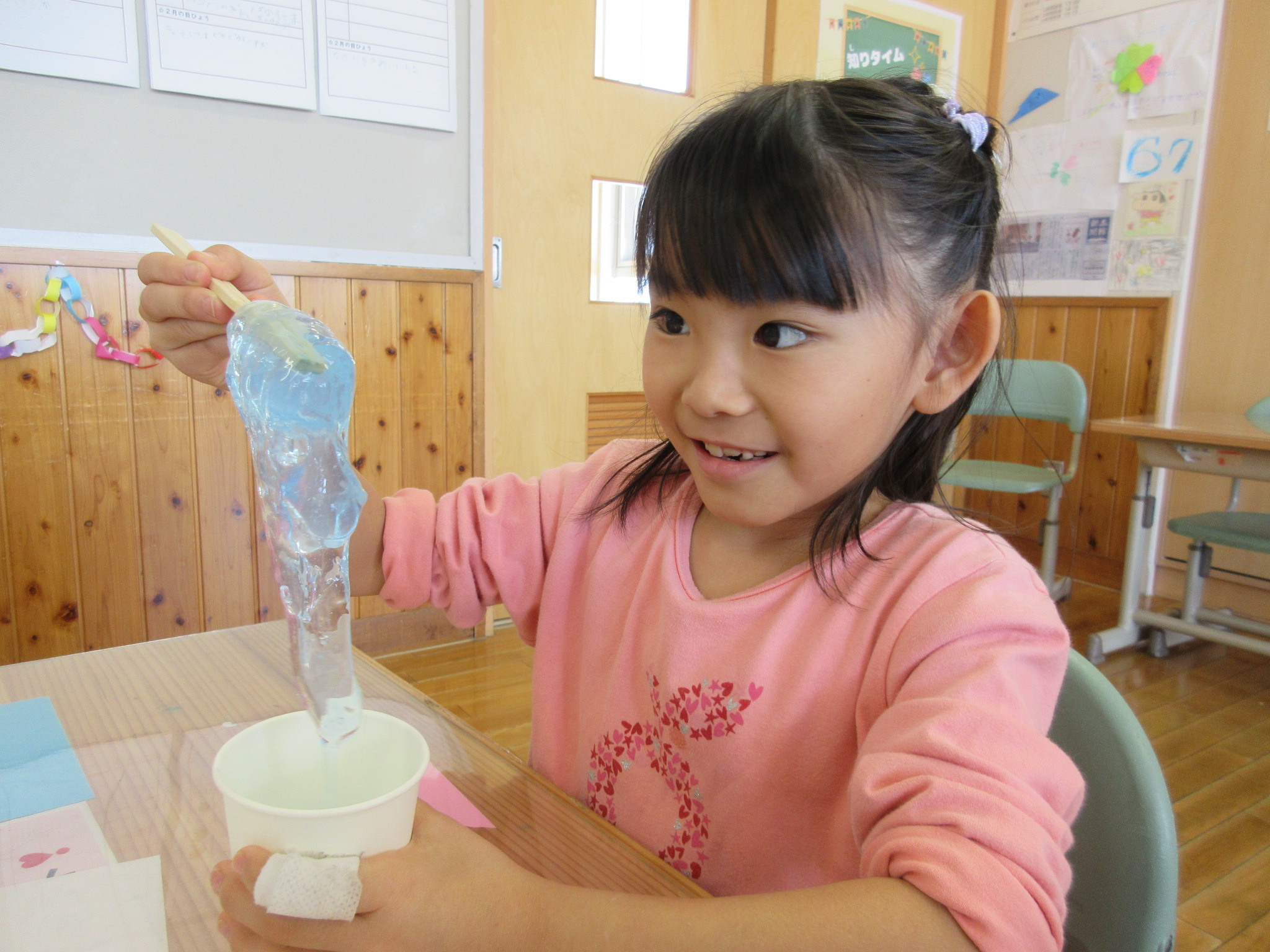ほうしゃを入れることで、水と洗濯のりを混ぜた液体がどんどんかたまり、「わぁ~固まった!」と大横美の1年生のみんな。