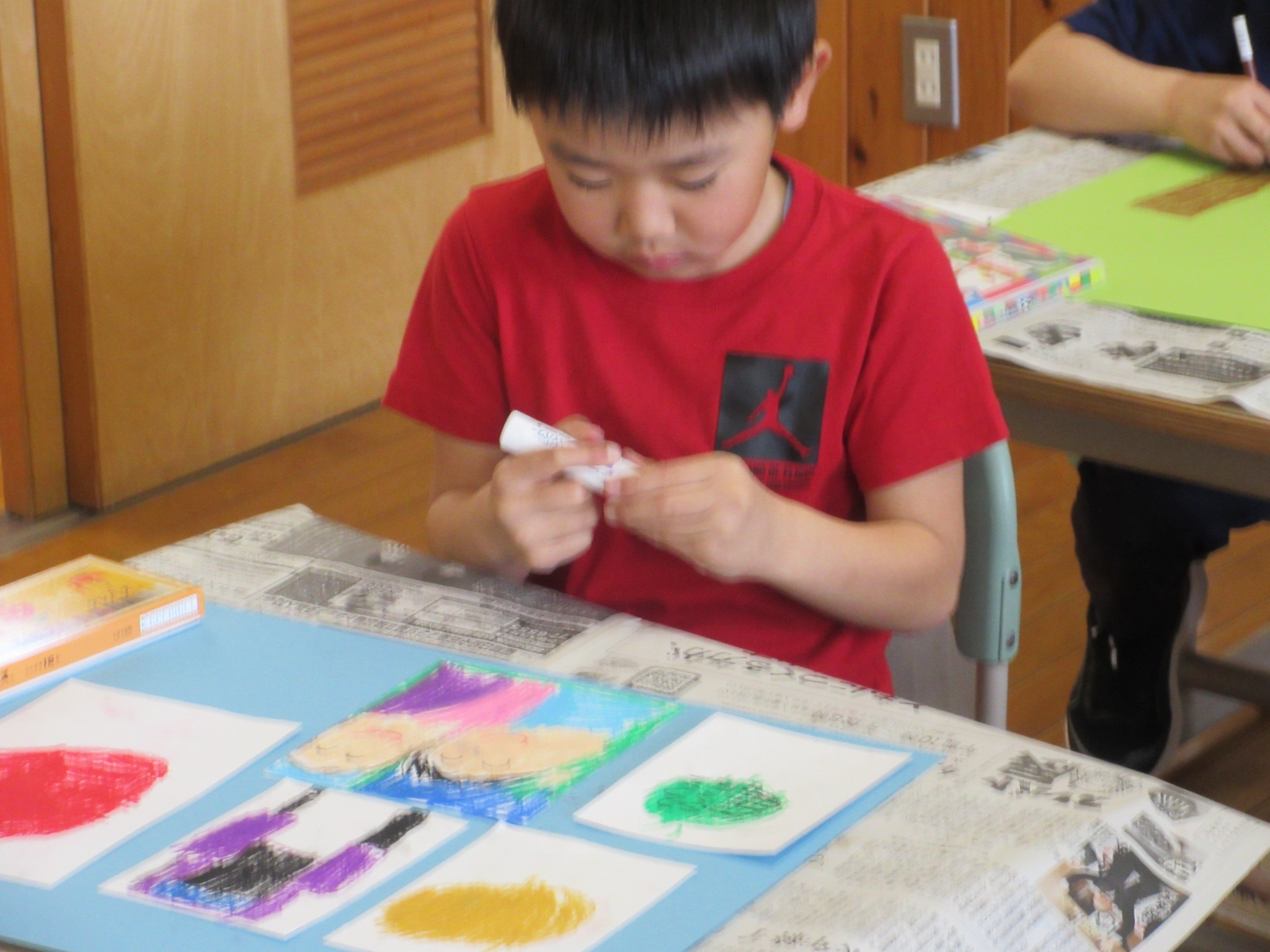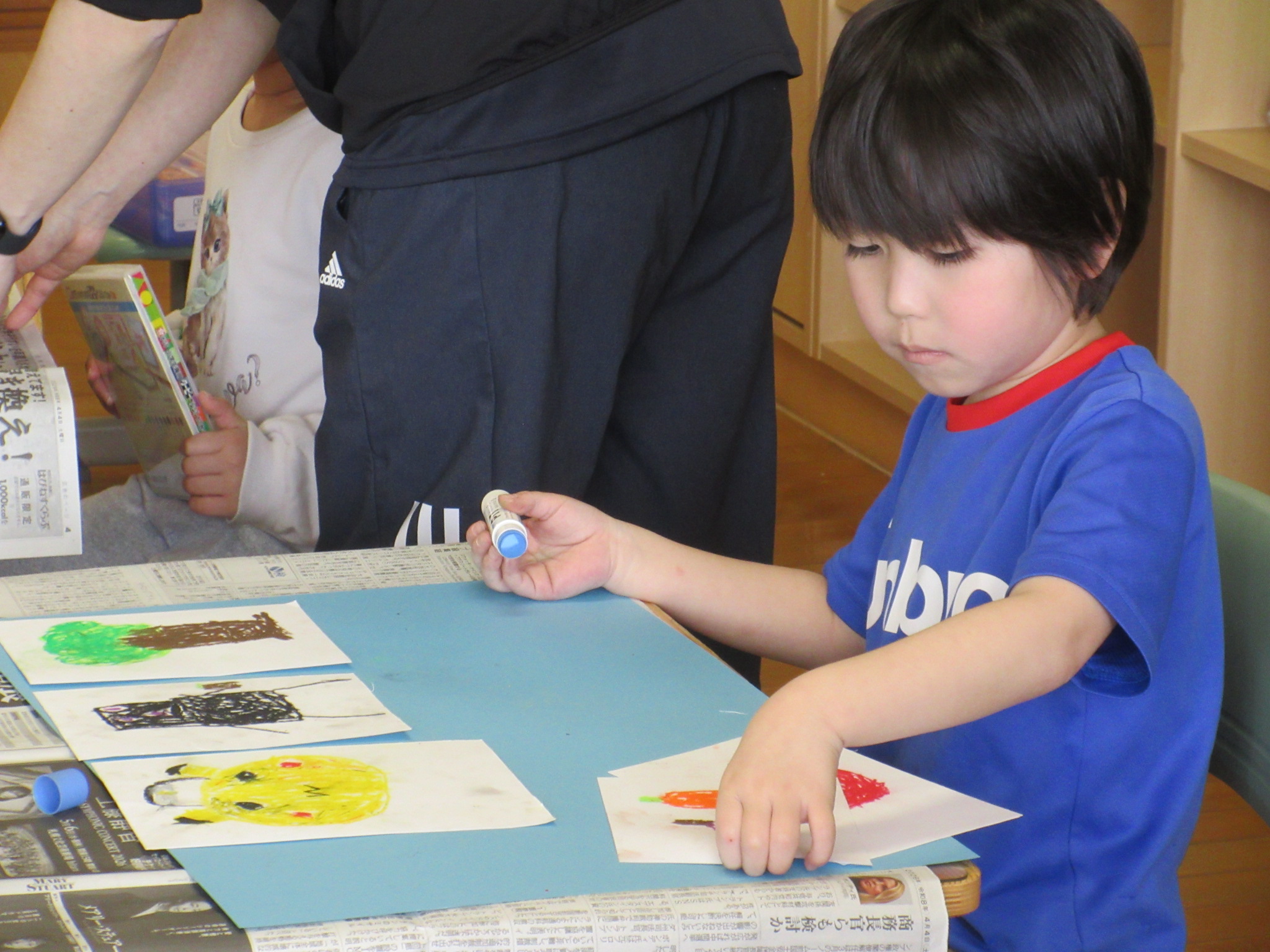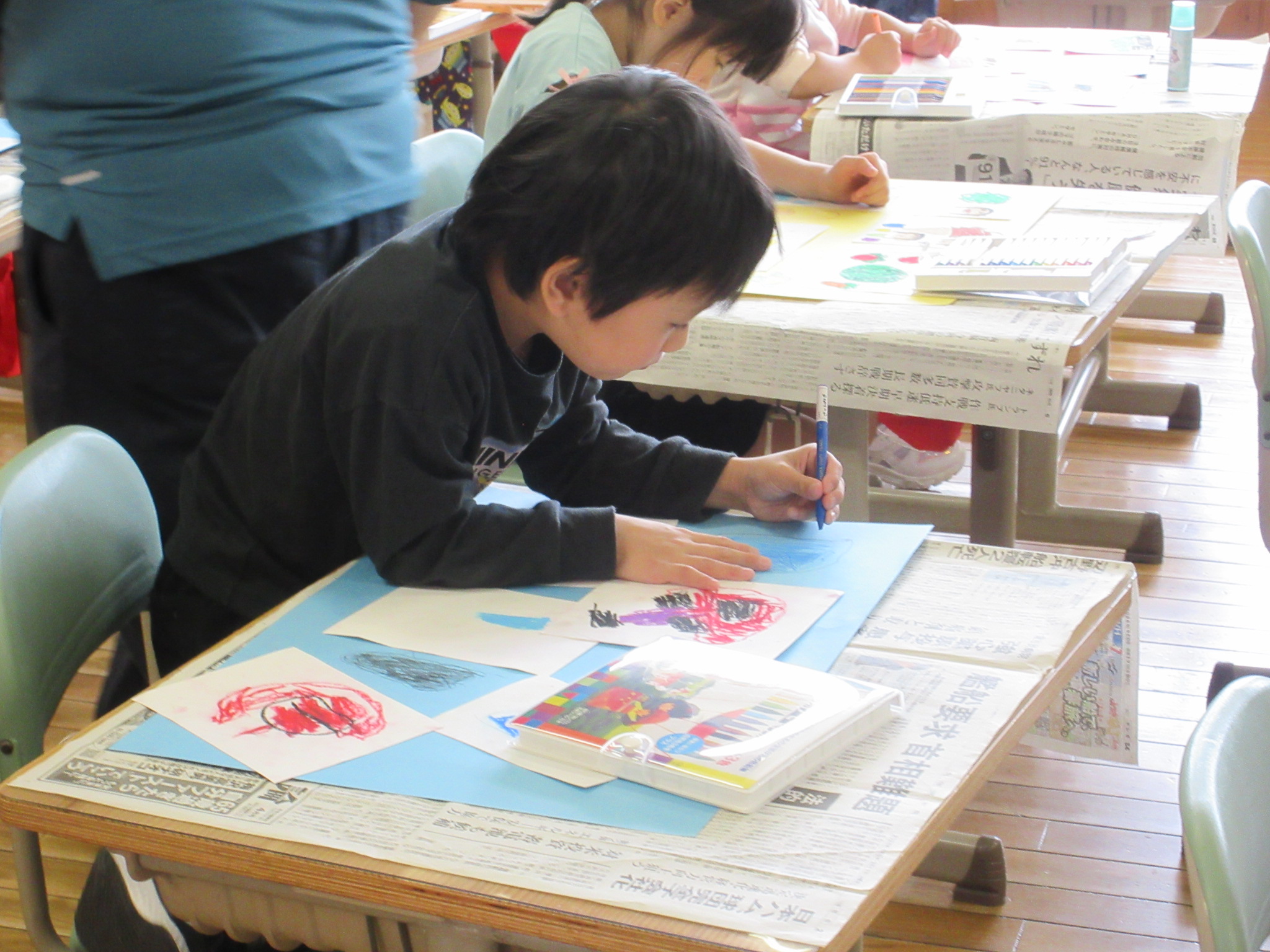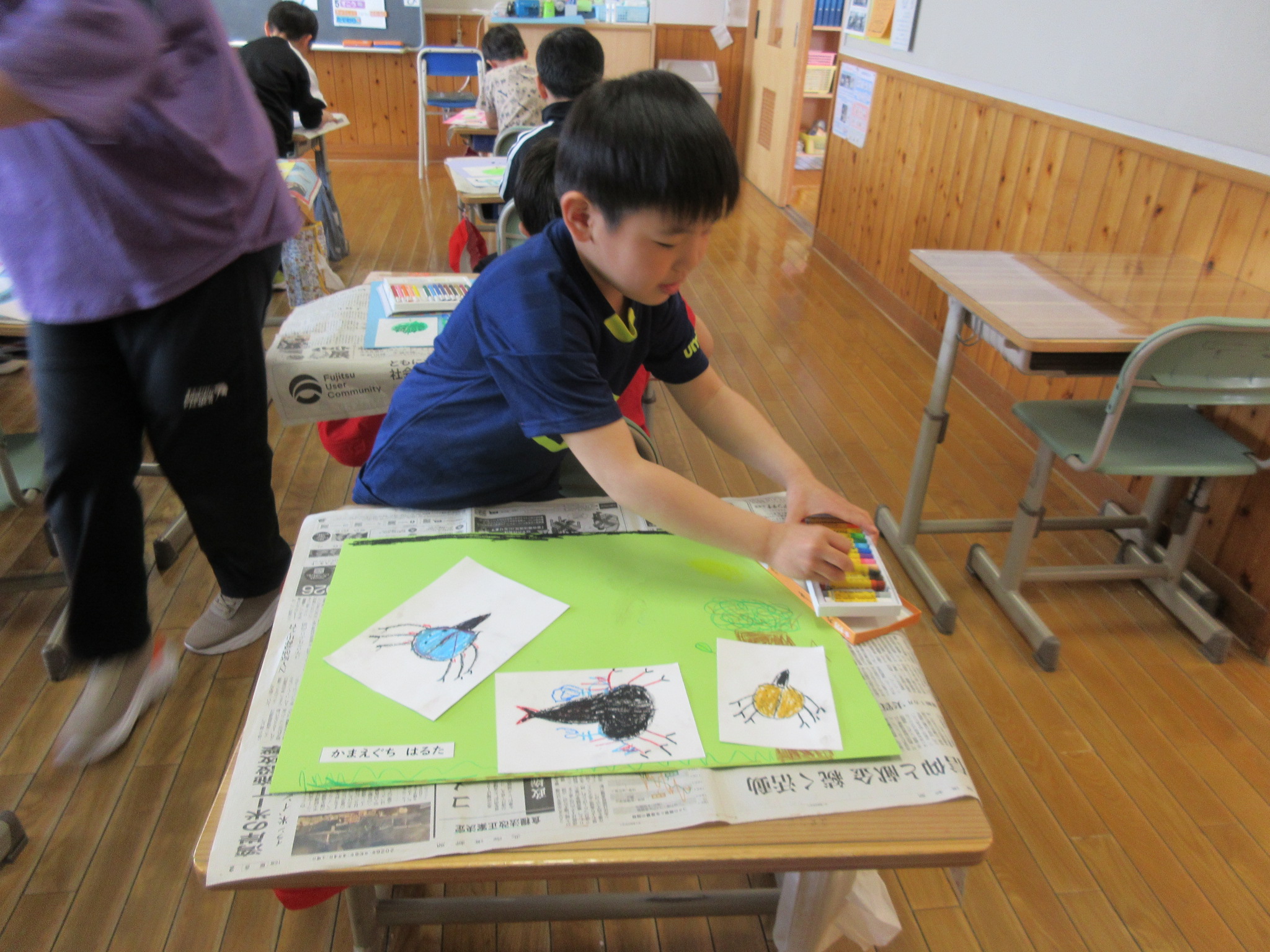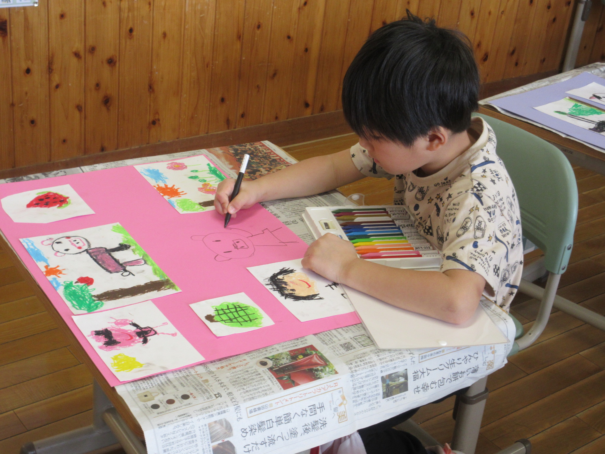 それを、色画用紙に貼って、開いたところにも絵をかいてがんばっていました。