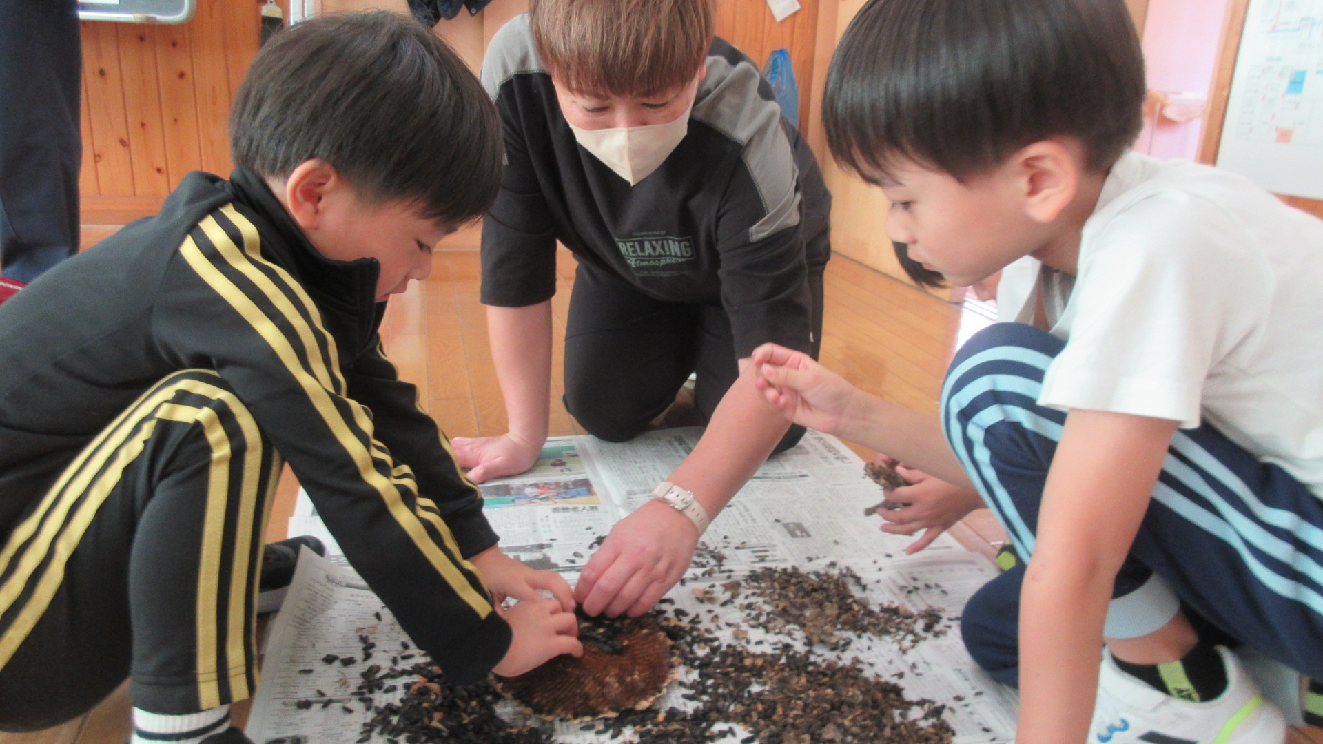 1年生が9月26日(HP参照)に収穫したひまわりの種とりをしました。