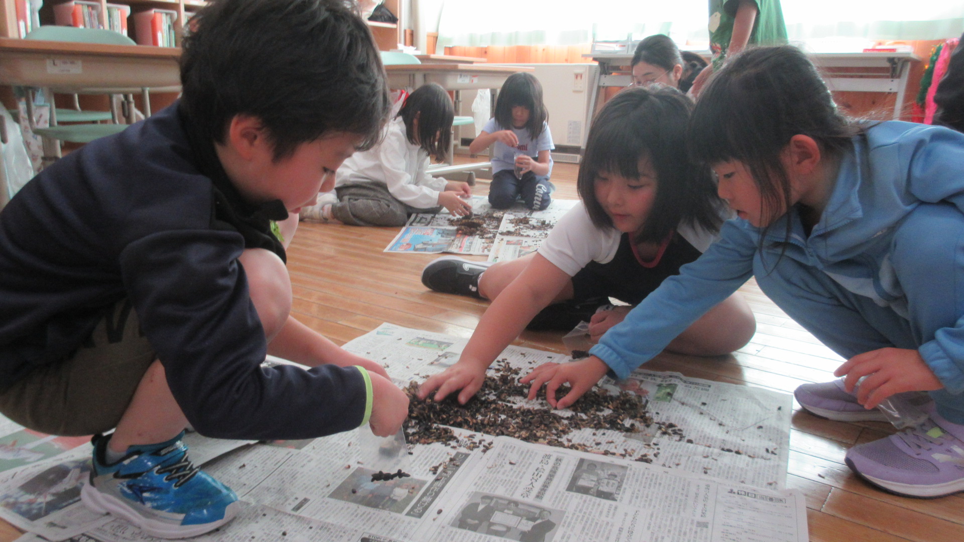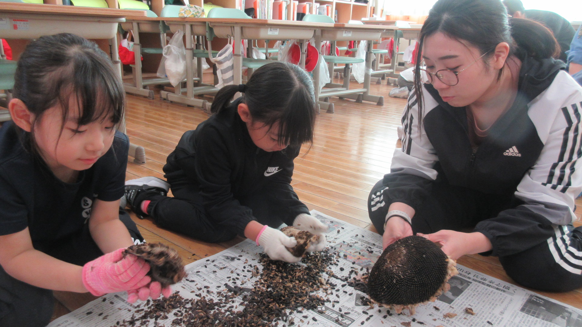 2~3人のグループに分かれて、ひまわりの種を新聞紙の上に取り出しました。