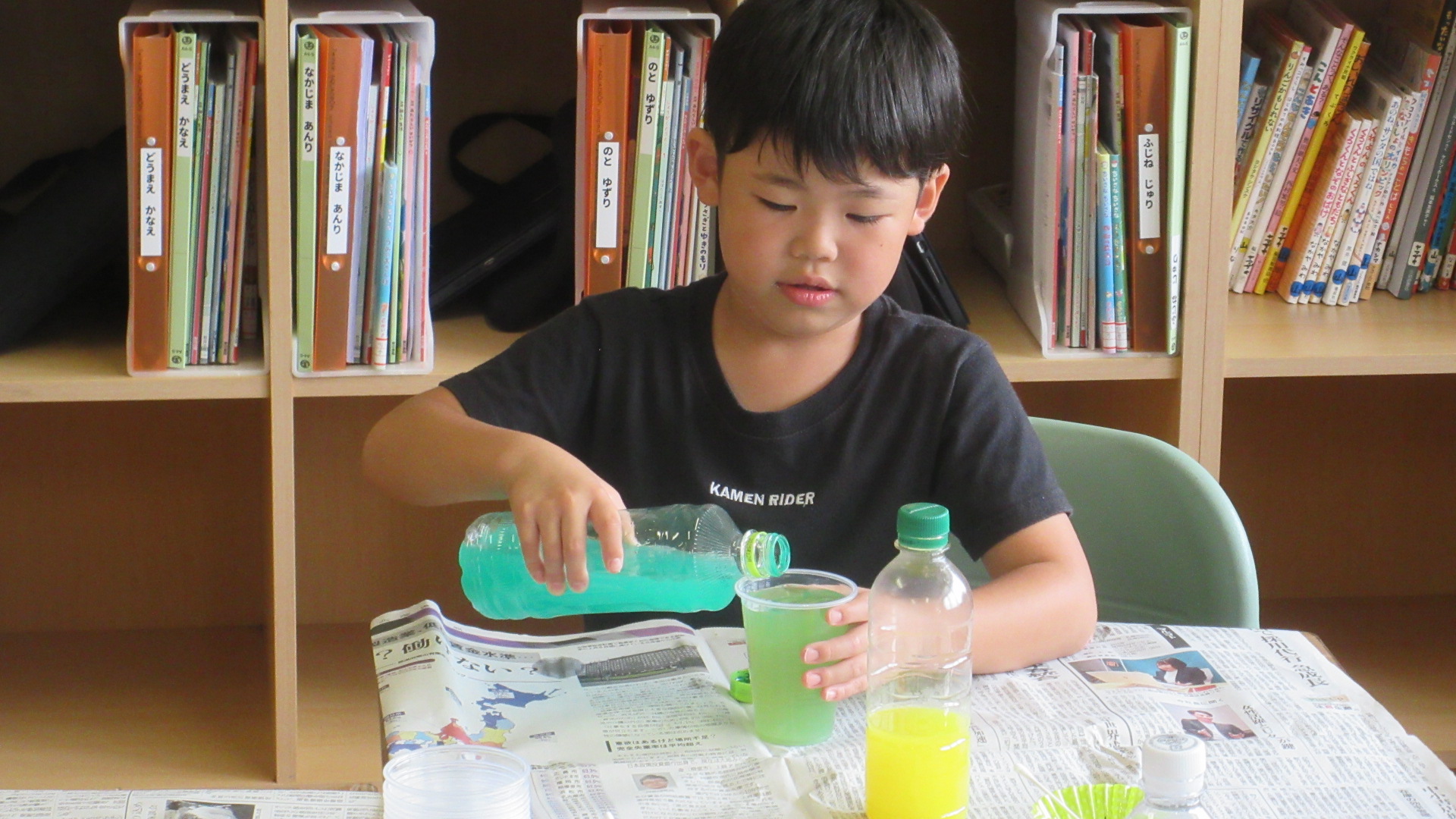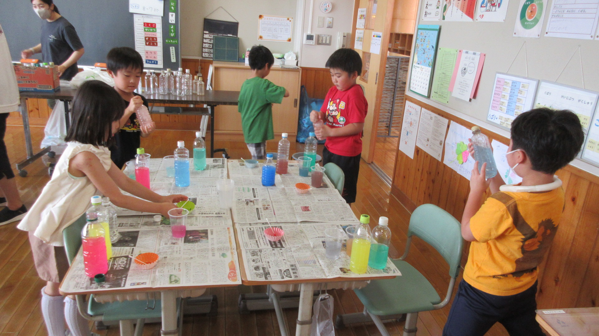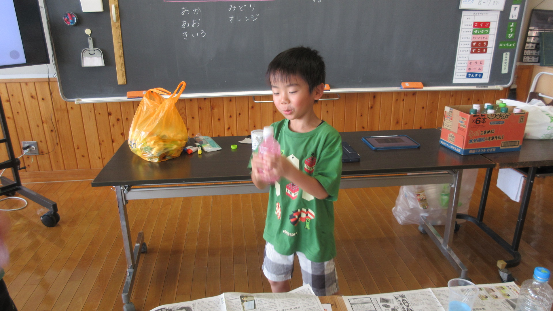 1年生の教室でにぎやかな声が響き渡っていました。のぞいてみると、机の上いっぱいにカラフルな色が水が入ったペットボトルがたくさん並んでいました。