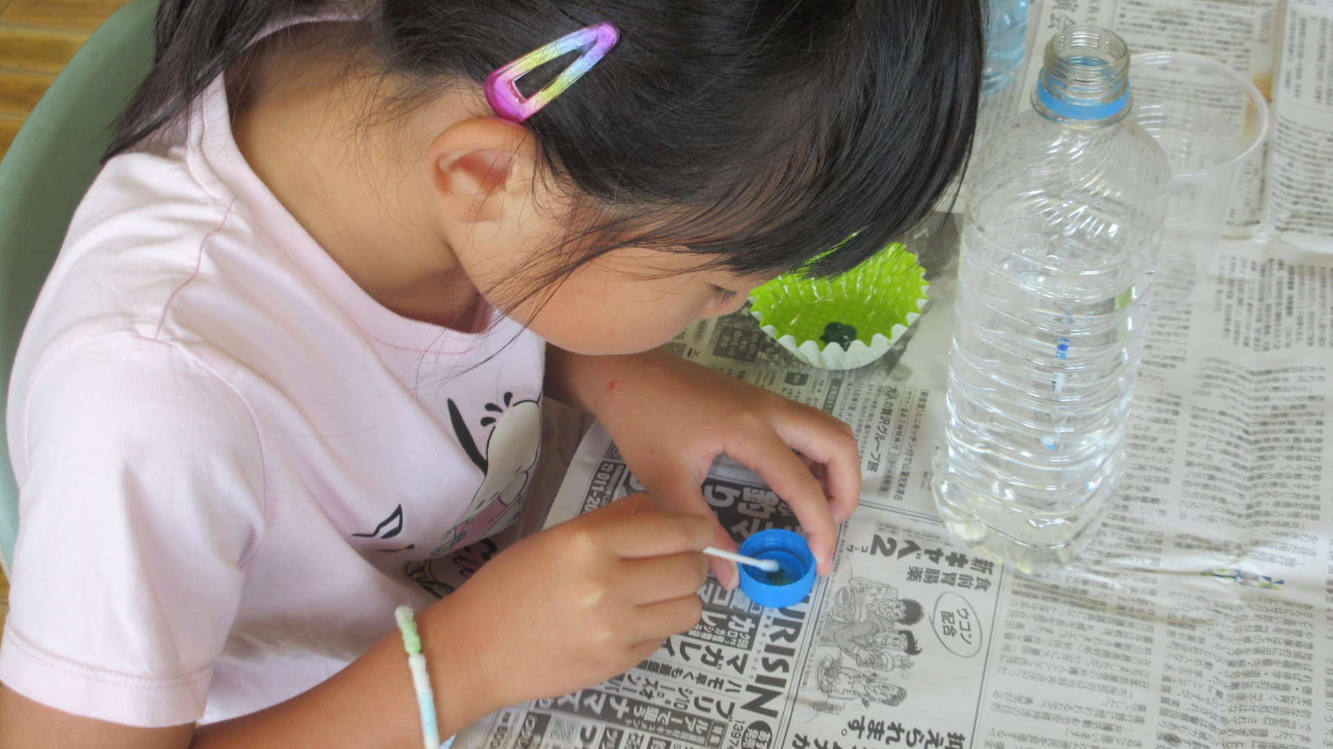 子ども達の様子を見て見ると、なにやらペットボトルのキャップに綿棒で絵の具を付けていました。「私、緑にする。」「ぼくは青だ。」