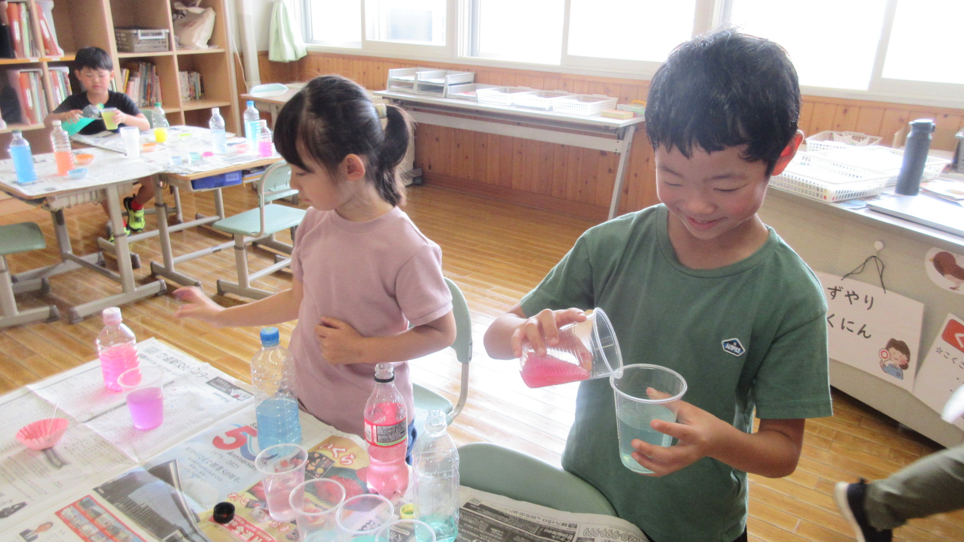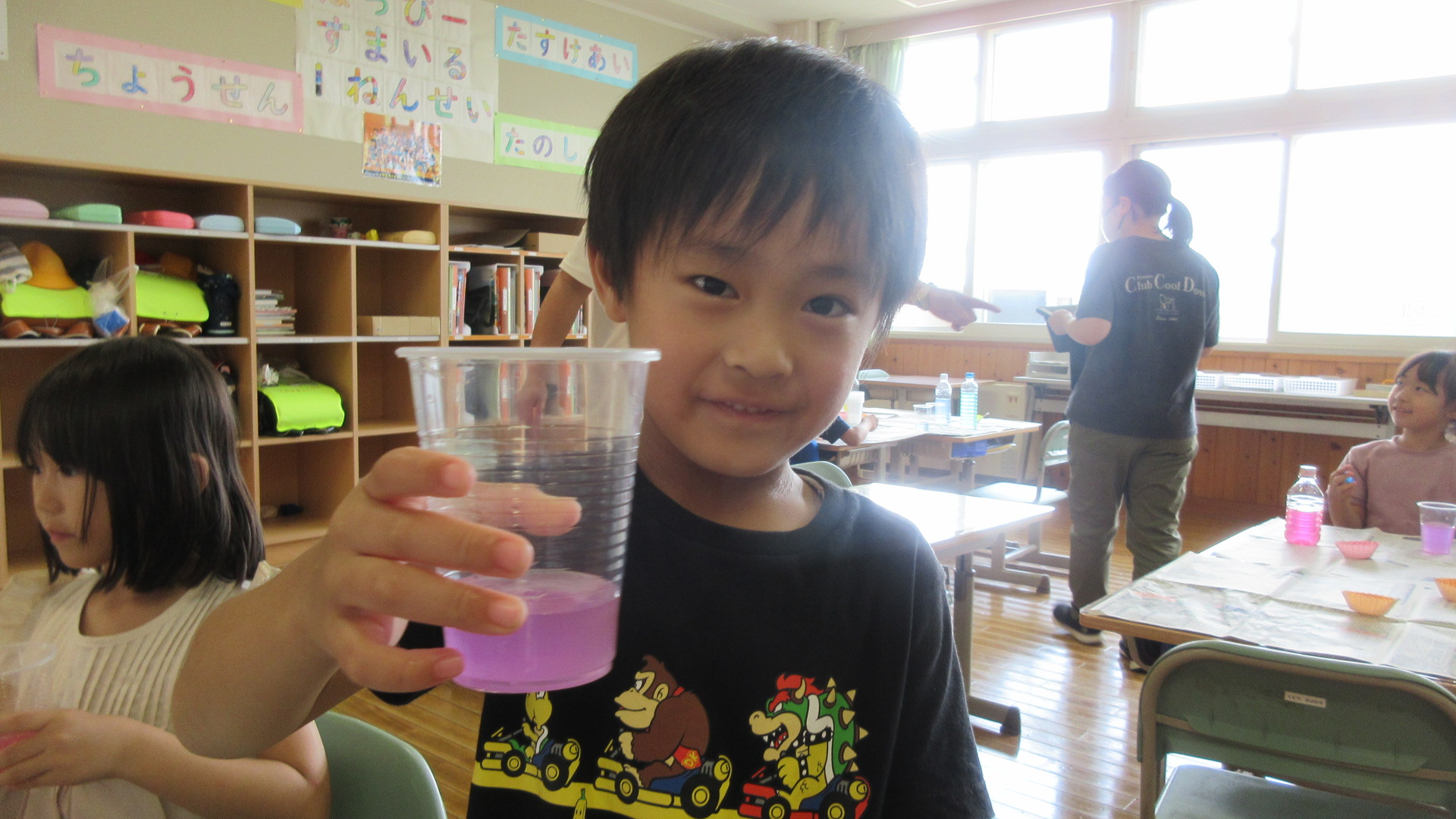 また他の子は、「ぼくは、むらさき色の水を作ったよ!」と教えてくれました。楽しい楽しい図工でした。家でも、親子でやってみると楽しいですよ。