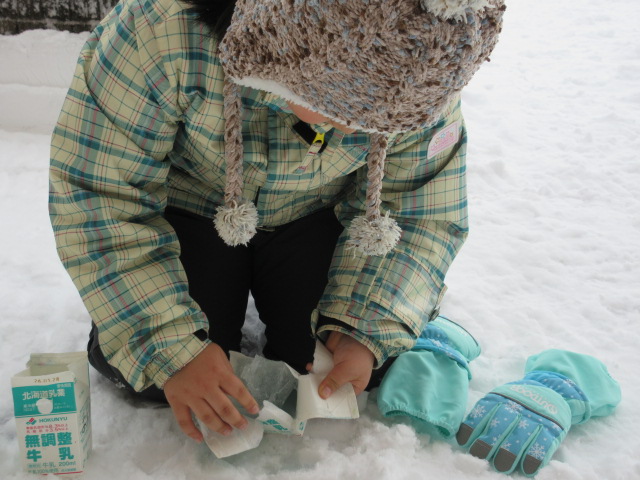 牛乳パックに作ったカラフルブロックを1つ1つ取り出しました。なかには、まだ凍っていないのもありました。(この週末すごく冷え込んだのに???)