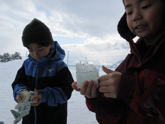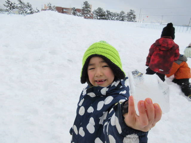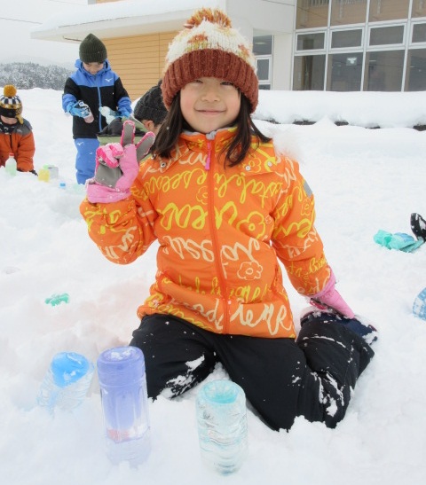 こっちの子も、上手にきれいに並べていました。その後1年生は、グランドの雪山で思う存分雪遊びをしました。