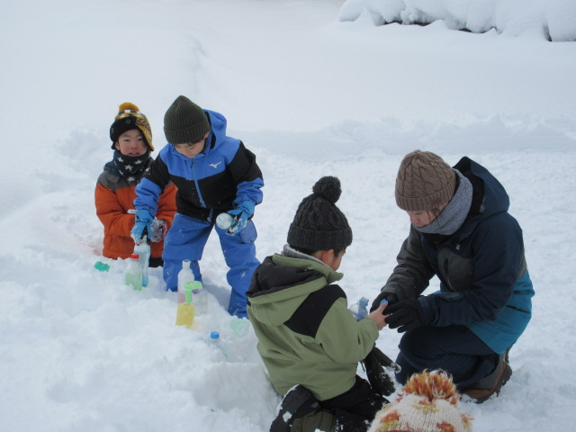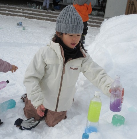 今度は、それを雪の上に並べてみました。余った色水もペットボトルで子お言っていました。