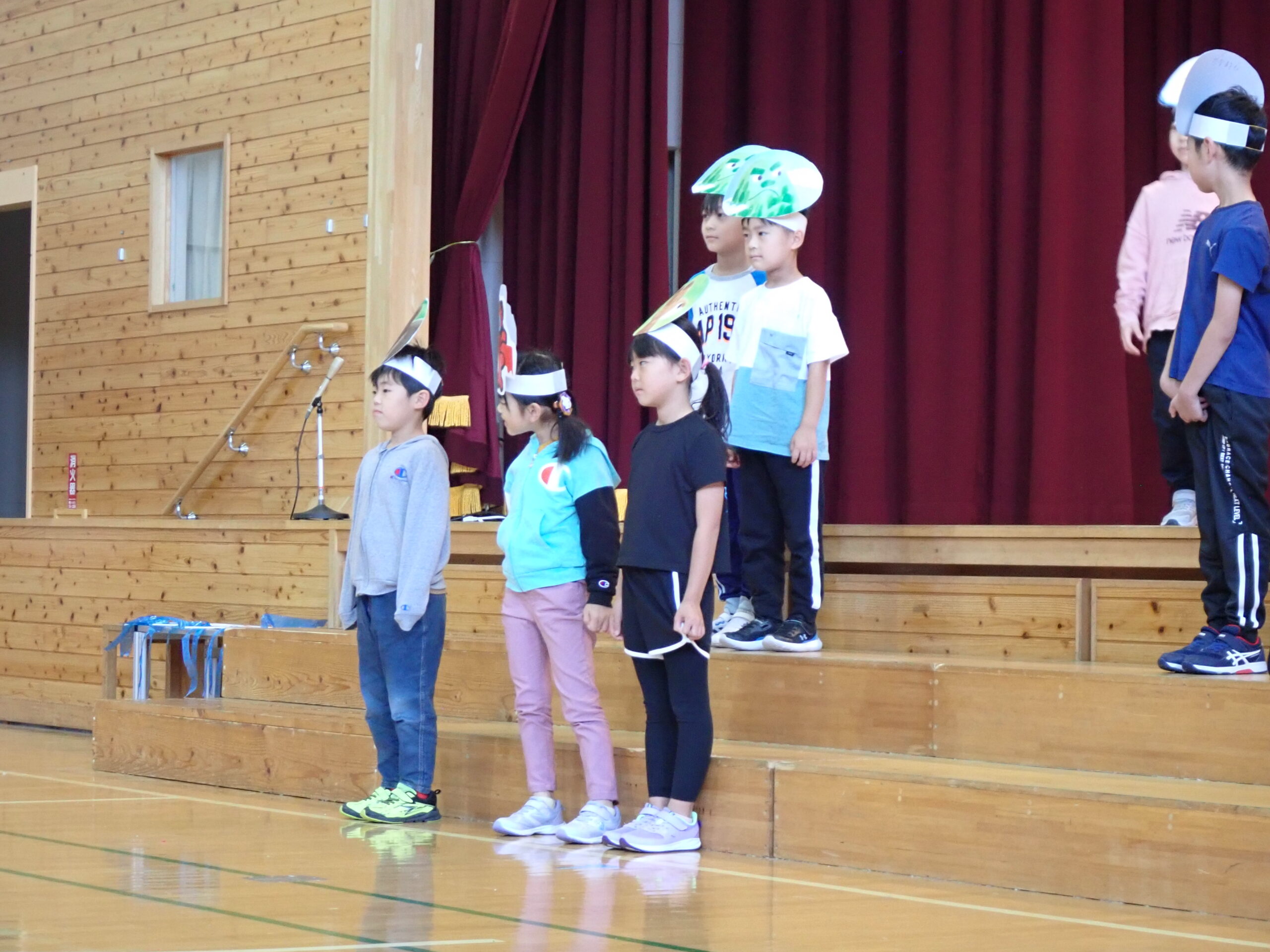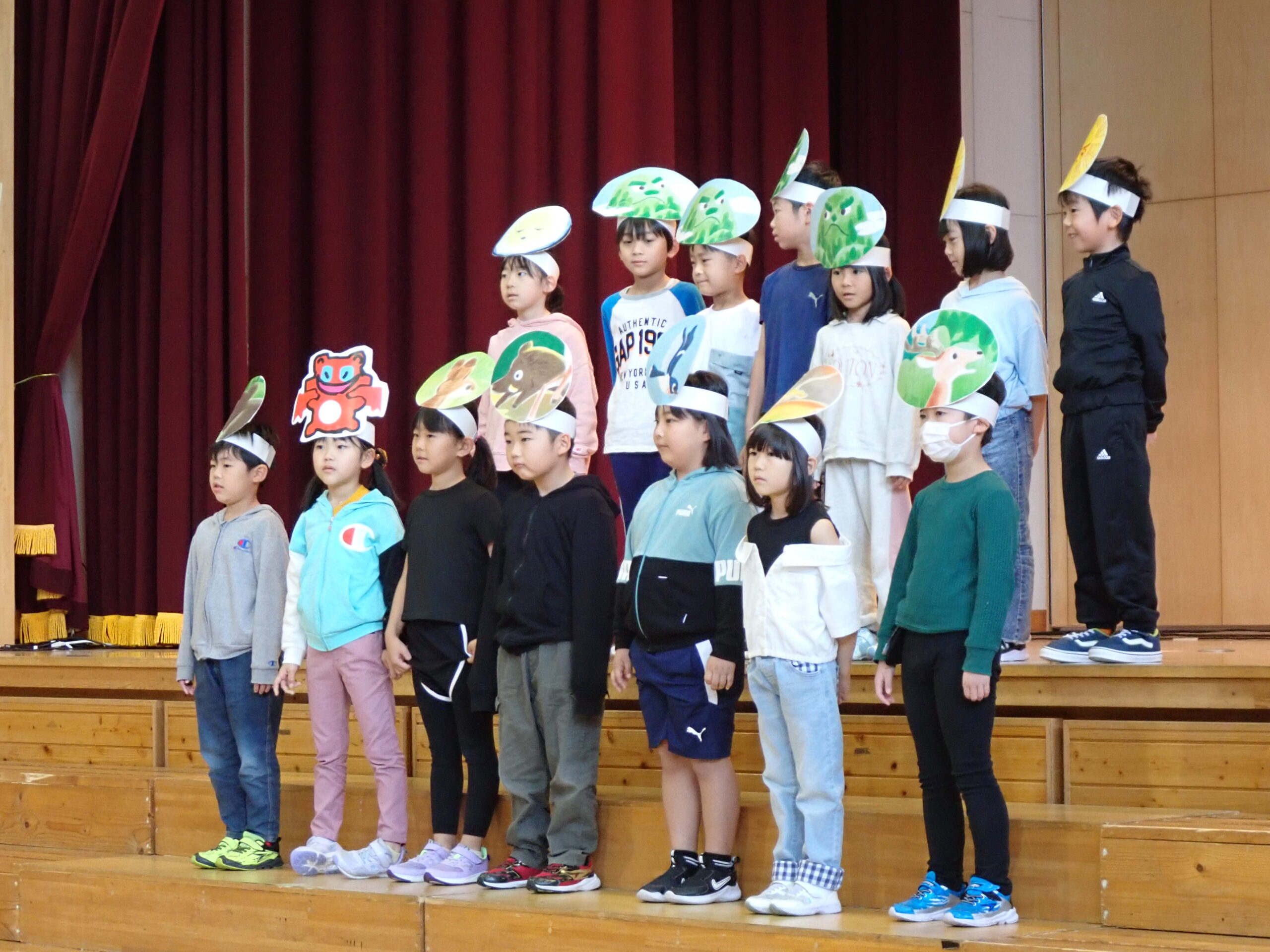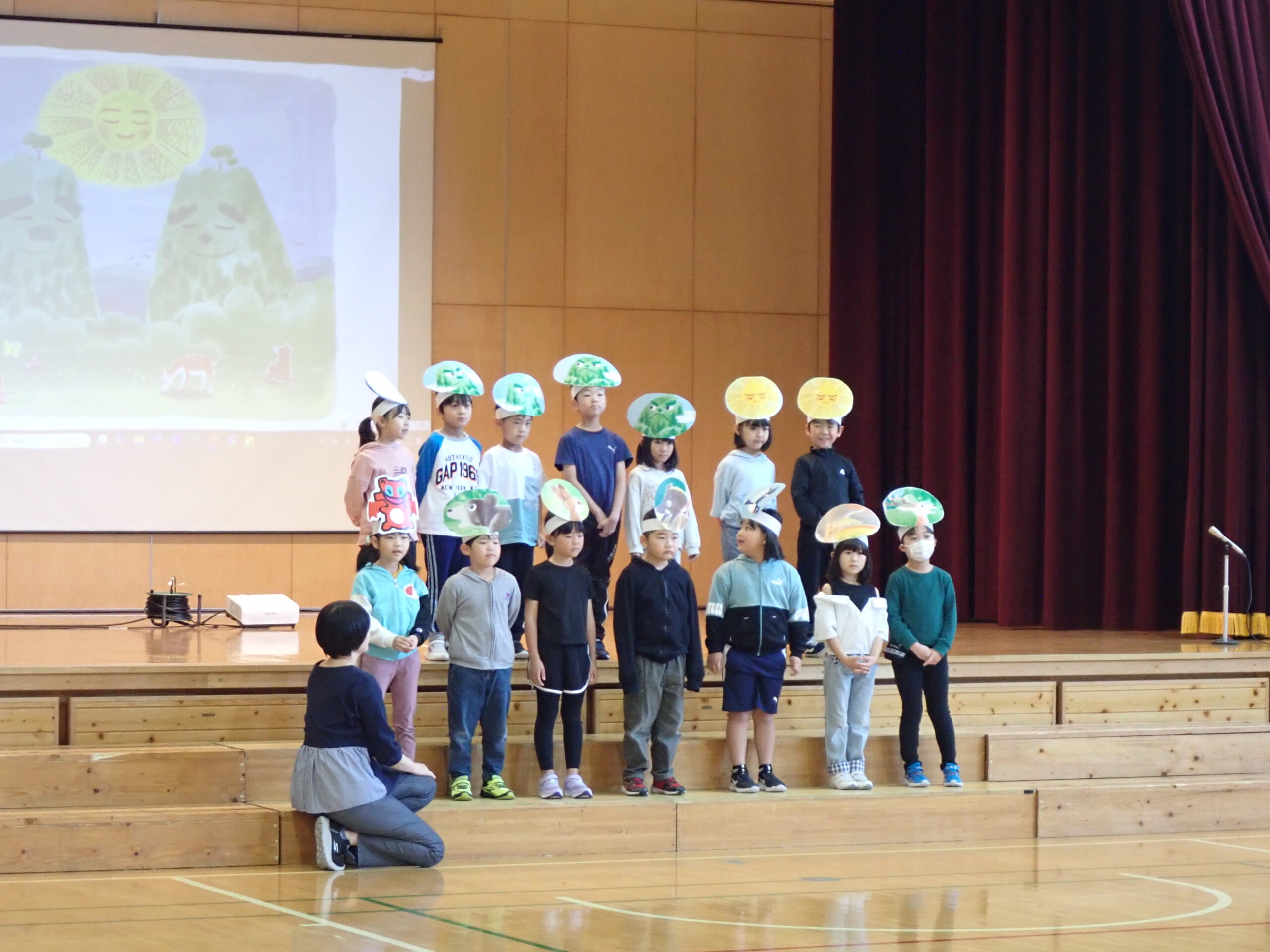初めての学習発表会、1年生は「けんかした山」を音読です。