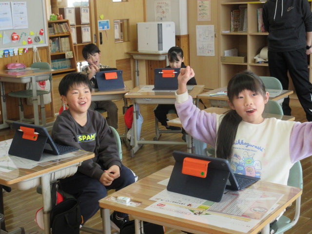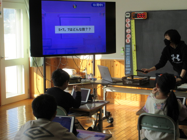 2年生の教室をのぞくと、冬休み中にがんばってきた「九九」について、カフートで振り返りをしていました。(「カフート」は、アプリ名です)