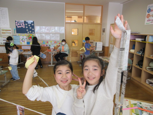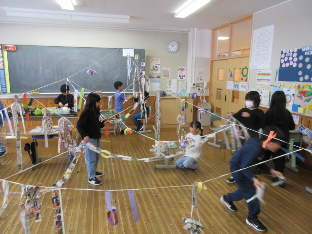 2年生が図工で「つないで、つるして」の学習をしていました。教室に行くと、まるでくもの巣がはりめぐらされたような空間でびっくり。