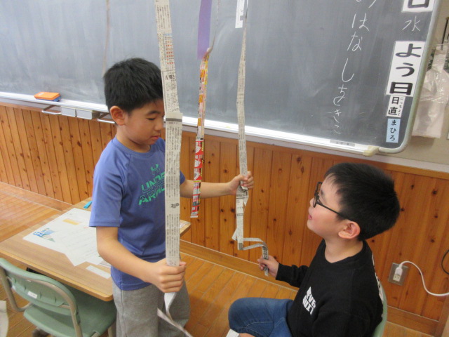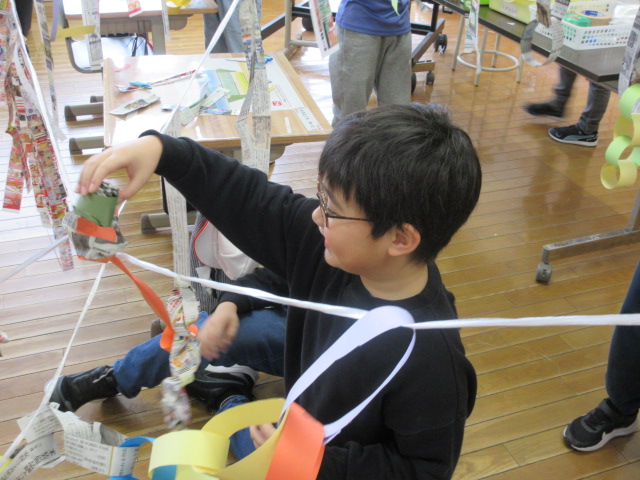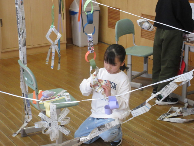 新聞を補足してつるしてみたいり、輪かざりをつるしてみたりと、みんあ思い思いの飾りをつるしていました。