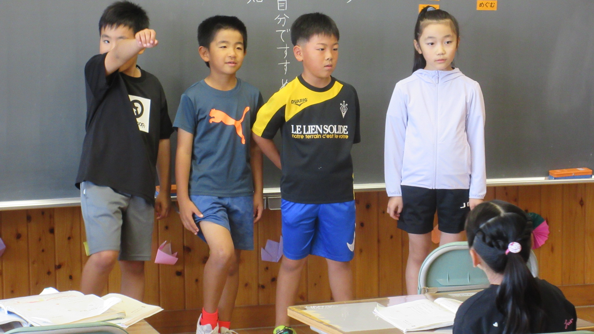 2年生が国語で、教科書にある「てんとうむし」の詩をグループ音読する学習をしていました。「言葉の意味を考えながら くふうして音読しよう」をめあてに、身振り手振りも加えながら楽しく発表していました。
