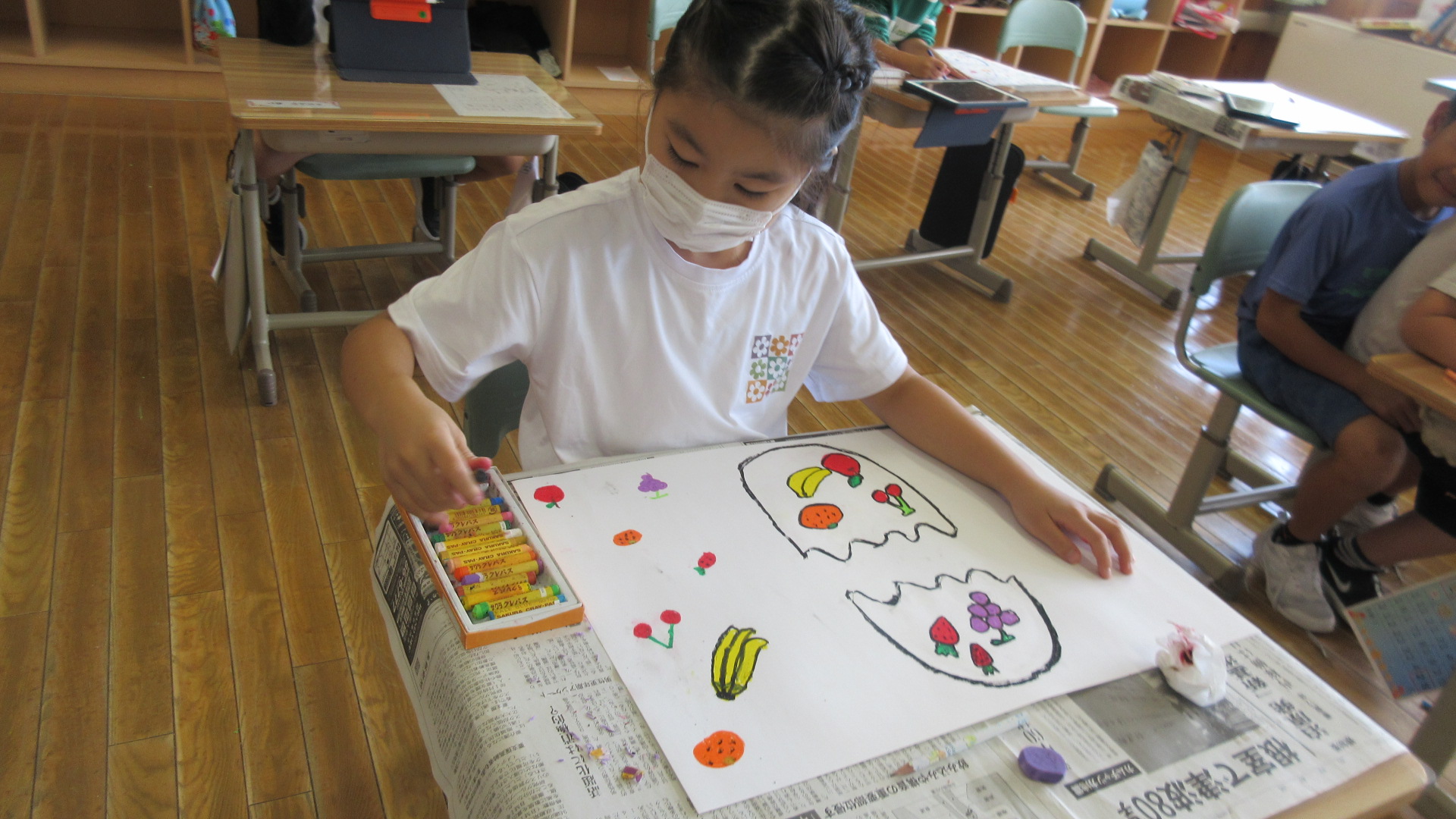 2年生が図工で「ふしぎなタマゴ」を制作していました。自分が考えたタマゴから、いろいろなものが飛び出てくる創造の絵です。