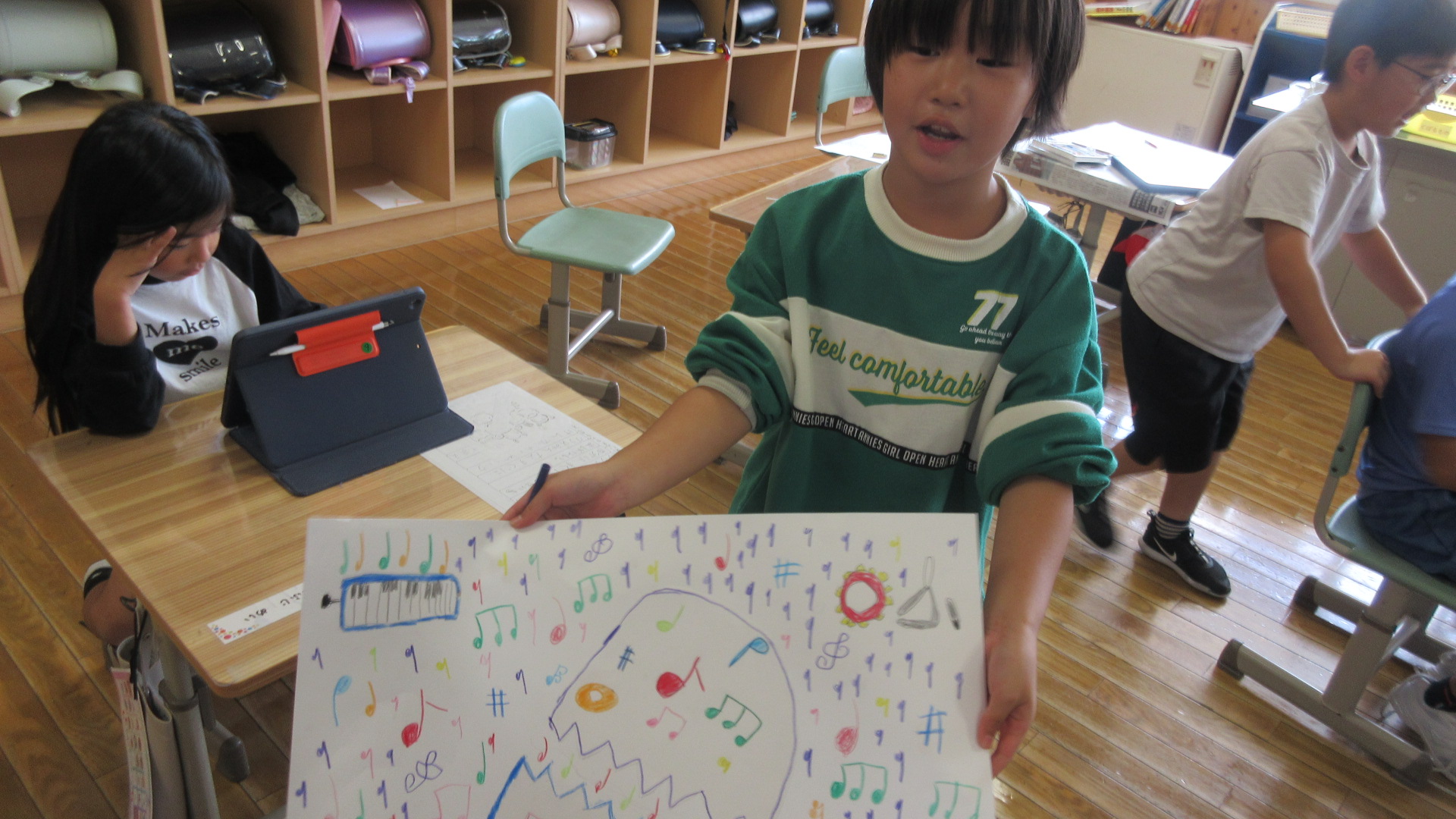 このkは、音符のタマゴから数えきれないぐらいの音符が生まれてくる作品でした。みんなわくわくしながら図工の学習をがんばっていました。