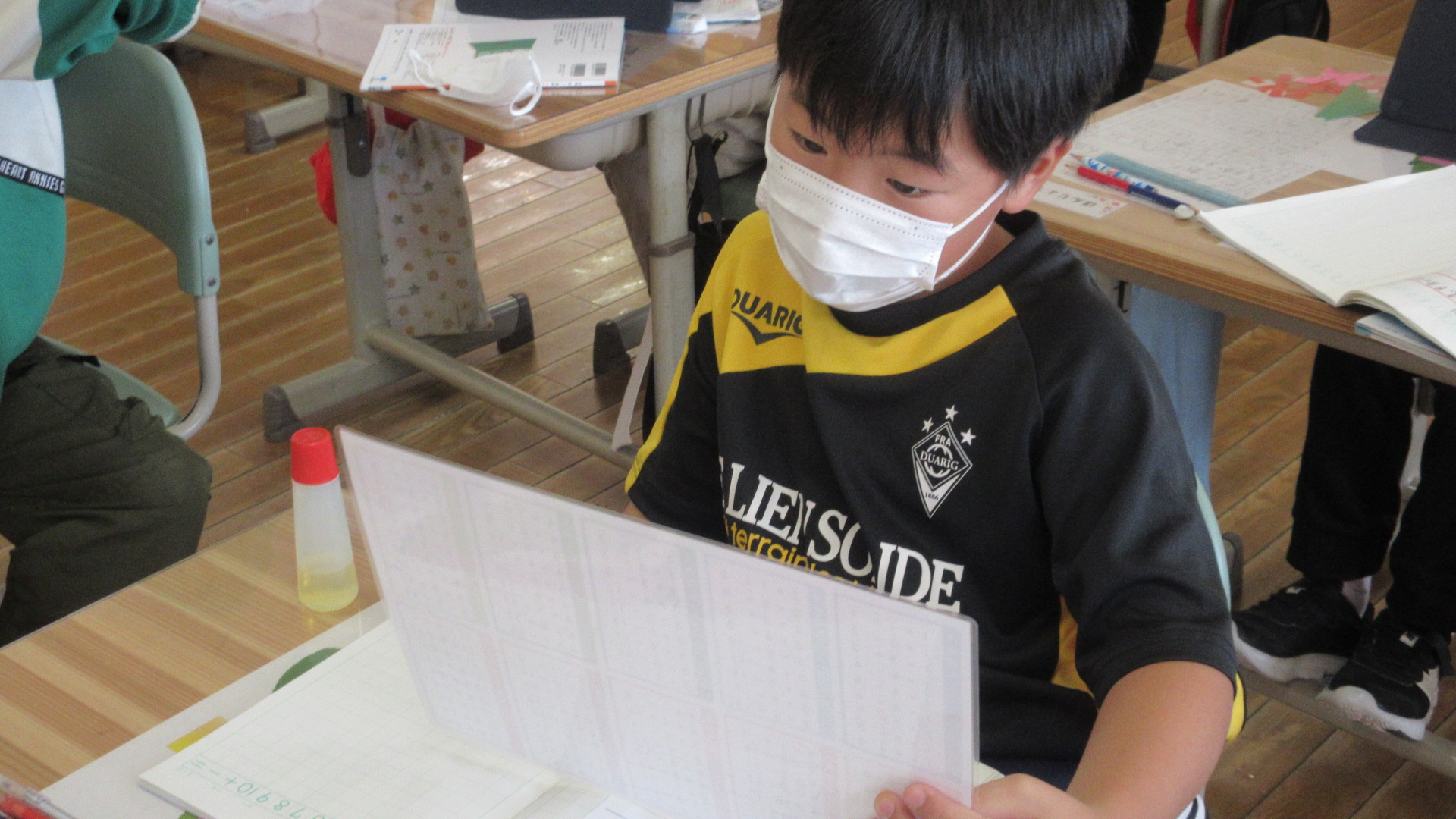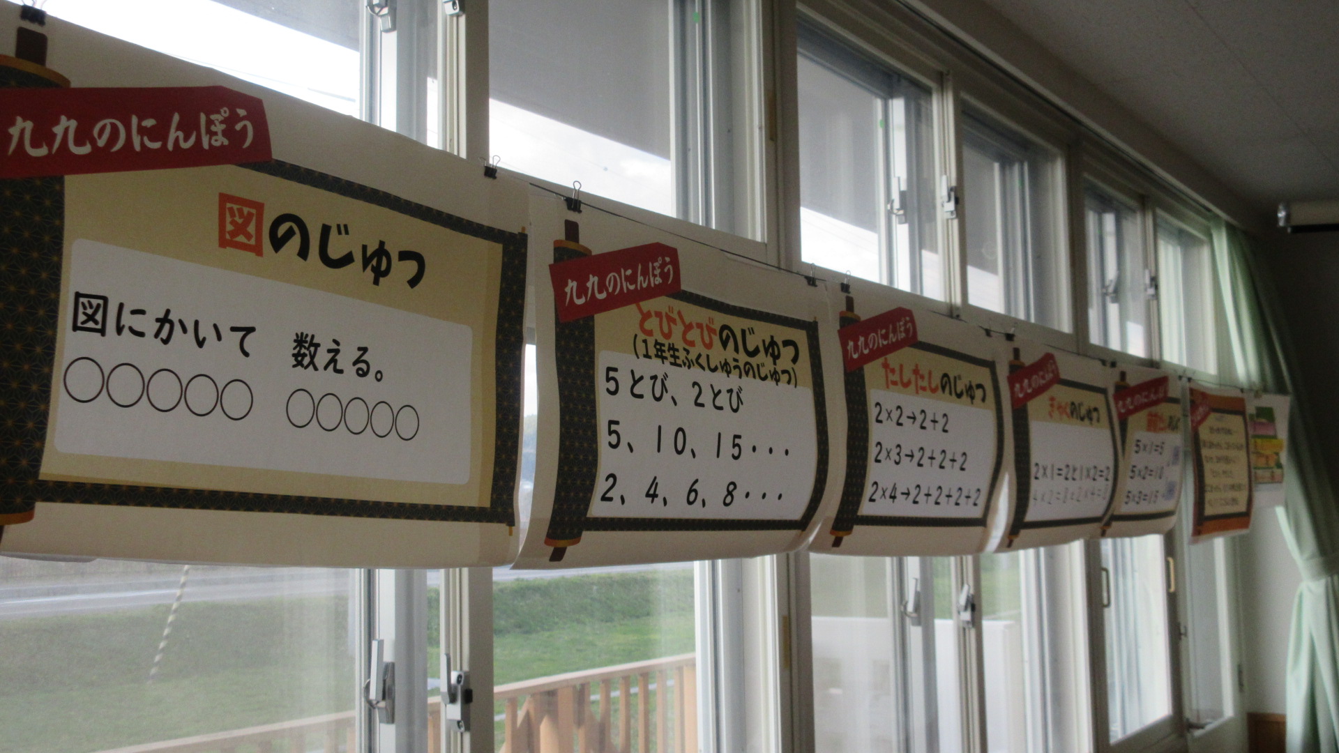 2年生が現在九九を習得中です。ちょうど見に行った時は4の段を学習していました。様々な術(たしたしの術、ぎゃくの術・・・)を使って九九を導き出します。