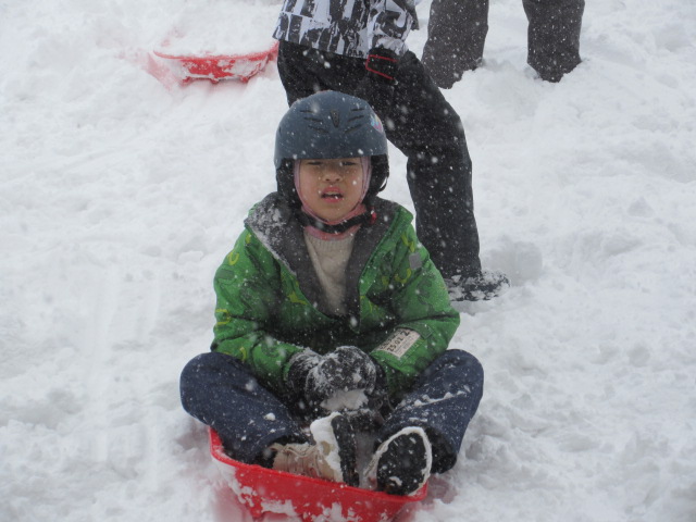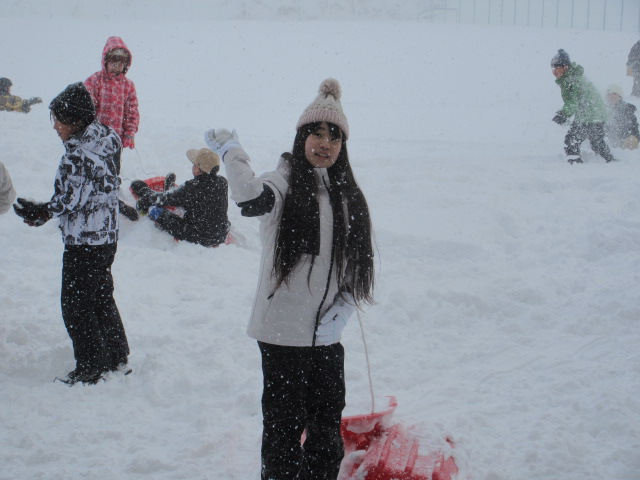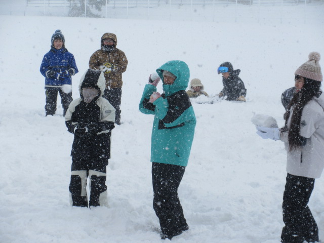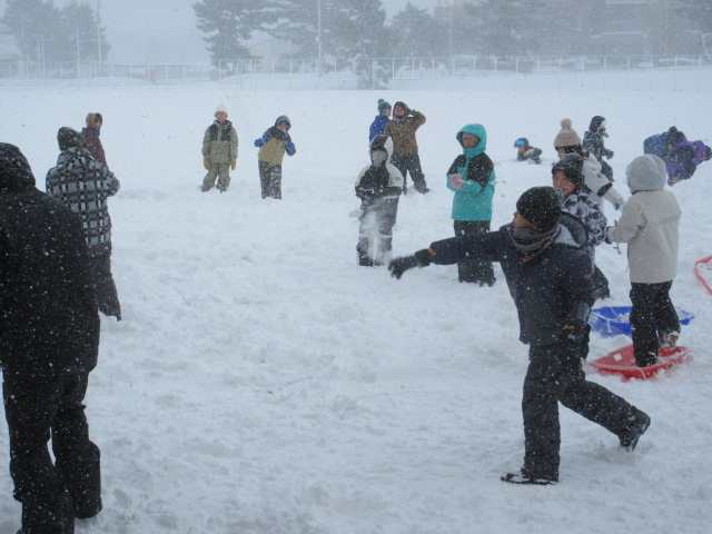 でも、せっかくの機会なので、短い時間ですがグラウンドに出て雪遊びをしました。雪合戦をしたり、そり滑りしたり、思い思い楽しんでいました。