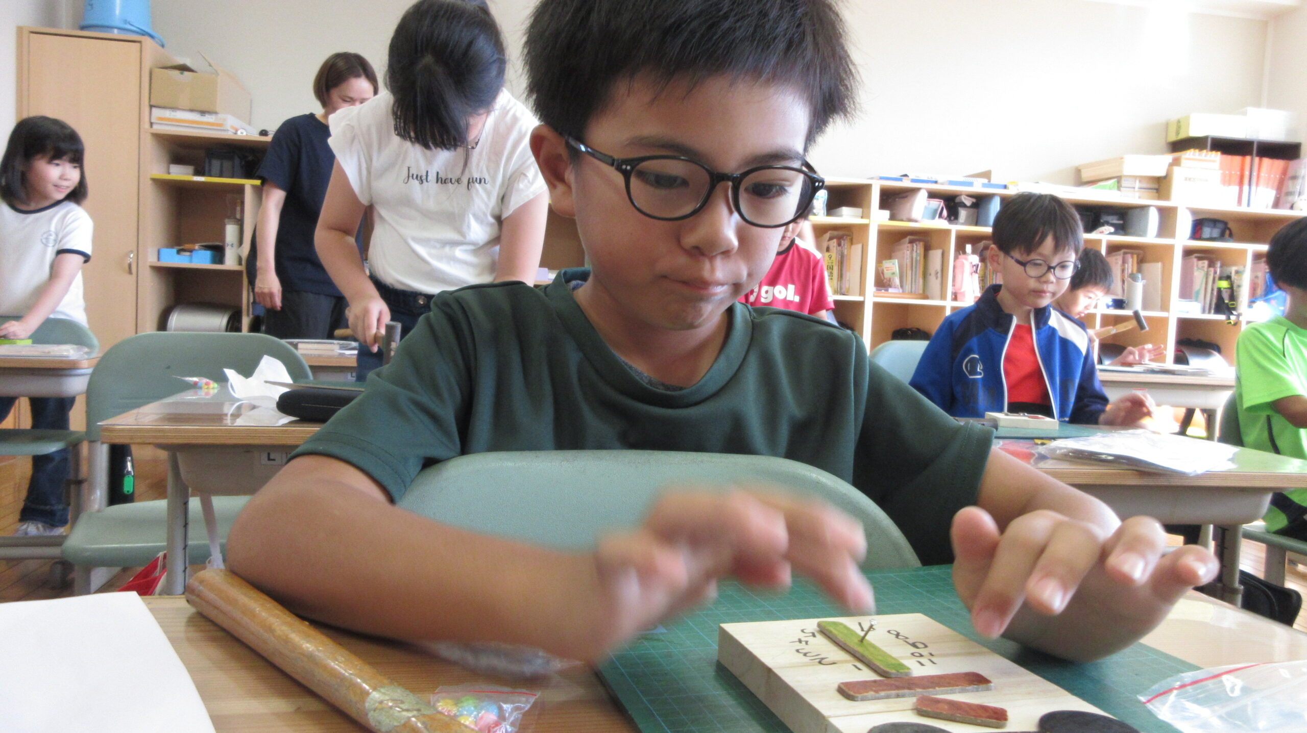 3年生が図工で「くぎうちトントン」の学習をしています。