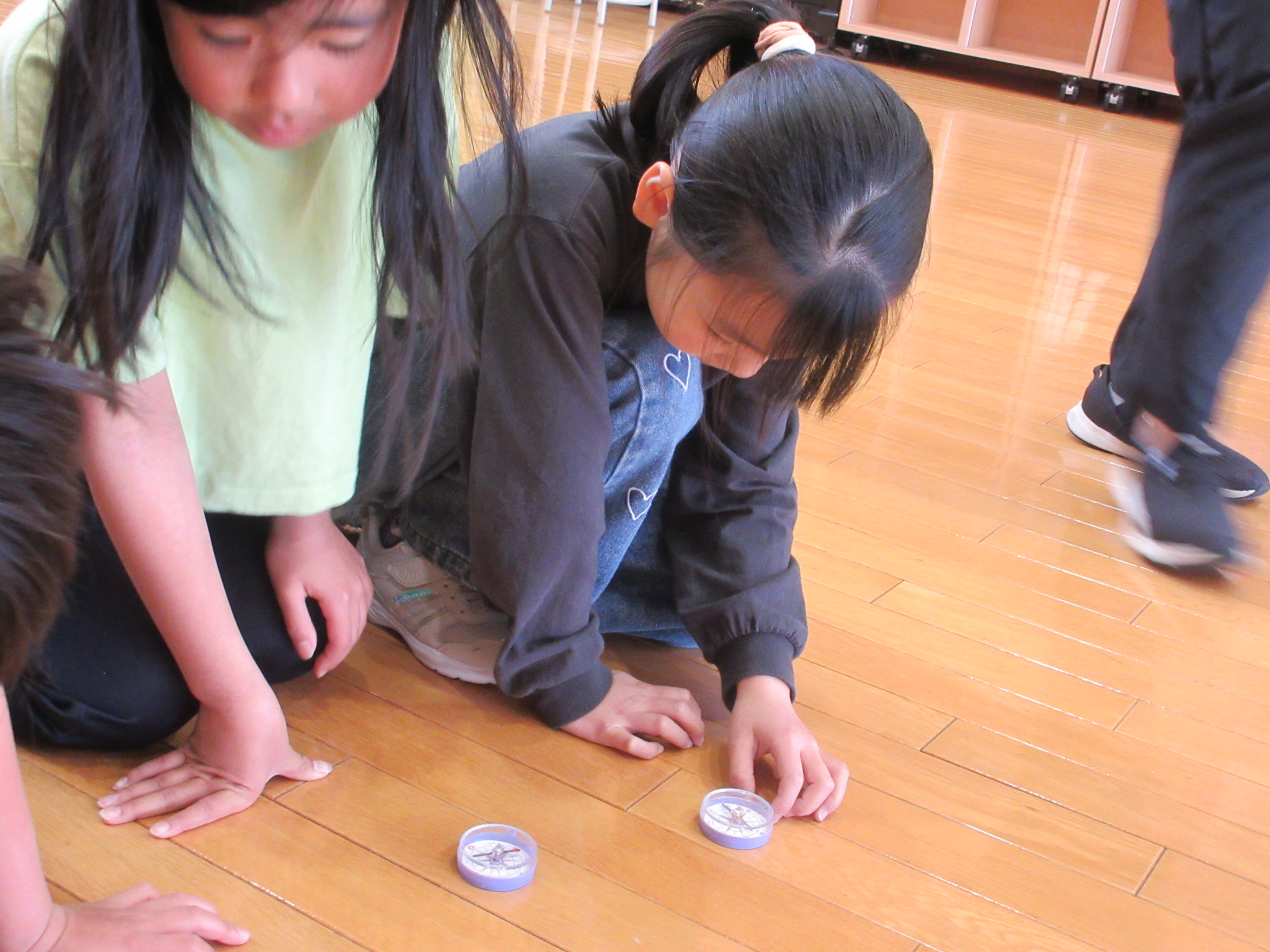 3年生一人一人、方位磁針をもって方角について調べました。「北はこっち!」と指をさして方角を確かめていました。真剣に方位磁針を見つめる姿がなんともよかったです。