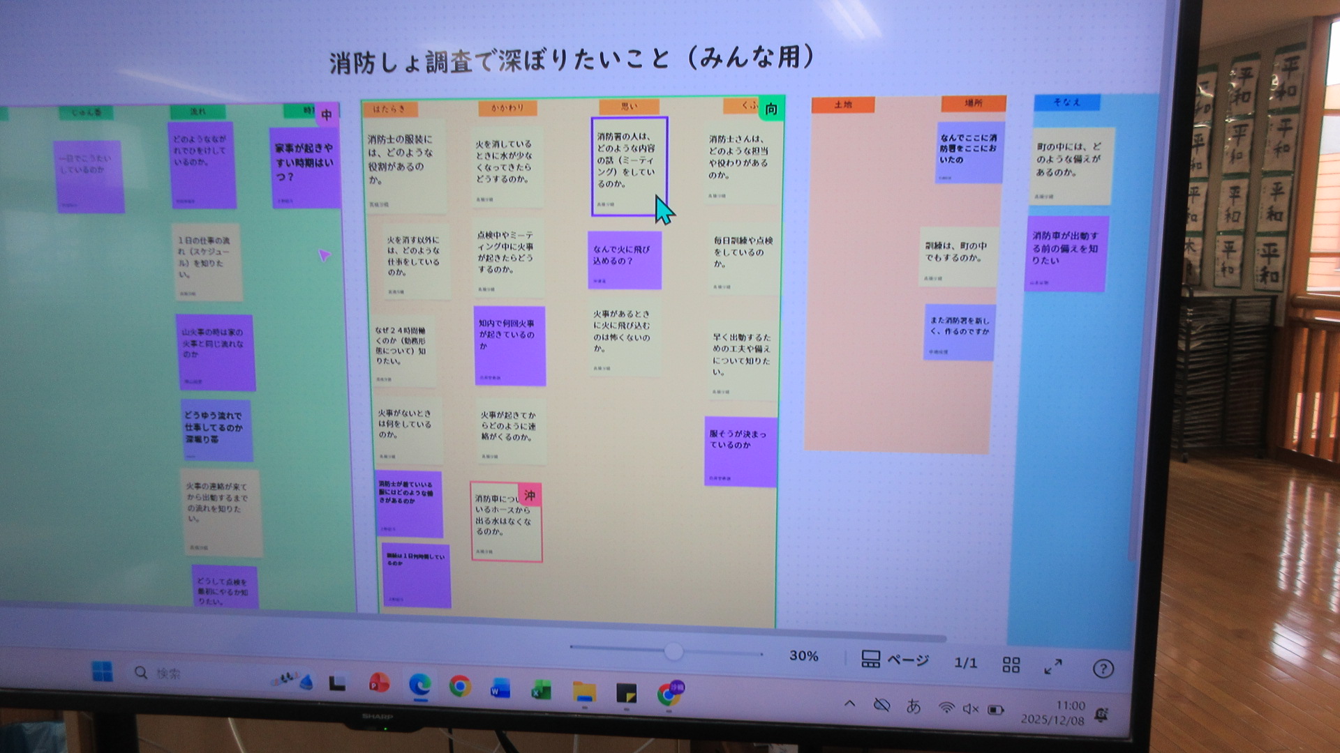 3年生は、社会「安全なくらしとまちづくり」の学習で、知内消防署を見学に行きました。人々の安全を守るための消防署のはたらきや、そこで仕事をしている人々の工夫や努力を調べてきました。事前学習では、消防署調査で深掘りしたいことを端末を使ってみんなでまとめました。