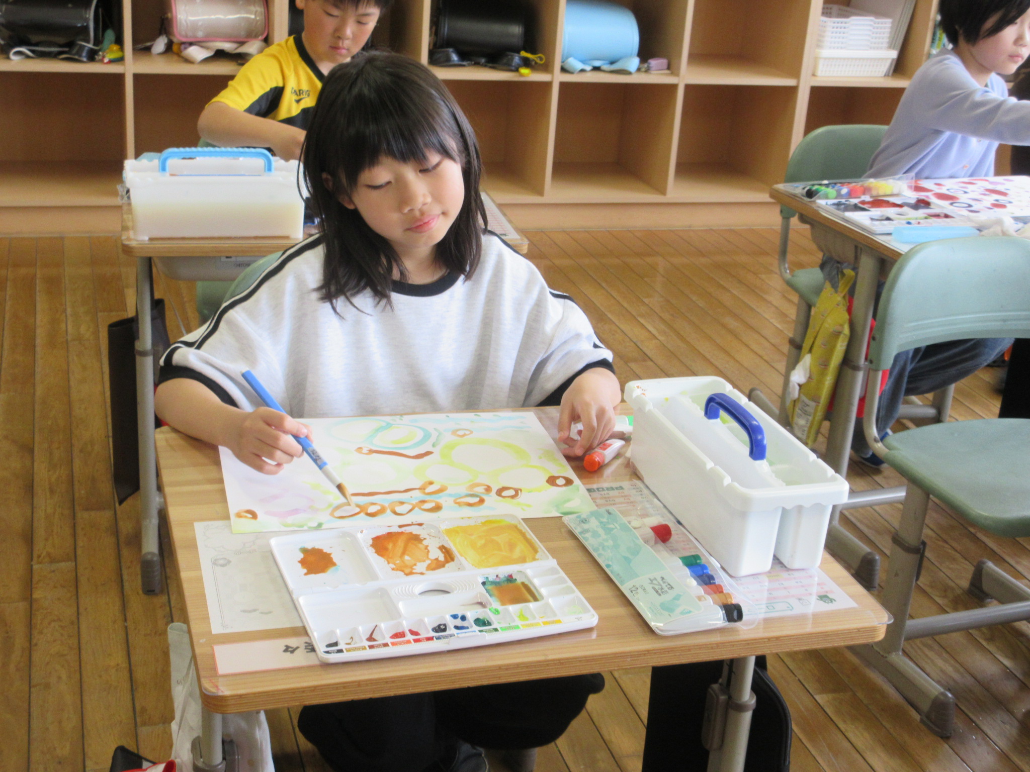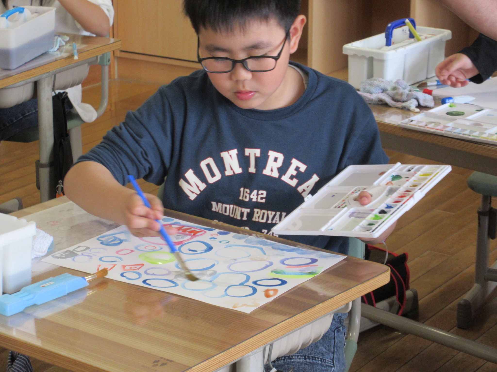 3年生は、混ぜる色でたくさんの色が作ったり、水の量を変えてみたりと、試行錯誤しながら画用紙いっぱいに模様をかいていました。