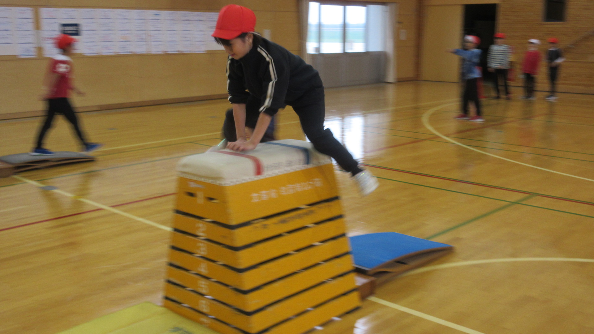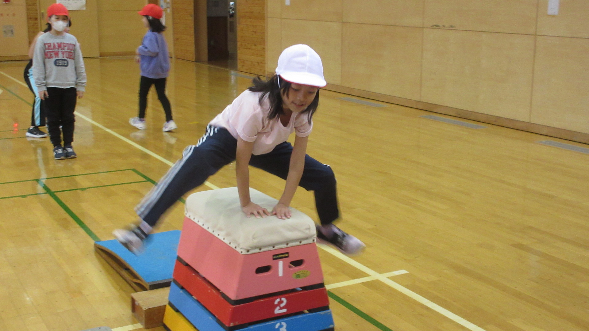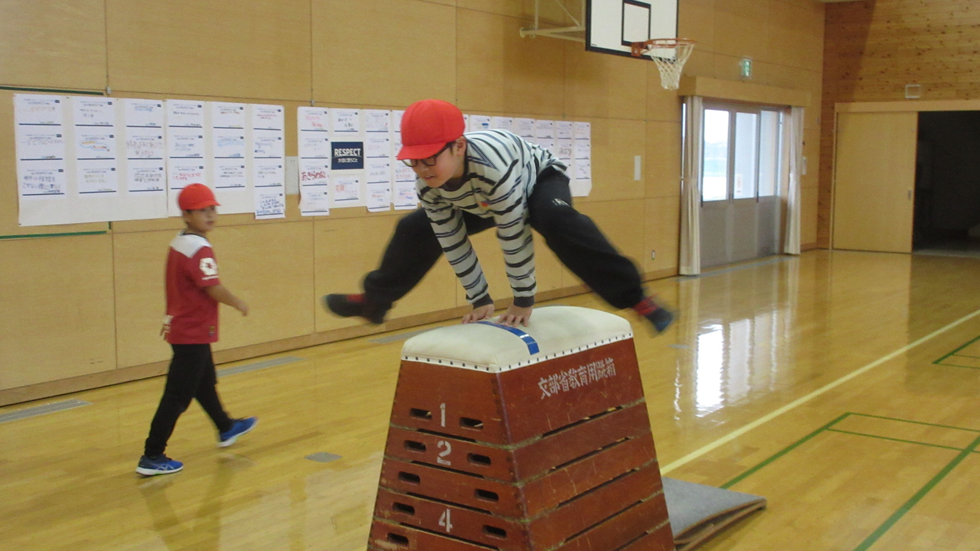 今、体育では器械運動「跳び箱」を全学年で学習しています。3年生の跳び箱の学習の様子です。子なる段数から、自分でチャレンジする跳び箱を決めて練習しています。やる気満々の3年生でした。