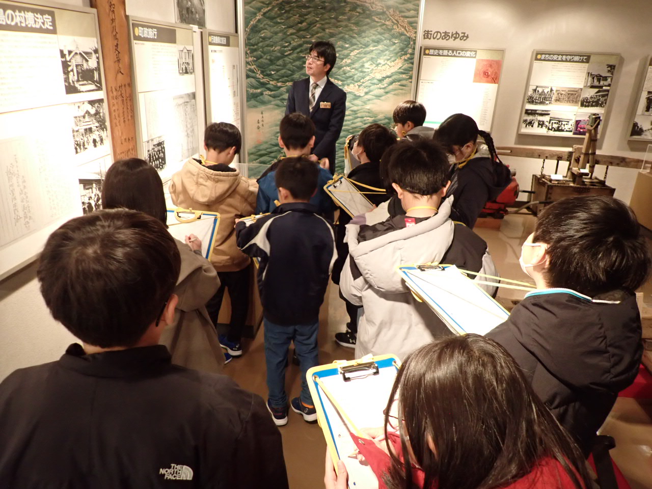 この写真は、ちょうど知内町への町制への移行について説明を聞いているところです。みんな真剣にメモをとっています。