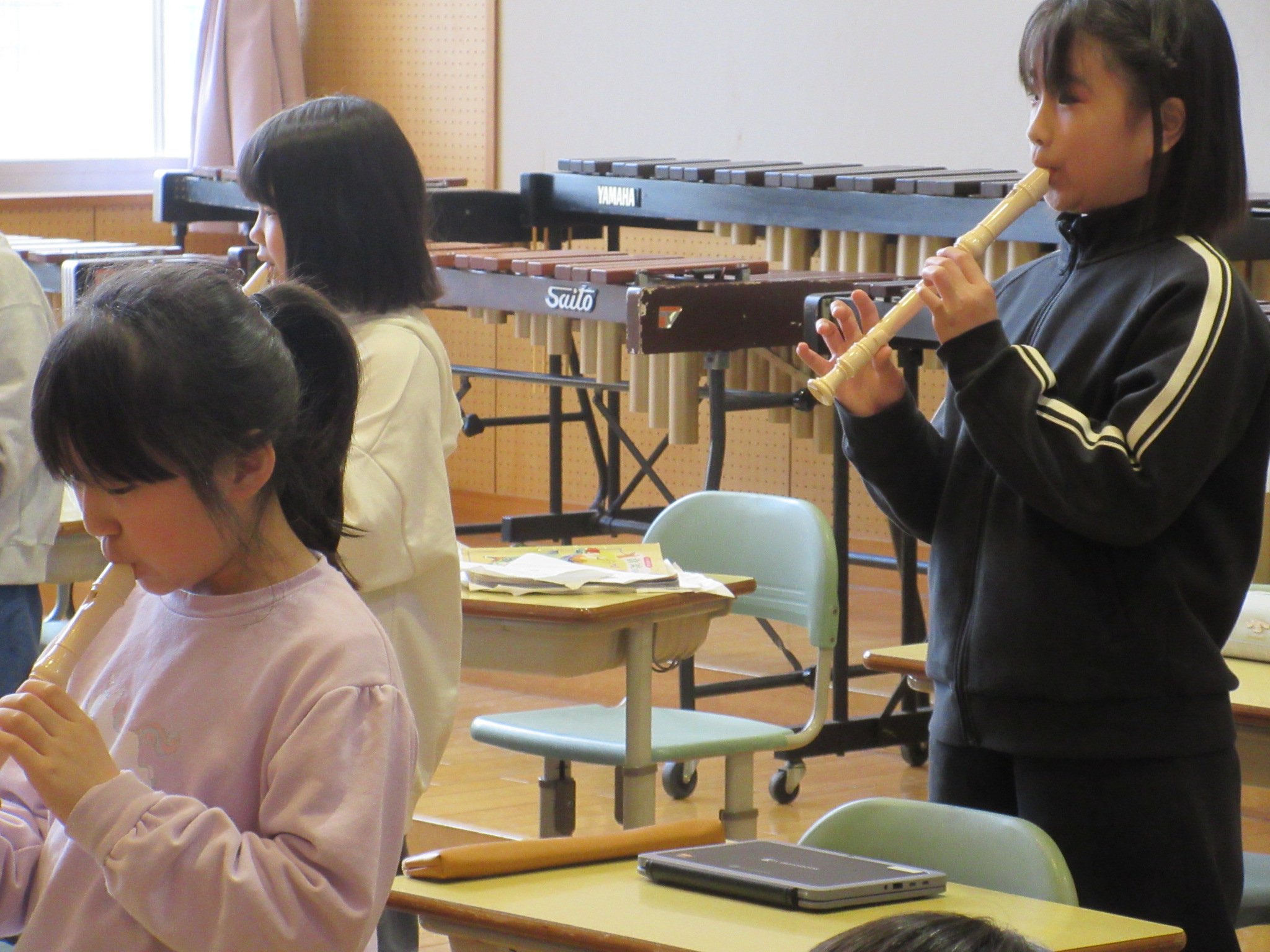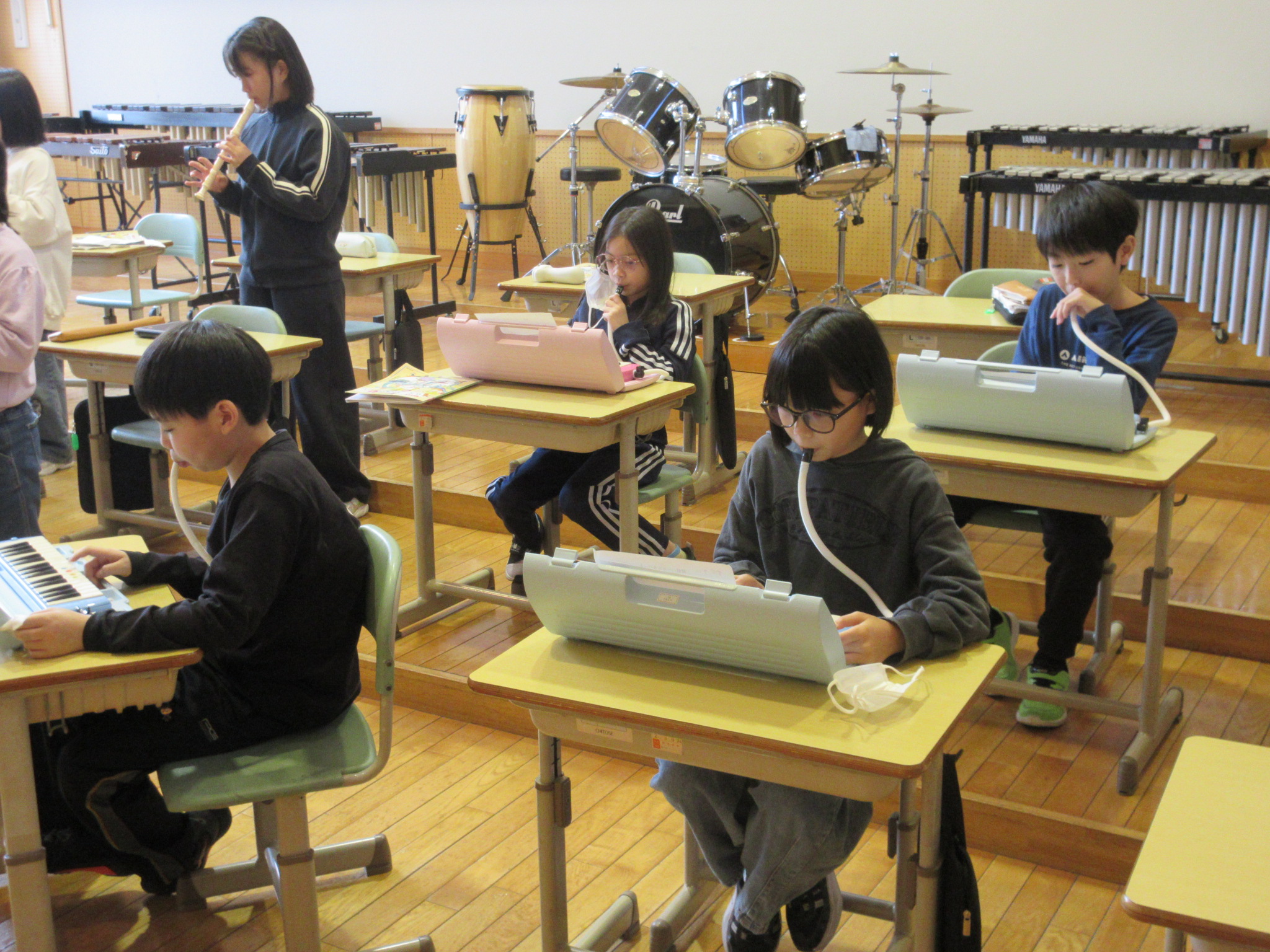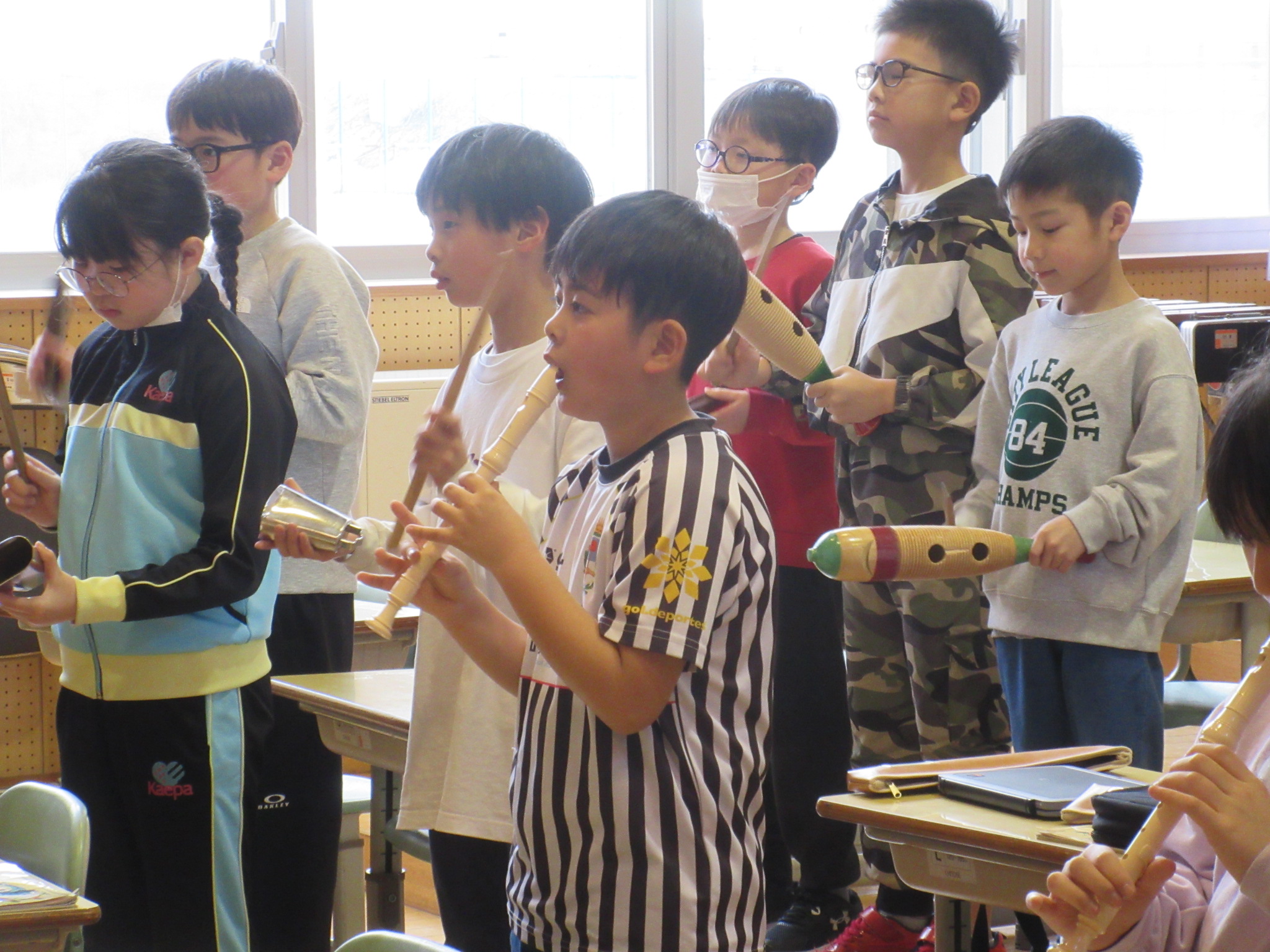 「メロンの気持ち」という曲を、鍵盤ハーモニカ、リコーダー、打楽器で合奏しました。
