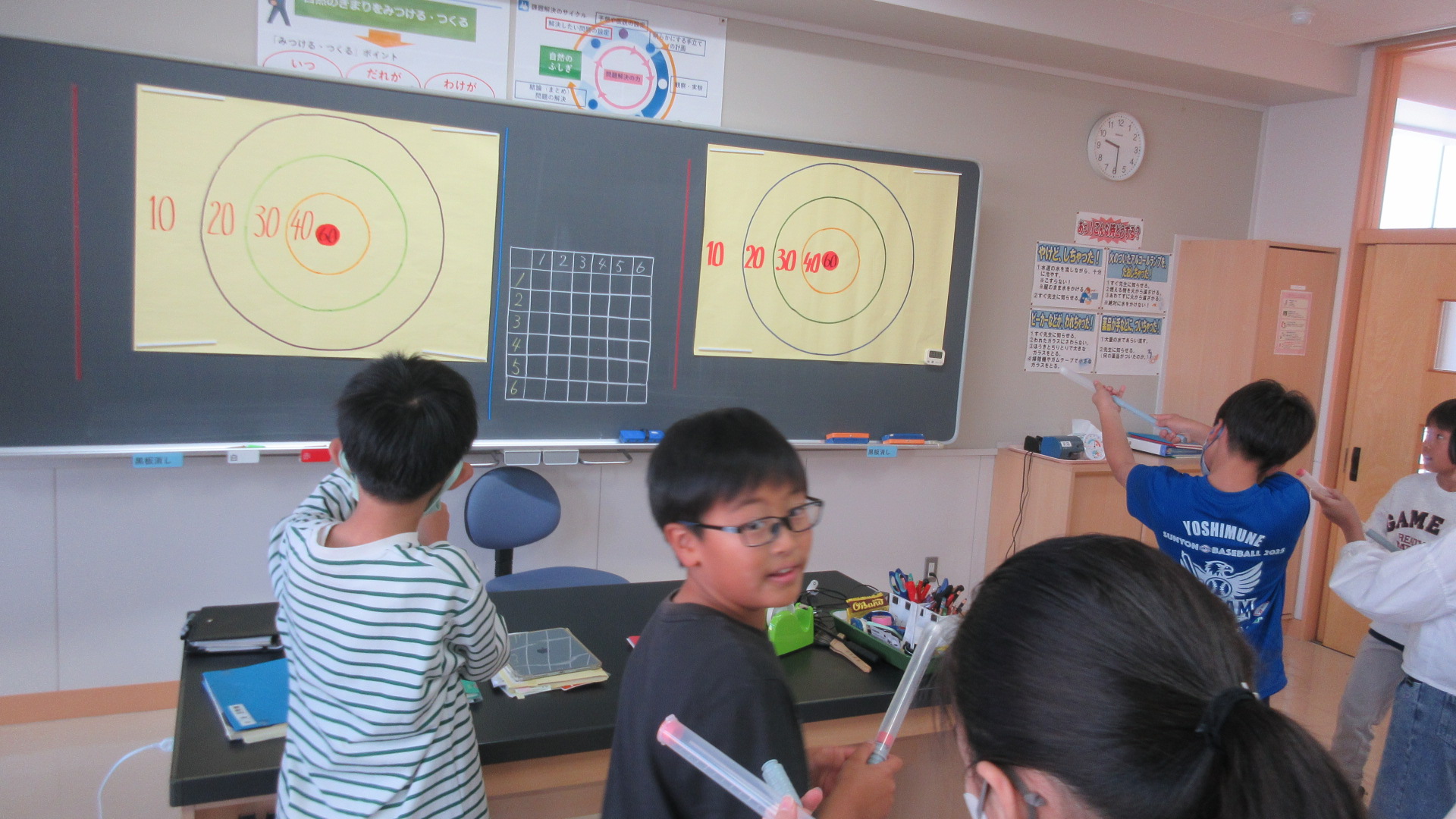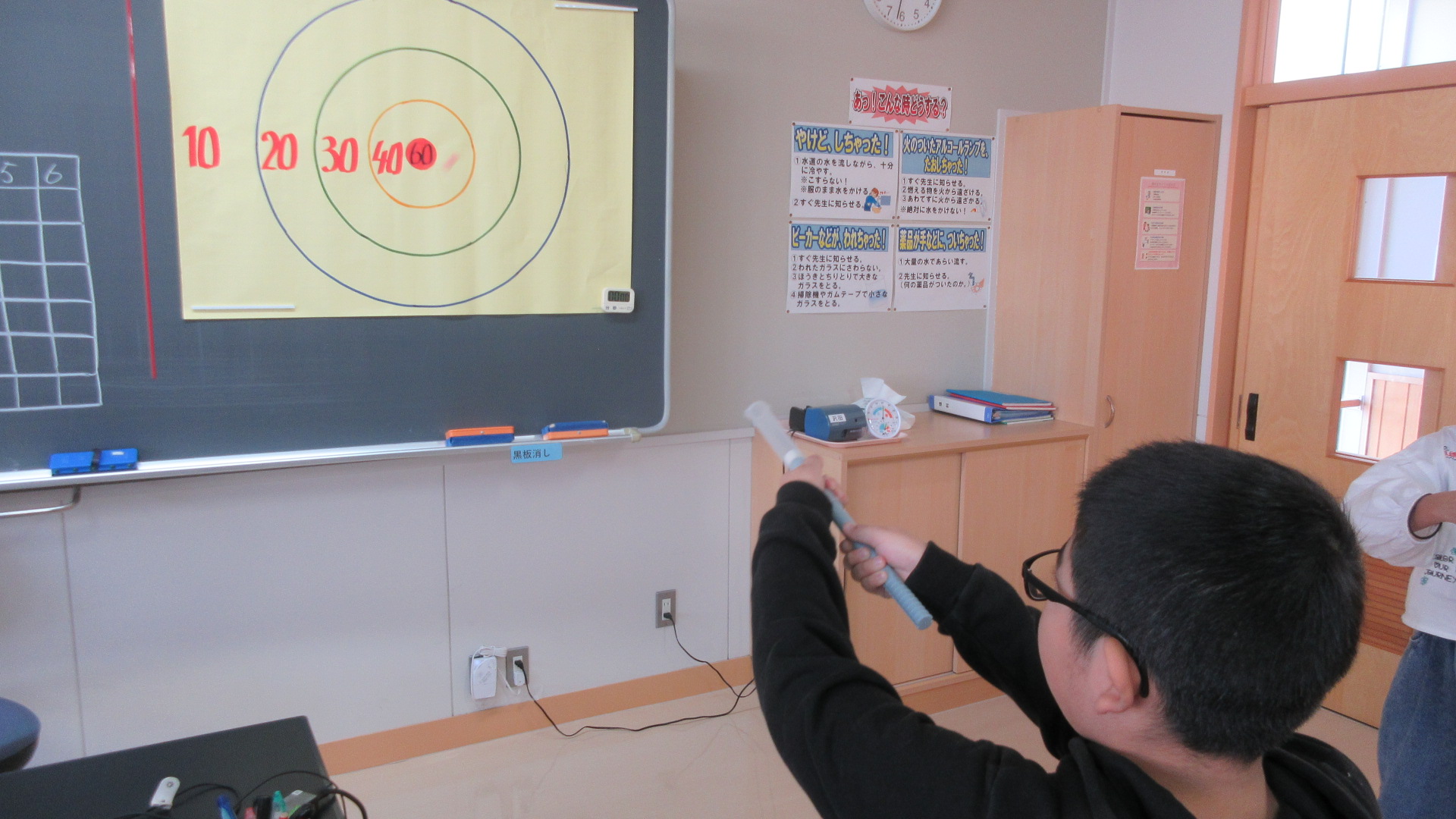 理科の「とじこめた空気と水」の学習でした。とじこめた空気にはどのような働きがあるのかについて、空気でっぽうを使って実験していました。